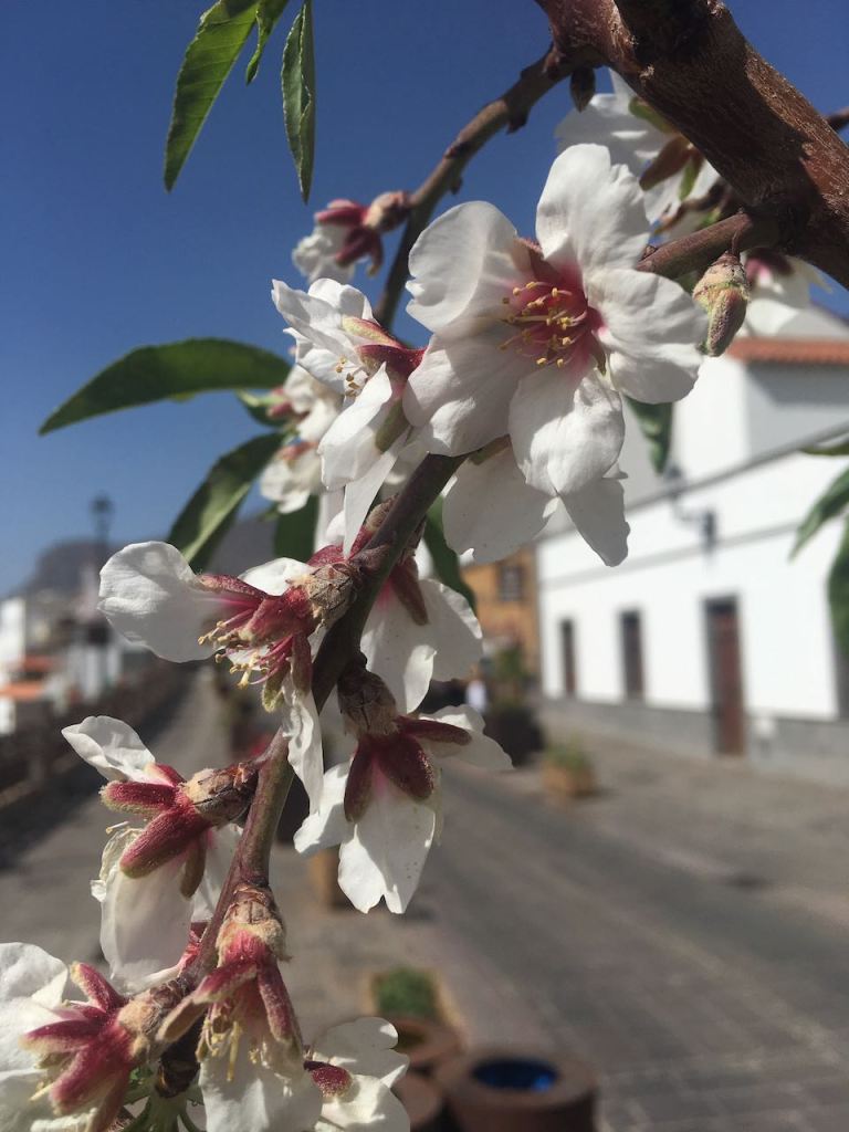 We checked our guide book and decided to visit the little almond town named “Tejeda”, in the central highland of Gran Canaria. A pretty mountain village with delicious (almond) desserts/pastries, a beautiful church and steep and winding streets. We were also hoping to see the almond blossom, but we were – I guess- a week or so too late. A pity, I would have loved to see all the trees in bloom. Though a few blossoms were left which we caught in the pic below.