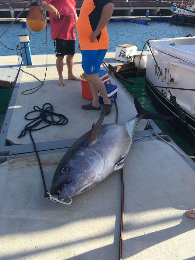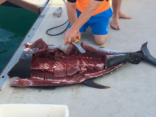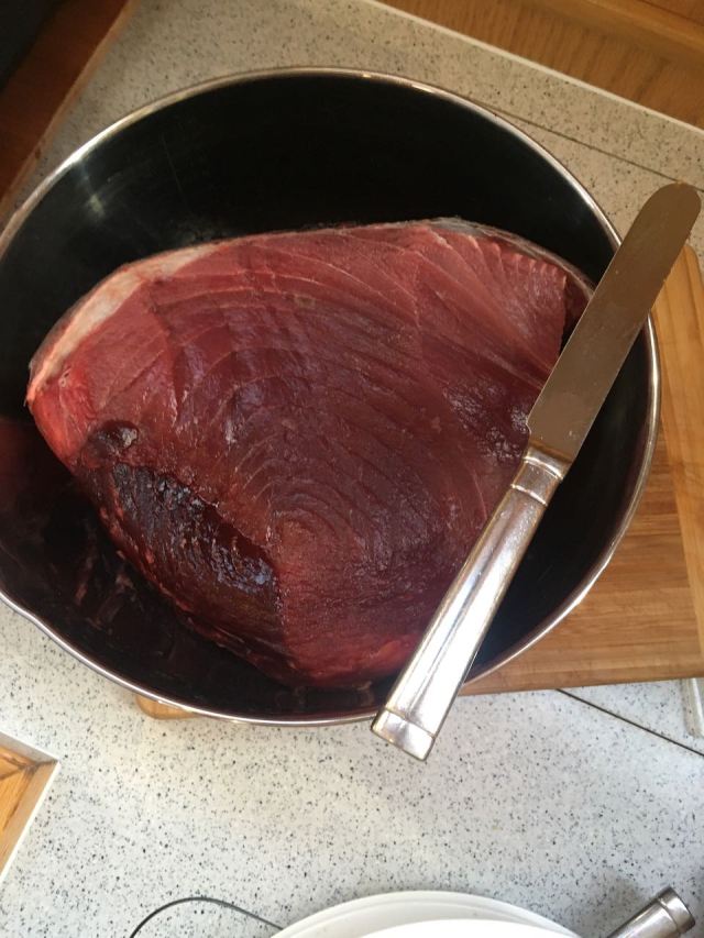 A lot of sport fishing boats join us on our platform. Most of them go out everyday trying to catch (and release) huge big marlins. It seemed to be a big competition and we learned that flags they hissed can tell you if and what they had caught that day. For us it got interesting when they caught a tuna or spearfish (A little blue flag). They were allowed to keep those guys and we could benefit. Yammi. One day a boat caught a huge tuna of 120 kg. It was a beast. I hope we’ll never have such a big bite. They offered us a piece and when I weighed it, it had 3kg. Omg, what to do with that much fish? Hahaha, we had sashimi the first day, tuna chunks marinated in soy sauce and grilled for the next two days. We also pickled the fish in salt for 24 hours, that turned out to be an easy and very delicious way to keep the fish for about a week. My attempt to boil down tuna chunks was also a success and super easy to do. That was a relief because after eating three days only tuna you kind of get bored of eating it and 3kg filet is quite a lot for two people.