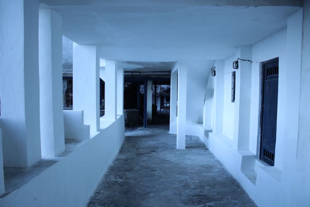 the coastal enclave with some houses built in the caves; the local has to carry everything down there by foot; the man was carrying concrete bags