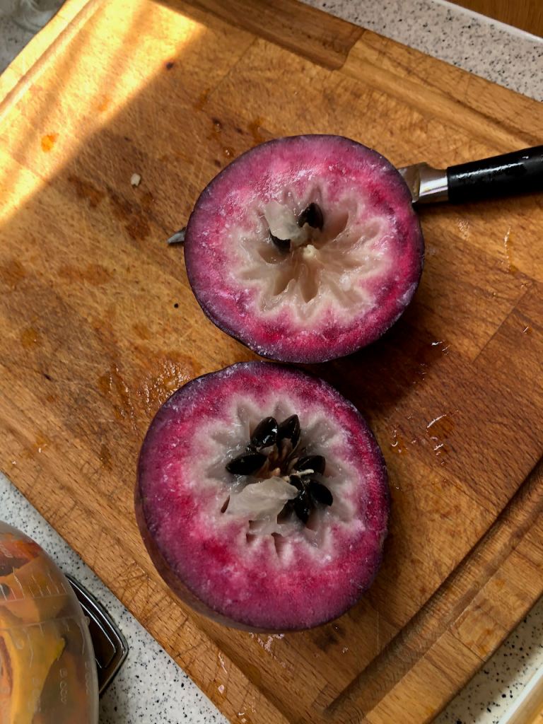 a star apple, looks beautiful when cut, the taste looked more promising than it actually was…but maybe I cut it too early