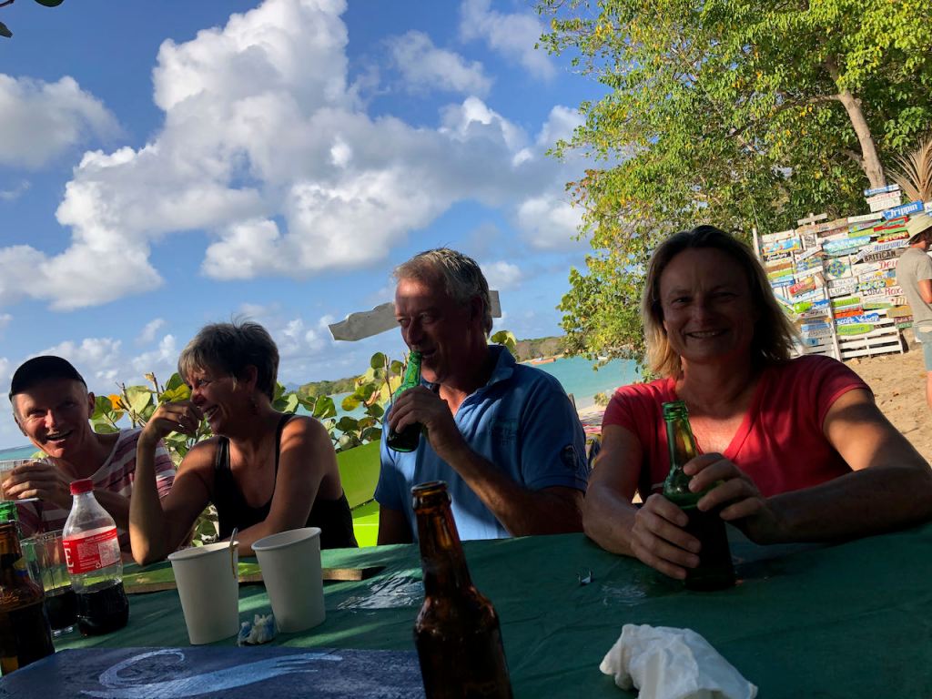 I’m almost surprised myself😉 that we could do so many things since we arrived in Tyrrel bay. After a couple of days the ash from the volcano was gone and we could enjoy the island life. We had beautiful walks into Hillsborough town along the beach and through mangroves, hikes to the south east side of the island and up “High North”. We joined a diving boat for a snorkelling tour to “Sister Rocks” and “The Rose”. We participated in a beach, shore and underwater cleanup organised by a local diving school to support the worldwide “Day of Earth” Celebration. We had a lot of fun going to “Sip and Paint” at Paradise beach to be creative. El Capitano challenged again his running shoes and I tried some different exercises in participating a noodling course with Shell and Marieke at the beach. (A noodle is a swimming aid and noodling is a kind of aqua gym with a noodle😉). And, as the lobster season will be finished starting May 1, we needed to eat lobster! But the absolute best incident was that we got our second vaccination shot.