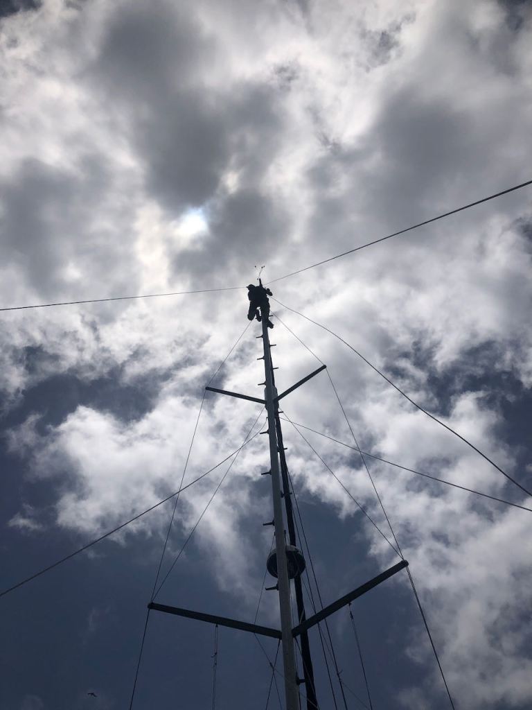James high up in our mast; he was so kind to climb up as we both still freak out if we have to go up there. Our anemometer was broken and we tried to repair it, which -knock on wood- so far worked