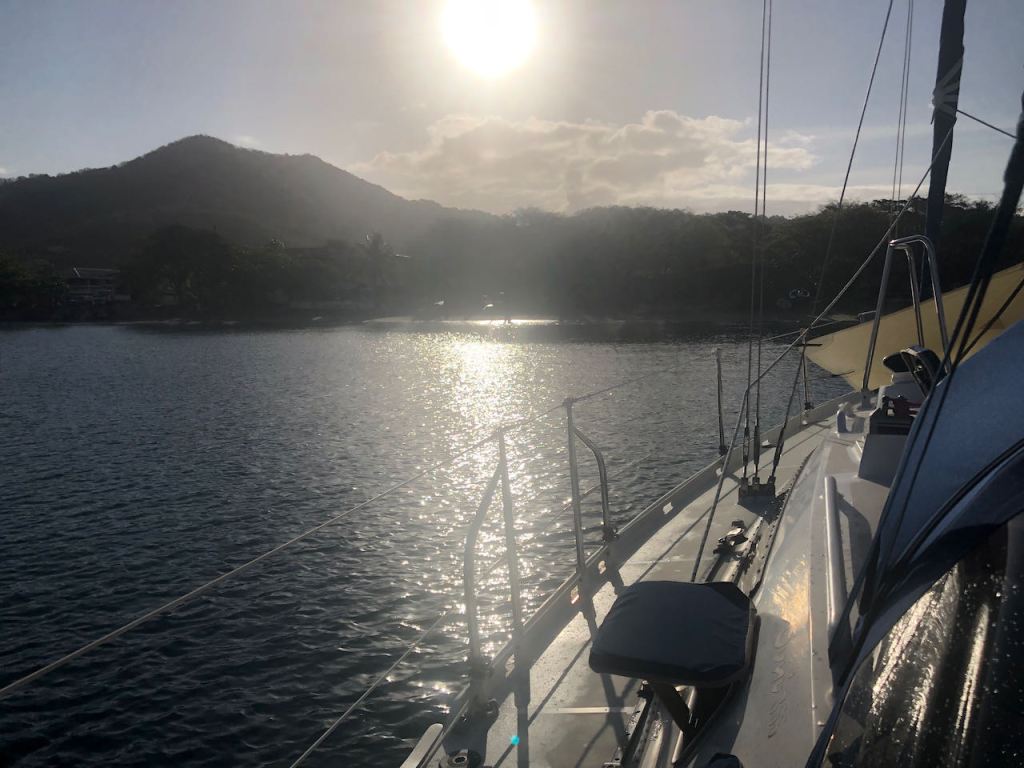 our local neighbour, a very gifted sailor; he had no engine in his boat therefore always sailed in and out of the anchorage; we were very impressed