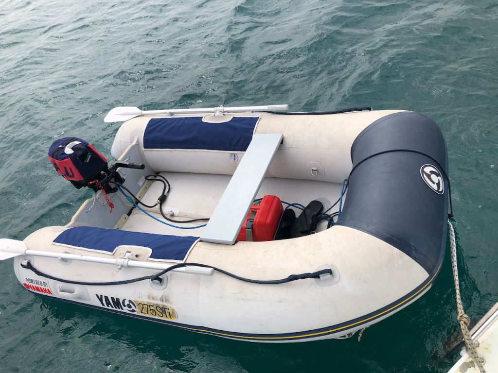 Making a cover for the dinghy is quite a challenge. First I needed material to do the pattern. Just to remind the attentive reader, any kind of shopping at the island is difficult. (Or maybe it’s easy as you know you won’t find anything so you don’t waste time looking for it😉.) So you need to be creative. I still had some canvas left and was hoping that it would be – sewed together – enough for the cover, but I had no pattern material. Luckily there is a monthly Caribbean newspaper printed which is free and displayed in most bars. Off I went to fulfil my first duty, gathering enough old newspapers from the bars for the pattern. Easy job! Next I needed to glue the pages together that they’d be big enough to cover the tubes from the insides to the outsides and as wide as possible. I felt brought back to kindergarten handicraft work times. In the next step we took the rib ashore to the beach to get the exact pattern of the dinghy. With the wind blowing and not enough hands to hold the flattering paper we felt a bit clumsy. People strolling by thought we were doing some advertisement, hahahaha. No idea why they thought so. Eventually, after some hours of holding, a lot of taping and sweating in the sun we were somewhat happy with our pattern. The next day we were excited to place the pattern on the fabric just to figure out that it wouldn’t be enough. Well, sh.. happens! Frustrated with all the work without result we challenged our brains. The brain storming helped to find an easy approach for the time being. A cover for only a small area where we can sit, easy to sew and fix with velcro.