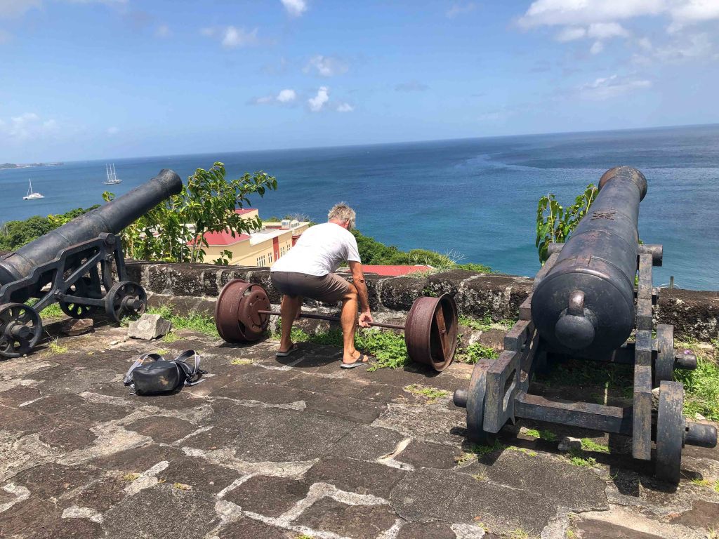 El Capitano trying the weights surrounded by the cast iron cannons of the spectacular Fort George