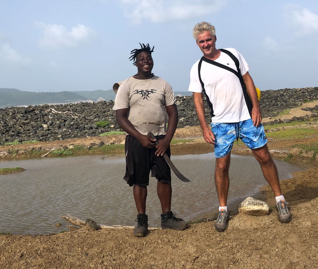 Ron finished his door, put on his hiking boots, took his cutlass (machete) and then he was ready to show us his small islet. (A real local never seems to leave his house without a cutlass. It is used for everything. Like clearing a way from anykind of nature, cleaning, cutting and filleting fish, chopping woods, gardening work and much more. A perfect allround tool, though quite dangerous.) We walked east through a dried out fresh water area until a watering hole for the sheep and goats who live on the island. Ron made it as he doesn´t want them come close to the beach, where they used to drink. He said, that they happen to disappear if people can see them. From the water hole we walked up the hill. It was the north tip of Saline which provided a great view of the island. We could see the saltponds in the centre and – clever as we were – we figured why the island got it´s name. Ron told us that he wanted to find and clear a way down the other side of the hill so that he could offer a round trip soon instead of going back the same way. We enjoyed the hike as it was and were very thankful anyhow. Ron was a great guide and we could stretch our legs despite a complete lockdown weekend. What a treat!!!!