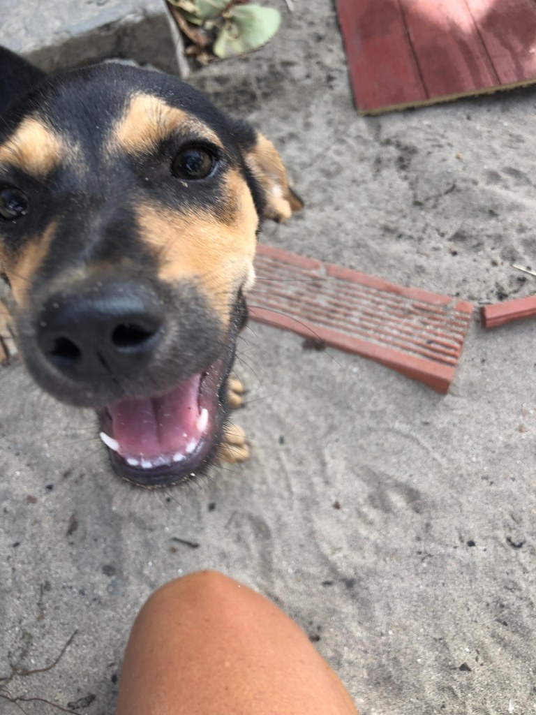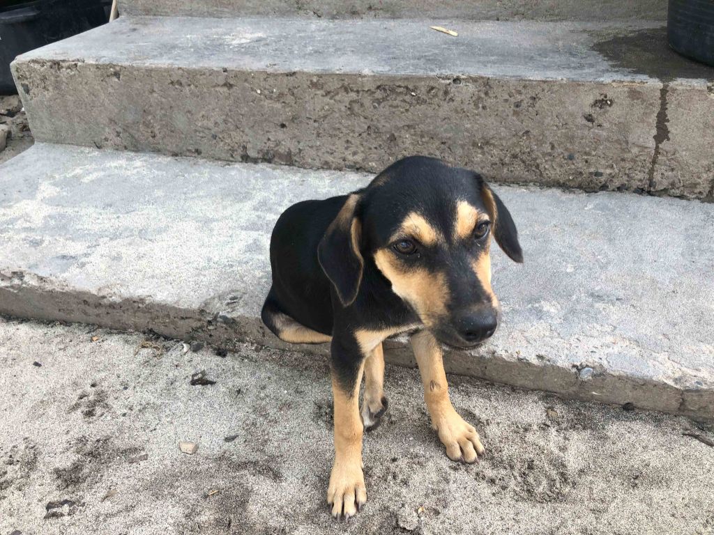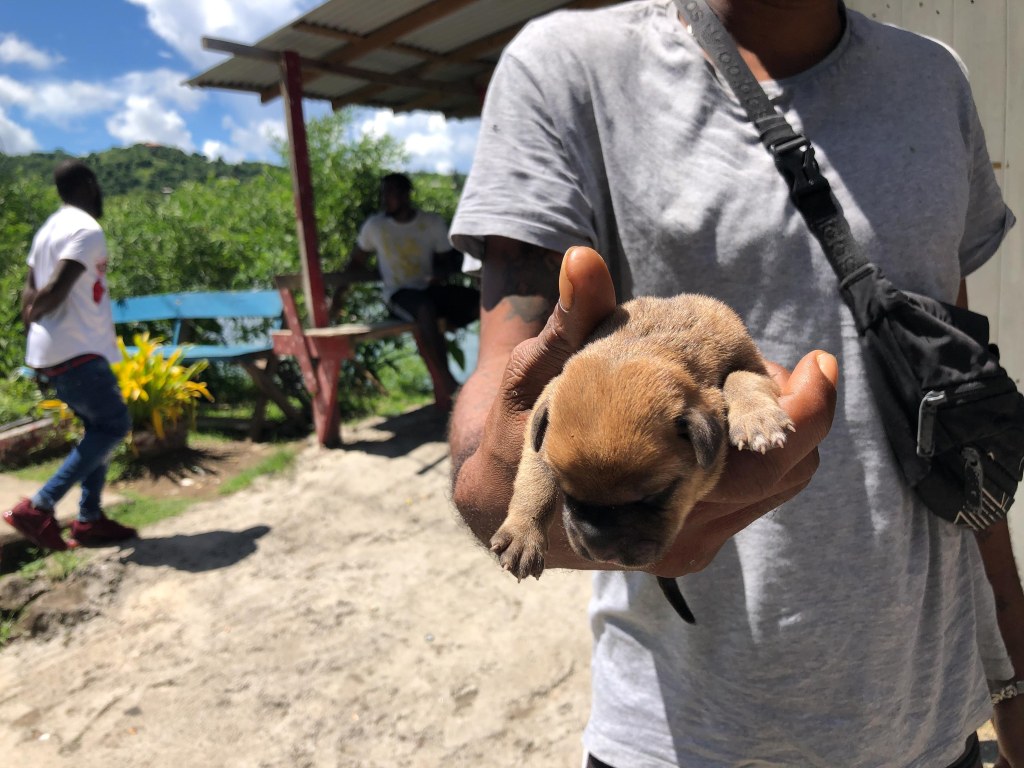 this poor puppy lost his mom somewhere in the woods up the hill and the nice local picked it up