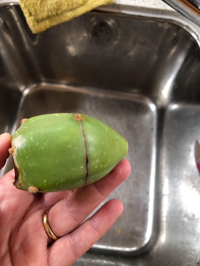 Ron showed us how to clean a prickly pear; it is so easy if you know what to do! Just rub the nasy tiny prickles softly on grass or surface and just like this they’re gone.