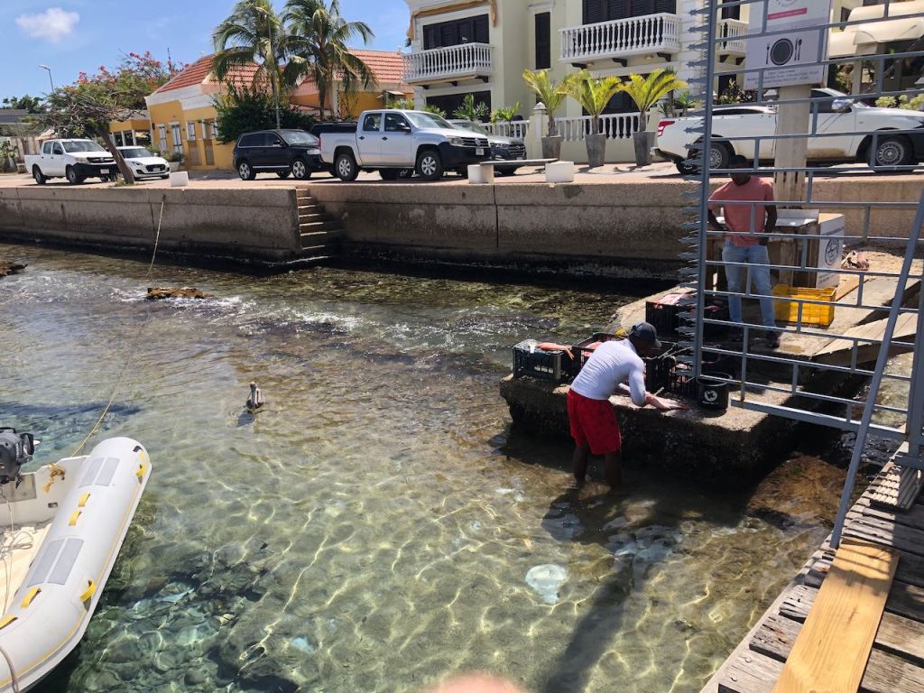 he was always sitting there when we passed bywe went for a drink with Ruffian on our second last day; I thought the seating was worse a picthe dinghy dock the last ride with our trusty dinghy; we gave it to a Dutch family fisher cleaning their catch and the pelican was hoping for some easy biteschecking out