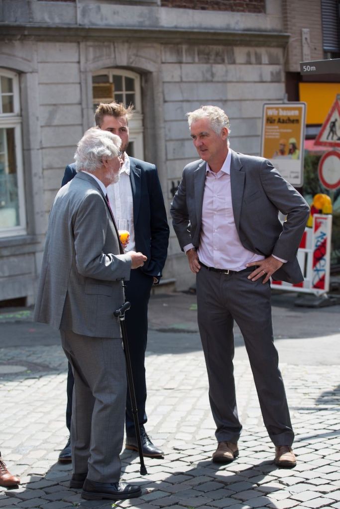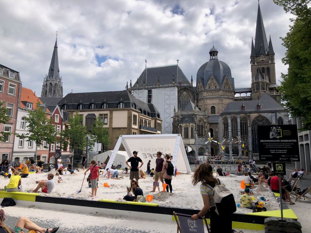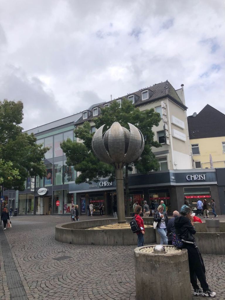 Here is what Aachen tourist service explains about the fountain: “The “Kugelbrunnen” opens into full bloom in eight minutes. In Aachen, water and technology are close companions. The artist Albert Sous from Würselen took this to heart in 1977, and constructed a fountain from old washing machine drums which is made to move by a hydraulic system which is purely mechanically operated using water pressure. In just a few minutes, the ball becomes a large flower, creating an unusual work of art in the middle of the inner city. It can be found in front of the Aquis Plaza.”