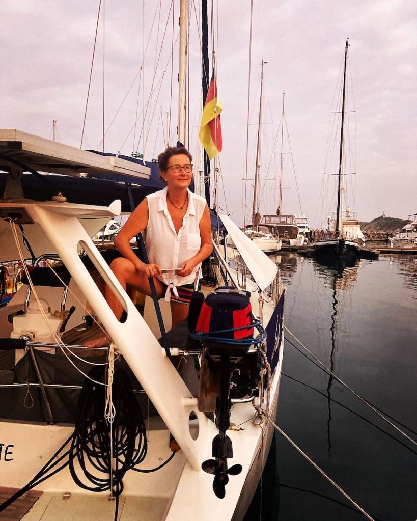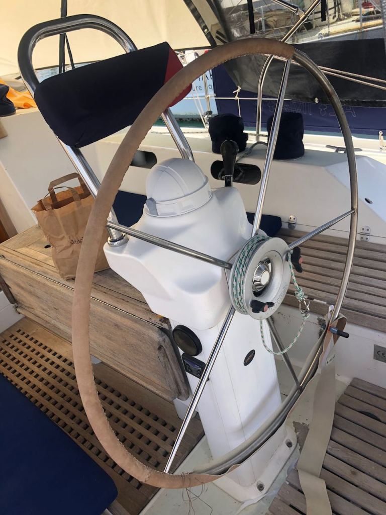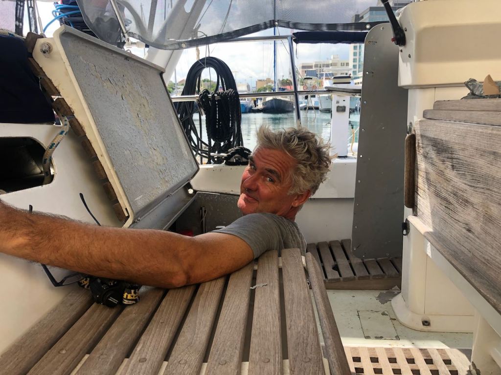 early in the morning after some hours of sleep, still tired but happy to be backan amazing sunrise at 5:30 amme, admiring the sunriseworking hard a beautiful old sailing ship showing off at sunset in front of SM baythe new wheel covernot a difficult work but you need a lot of patience having a beer at the marina bar and enjoying the sunsetEl Capitano happy in the aft locker- I would never have thought that he would actually completely fit in…