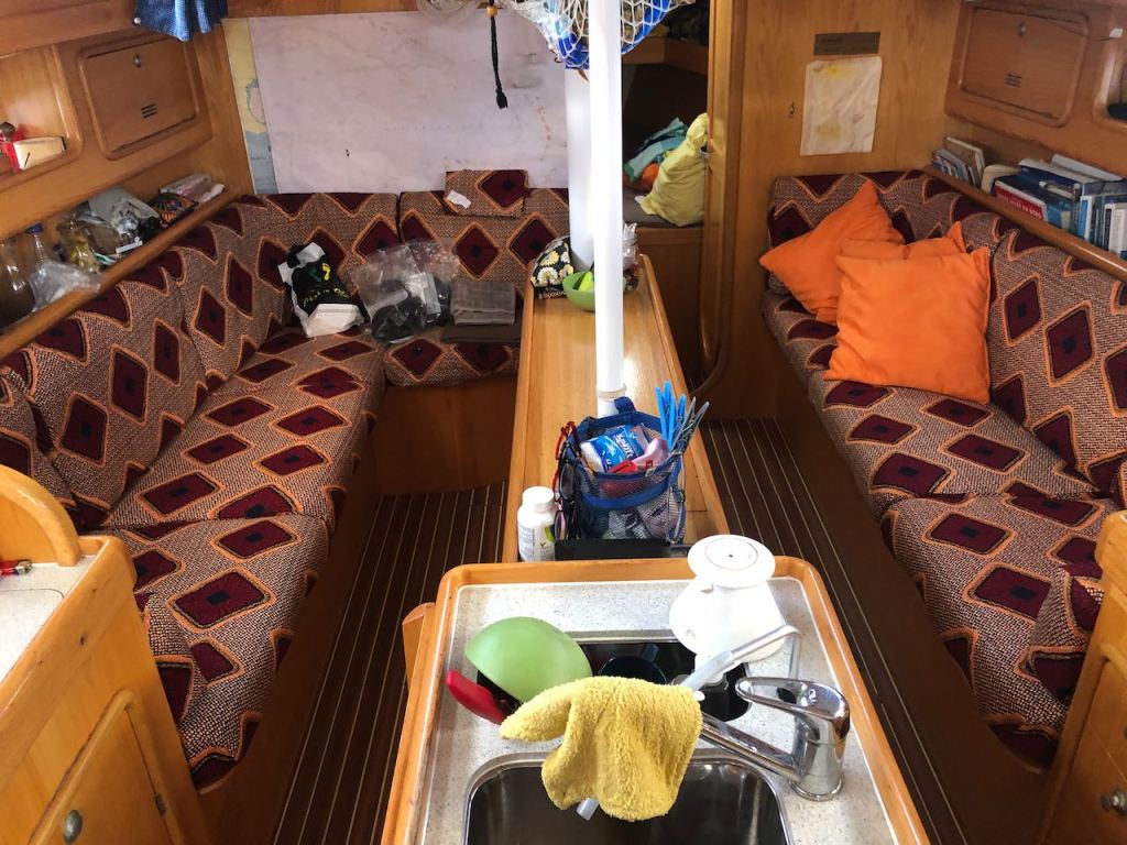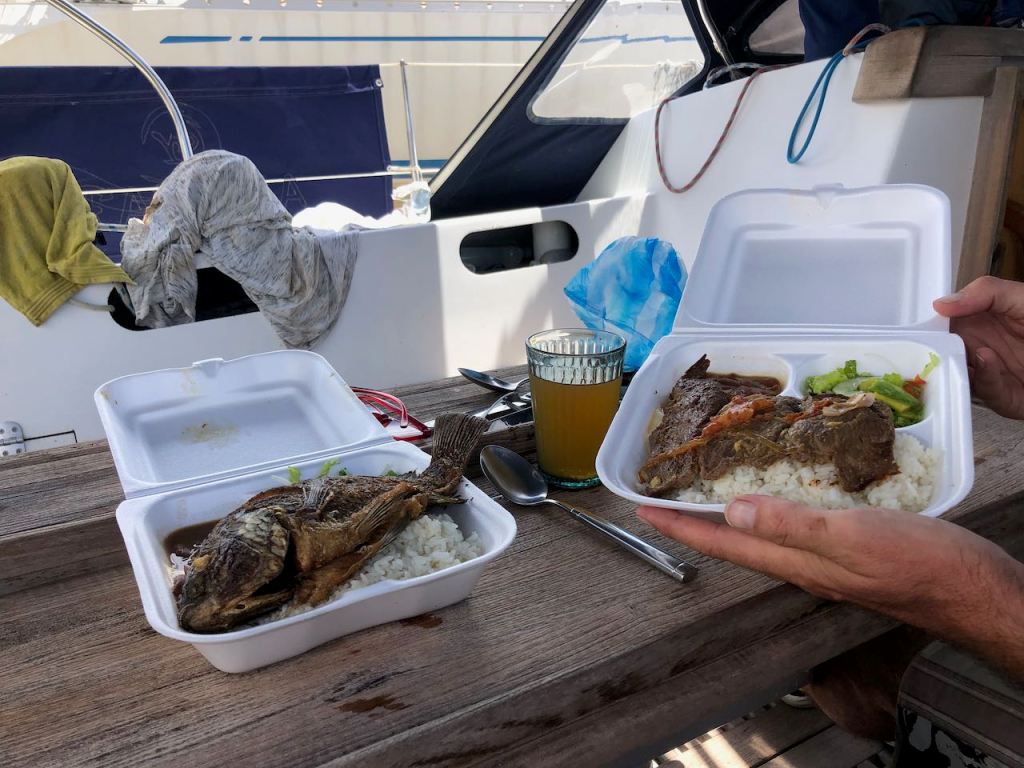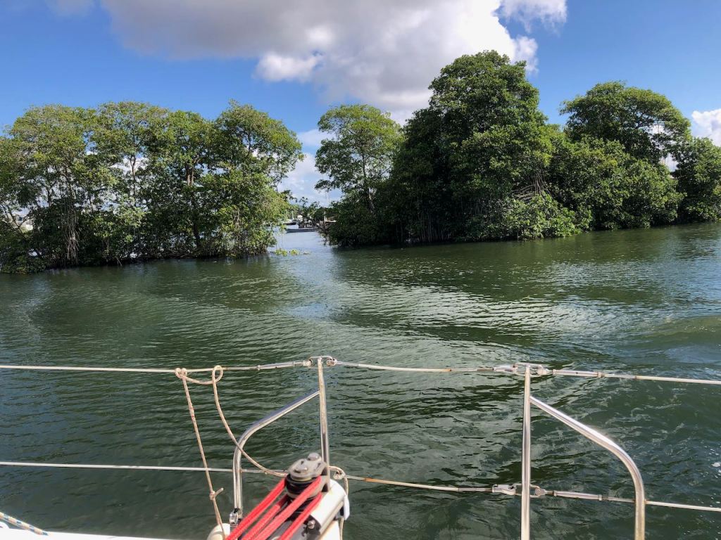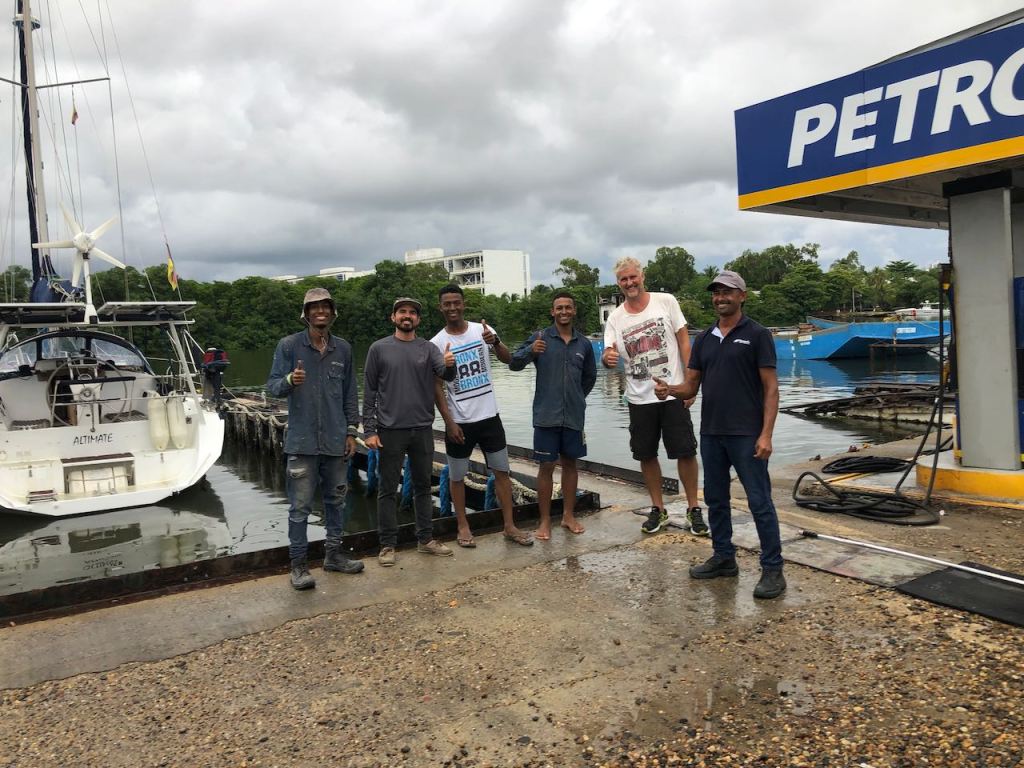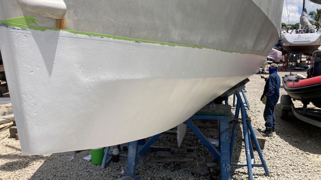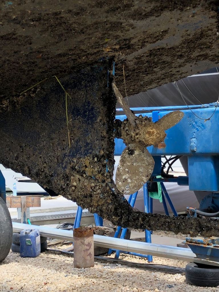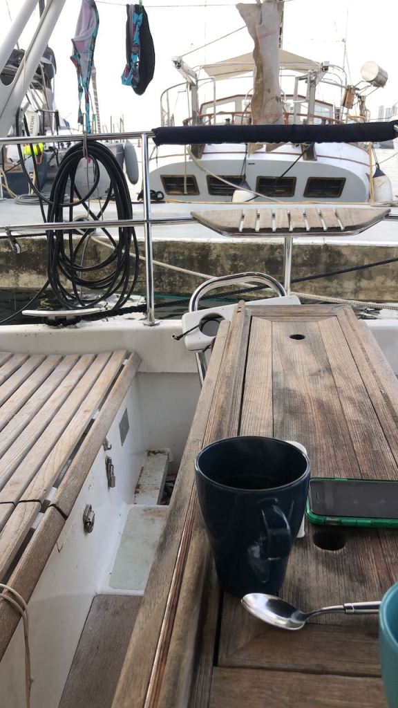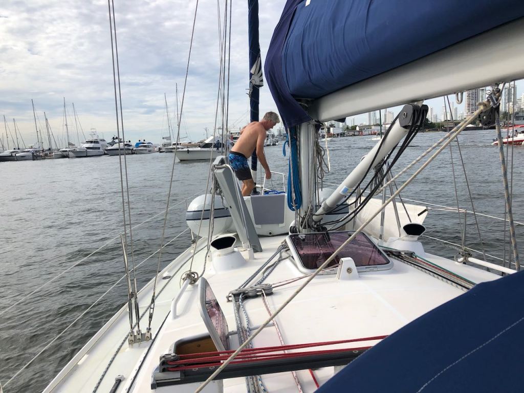 leaving Club de Pesca, the fort at Cartagena anchoragethe view to the old towna bit hard to see, passing a submarinethe big container harbourBajo de la virgin, in the centre of Cartagena bayhe followed us …the giant giraffesreaching Manzanillo Marina Club – it was a pretty entrancethe poor guy had to jump into the not so clean looking water to dive underneath Altimate to get the strings to the other sideand out she wasmany barnaclesyes, she needed a new antifoulingfirst day at the marina we ordered the local lunch, fish or beef with rice, beans, salad, a soup and beverages for only US dollar 2,50 the view from close to our airbnbjust prettyour tiny airbnb, I think it used to be a garage. The shower was underneath the staircase, it was smaller than our head on Altimate😂eventually the lifting keel got removedbecause he had time, El Capitano sanded the cockpit tabler, it looks so much better!!!!after a lot of sweating and struggle the first slider was removed a holder for the slider, don’t know how to explain this pictureall the sanding done in between all those busy days I was lucky to have.a girly day out with Fionafinal preparation for the first layerlooked so much better back in Manga in the evening again high tide, the street was floodeedon my way to another supermarket I passed Castillo de San Felipe de Barajasit was so funny to find that in the supermarket, not that we wanted it but stillthe last parts to be sanded and painted -where the support legs were mountedall done and back in the water, some of the workers of the marina crewand finally back at anchor in Cartagena bay, El Capitano inflating our new dinghy we bought a couple of month ago in St Martin