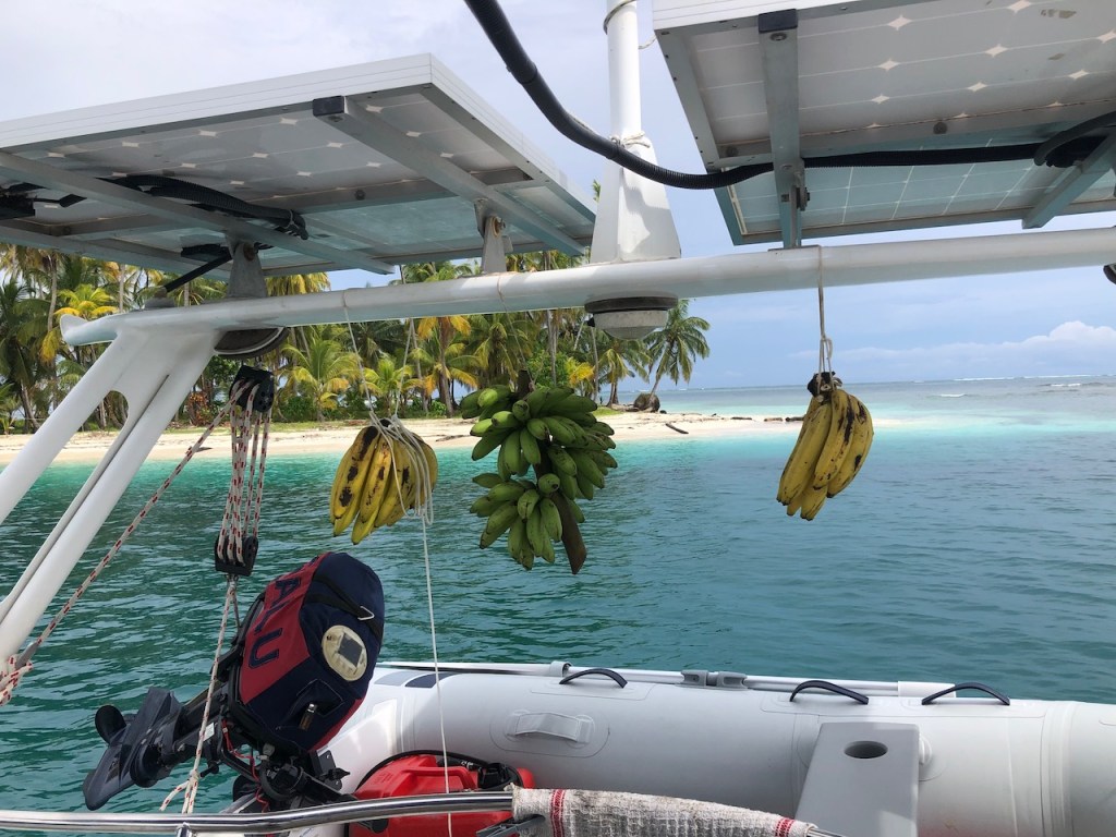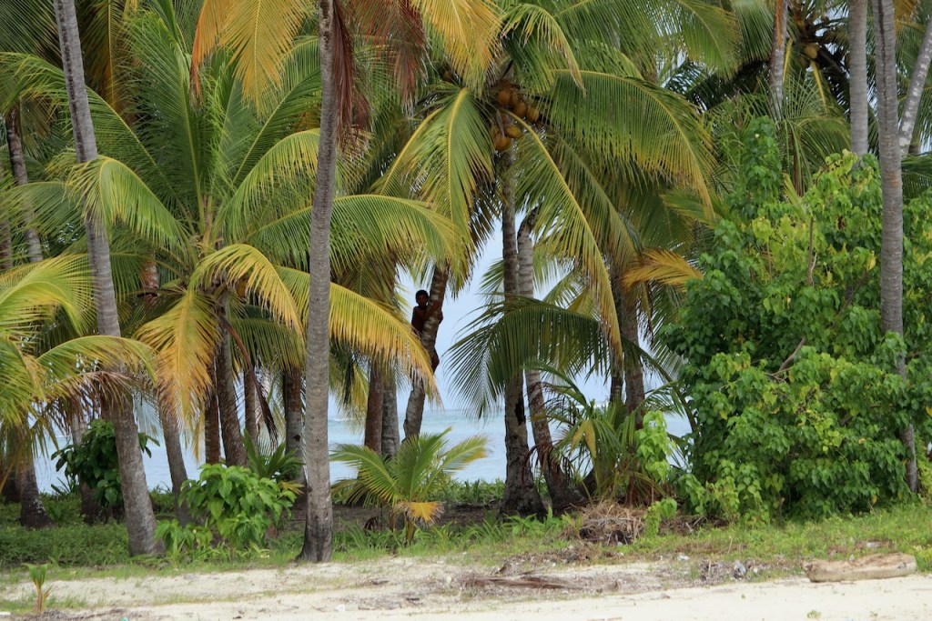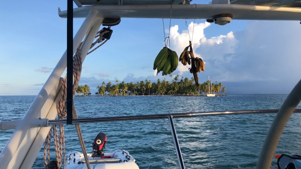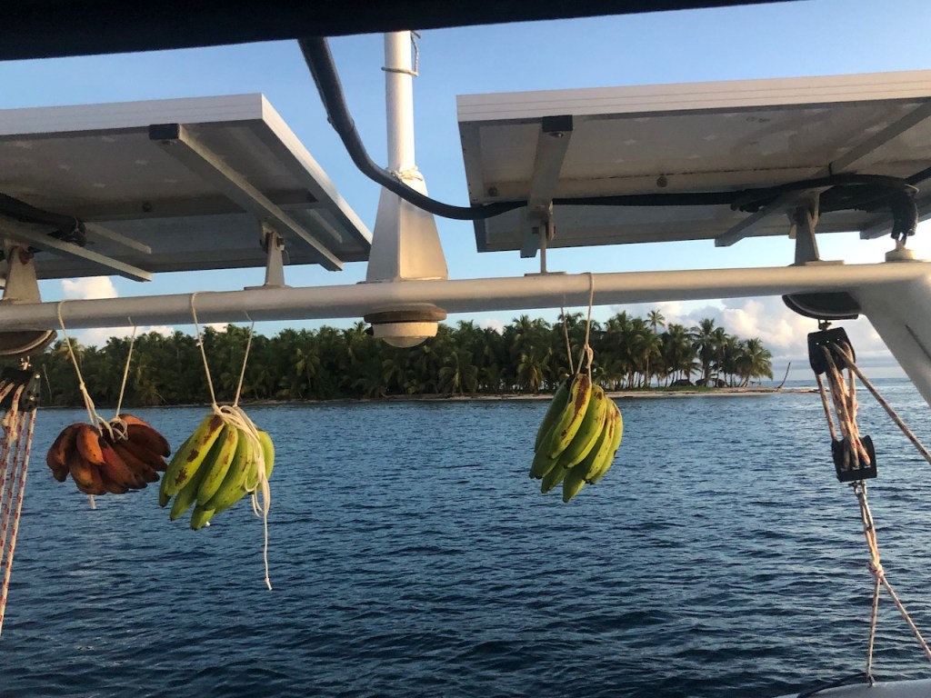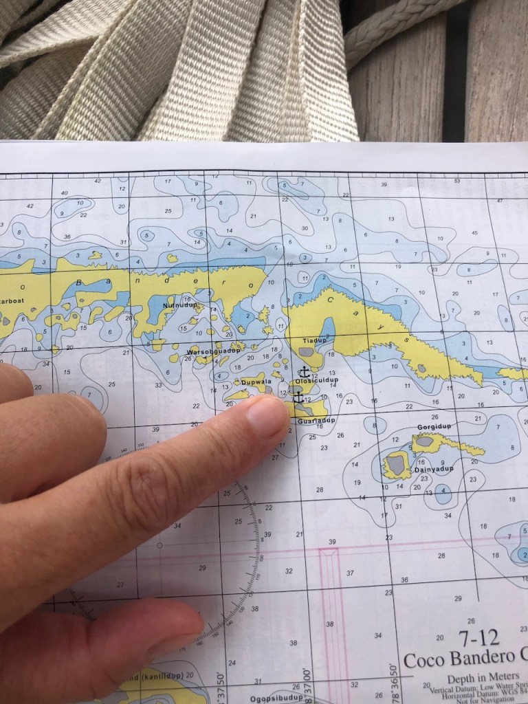 Tiadup, a small island before reaching our anchorage; a Guna family lives there; sometimes they provide some food; when we visited we were not luckyour opulence of Bananaswe were right anchored between two islets, Olosicuidup and GuariadupJuan ( if I rememer his name correctly) climbing up a palm tree to get us some “pipa” green coconutshere the anchorage, the grey parts are the islands, the yellow patches the reefsif you look closely you can see three of the Guna menOlosicuidup Guariadup, here we saw our first big rays, very beautiful, but no proof -sorry