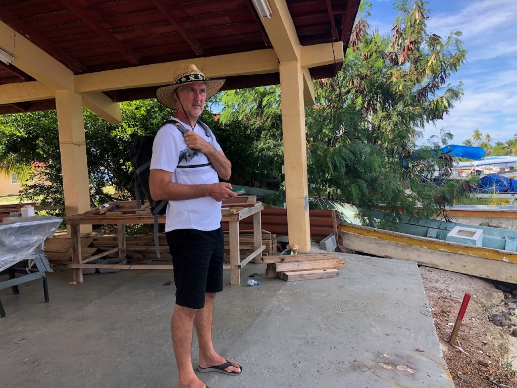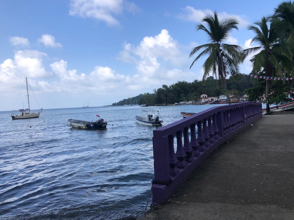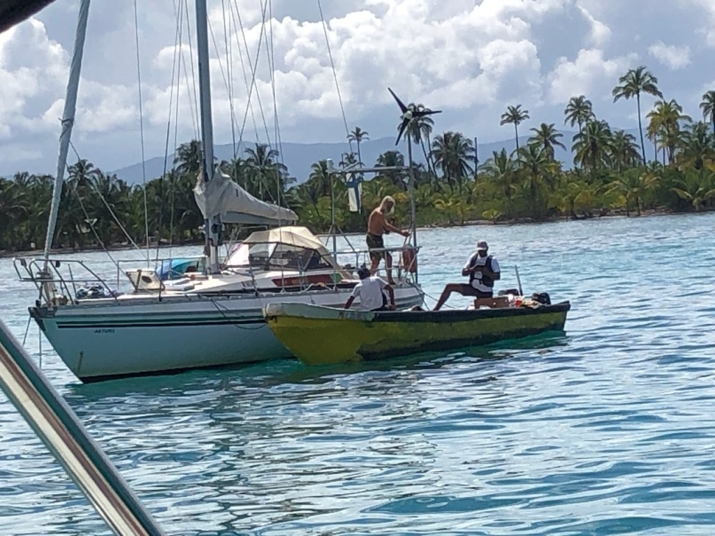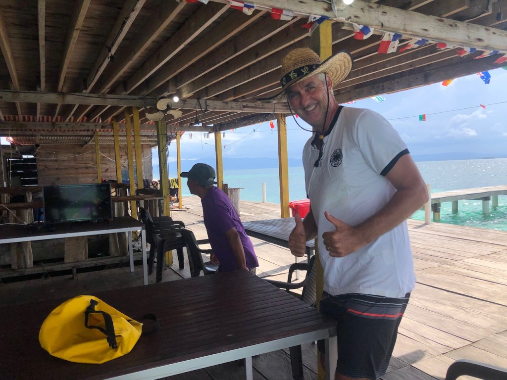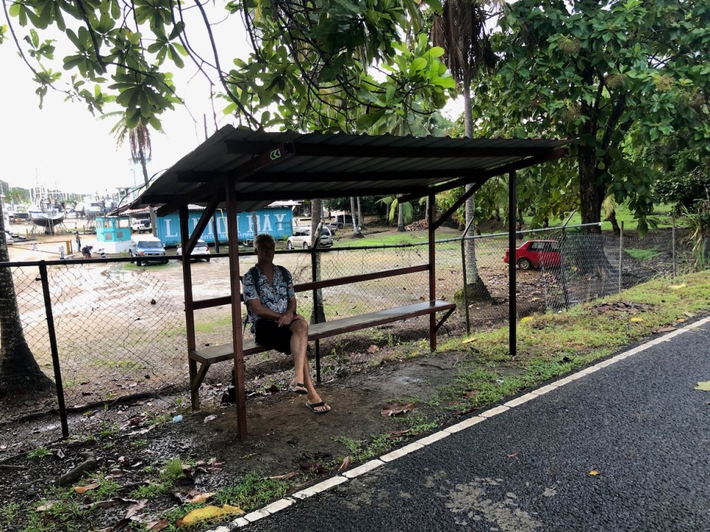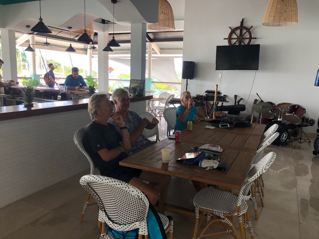 Marina Linton Bay; this crazy construct is a floating apartment, which can be rentedthe marina looking north eastin the back Isla Cabrafootball!!!! unfortunately the German did not very wellthe big audience watching, Herwig, El Capitano and Heikewe also met this nice couple Swiss/ British Daniela and Mike, they have the exact same boat as we have! t was the first time since we left La Rochelle that we saw another Ovni 365 and they were also friends with our dear Canadian friends from Carina😊waiting for a bus to come to take us to 4Alto a mall close to Colon, a 2,5 hour ride just to buy some groceriesthe area was beautifuland some passengers were crazypassing the ruins of Portobelo wallsthe welcoming bus stop close to the mallwe spent more than 500 US; the advantage was that the supermarket then provided a lift back to the marinaI thought that was kind of cool using the wingfoil on a dinghy, here in the anchorage at Linton Baya walk to Linton harbour, the small village with a Chinese super-allround-market, providing food, DIY parts and bicyclesI just liked the picture of Daniela and meand a beautiful impression of our corroded anchor winchthe entrance of Linton Bay, we were again waiting to take the bus ;this time going to Portobelo to get some cash, ATM’s were very rare but you often had to pay cash; we were lucky that day as our friends from Basta located at turtle Cay Marina suddenly came by with a car; they offered us a lift to Portobelo and back😁we had a lunch stop at PortobeloMike catching a nice picAlex, El Capitano, Mike and the carwe had a stroll to Linton harbourso many chicken