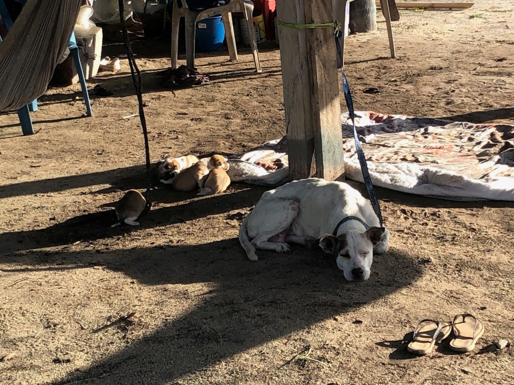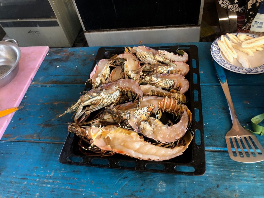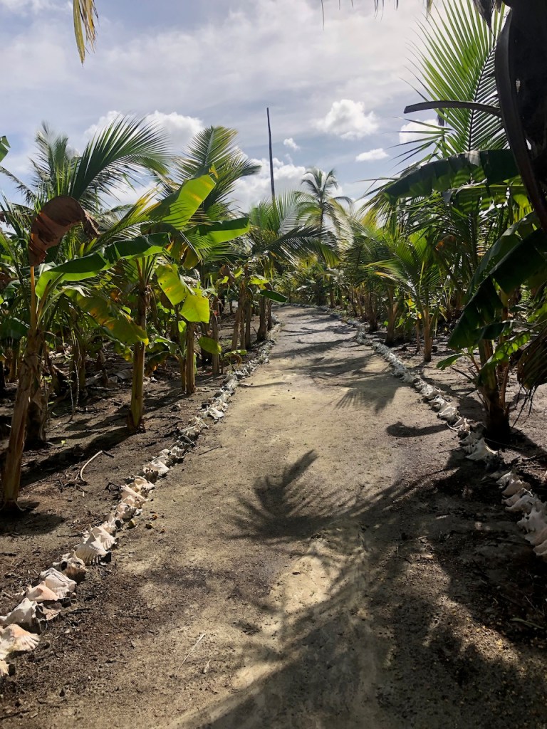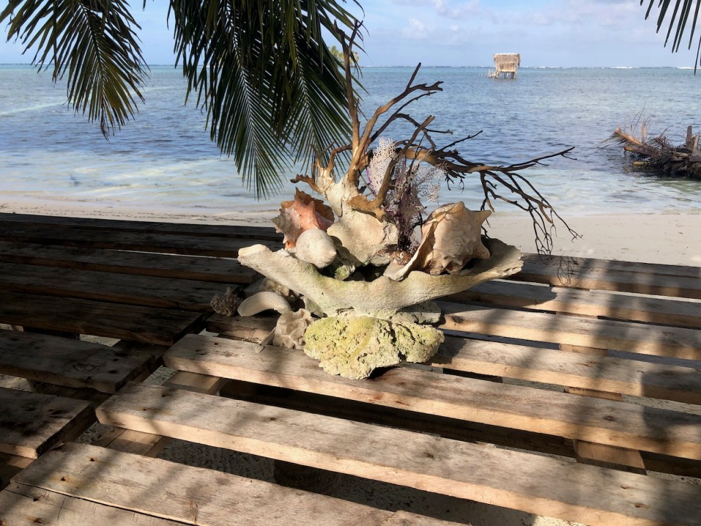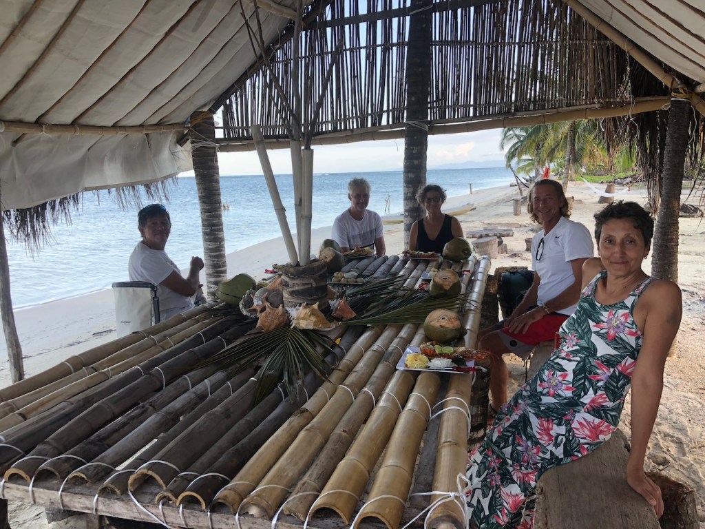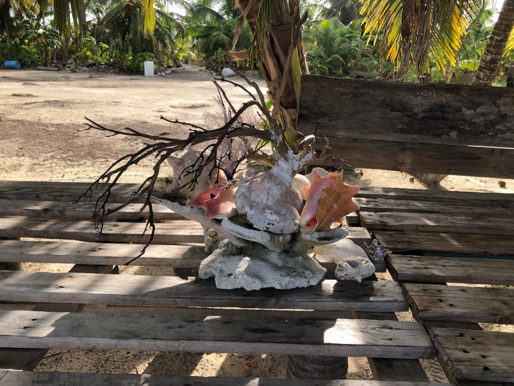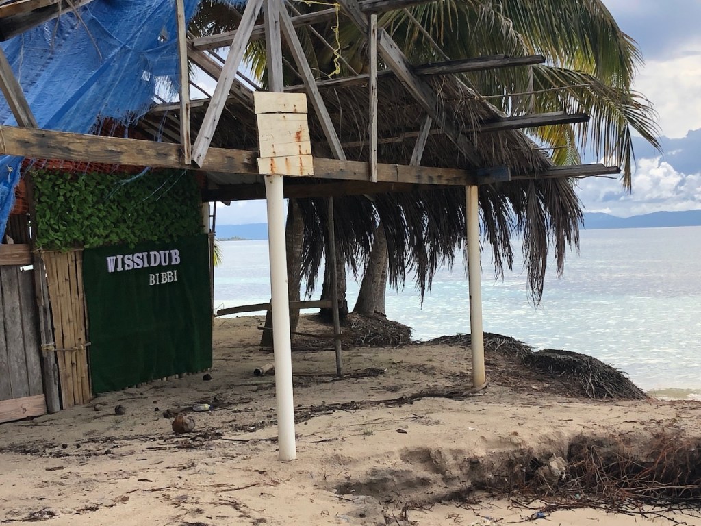 our first approach at Banedup, the island where Ibin the chief cookshe made this path from the north to the south side of the islandsome of his simple though pretty decorationsin the background the “Honeymoon sweet” 😁yes indeed Ibin has a plan to build some more of these huts which he calls ” Honeymoon suite”; we doubt that anybody will actually book it; so far he sleeps in there every night; it’s at least bug free!in the back the island which the sailor cal BBQ-Island, its north of BanedupIbins kitchenMarta the sister of Ibin in her traditional cloth helping Ibin in the kitchenfresh lobster waiting to get cookedIbins restaurantthe bitch with her newborn babieswe accidentally gathered together and had a fun evening while enjoying Ibins foodPipa drinks and ceviche as starterveggie delivery at the swimming pool from some busyness oriented Gunas; here they were taking care of Heikii, Finnish solo sailor