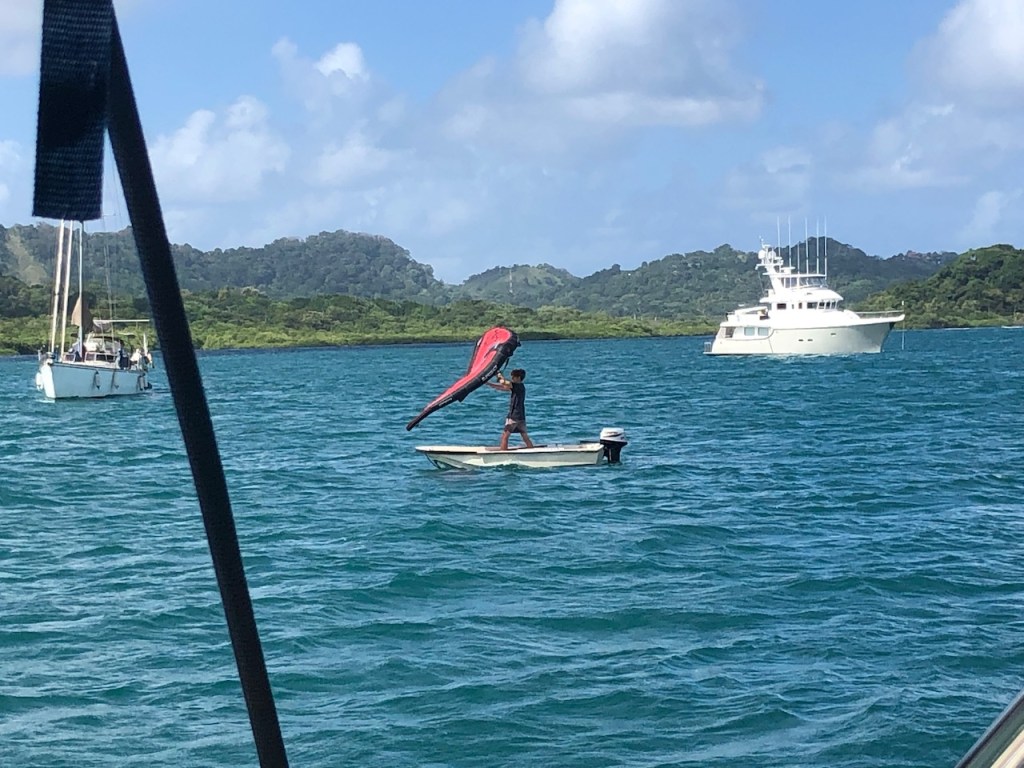 El Capitano standing in the watersometimes the Gunas also put some sails up and use the wind to move ona veggie boat passed by, we happily took what we could get