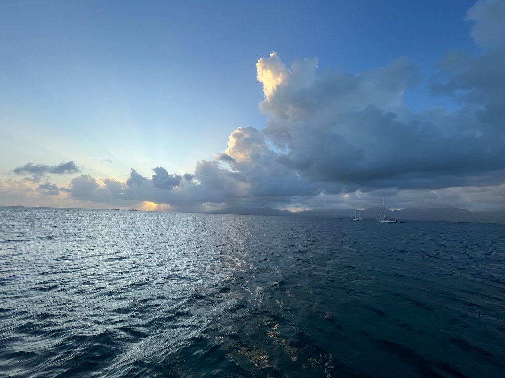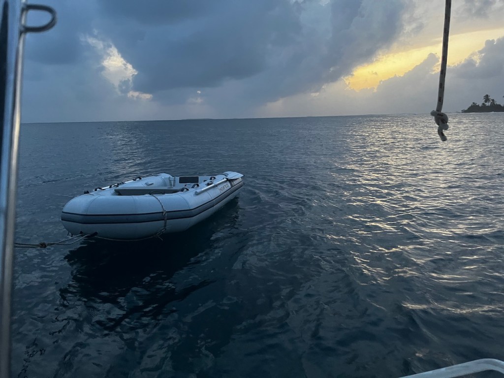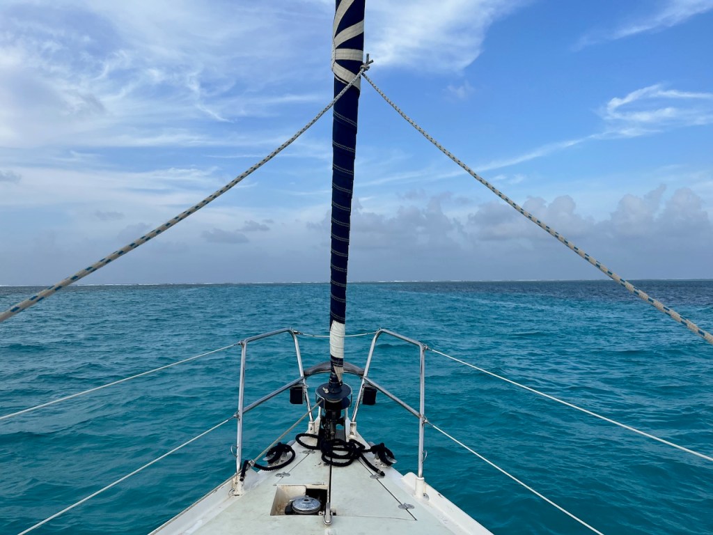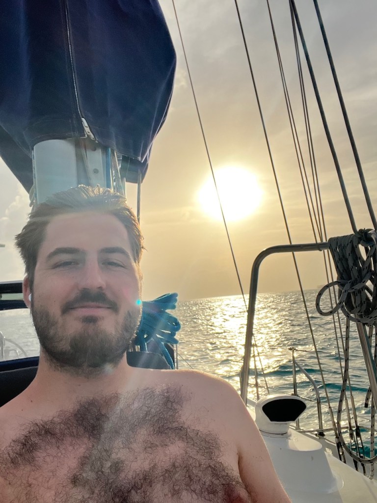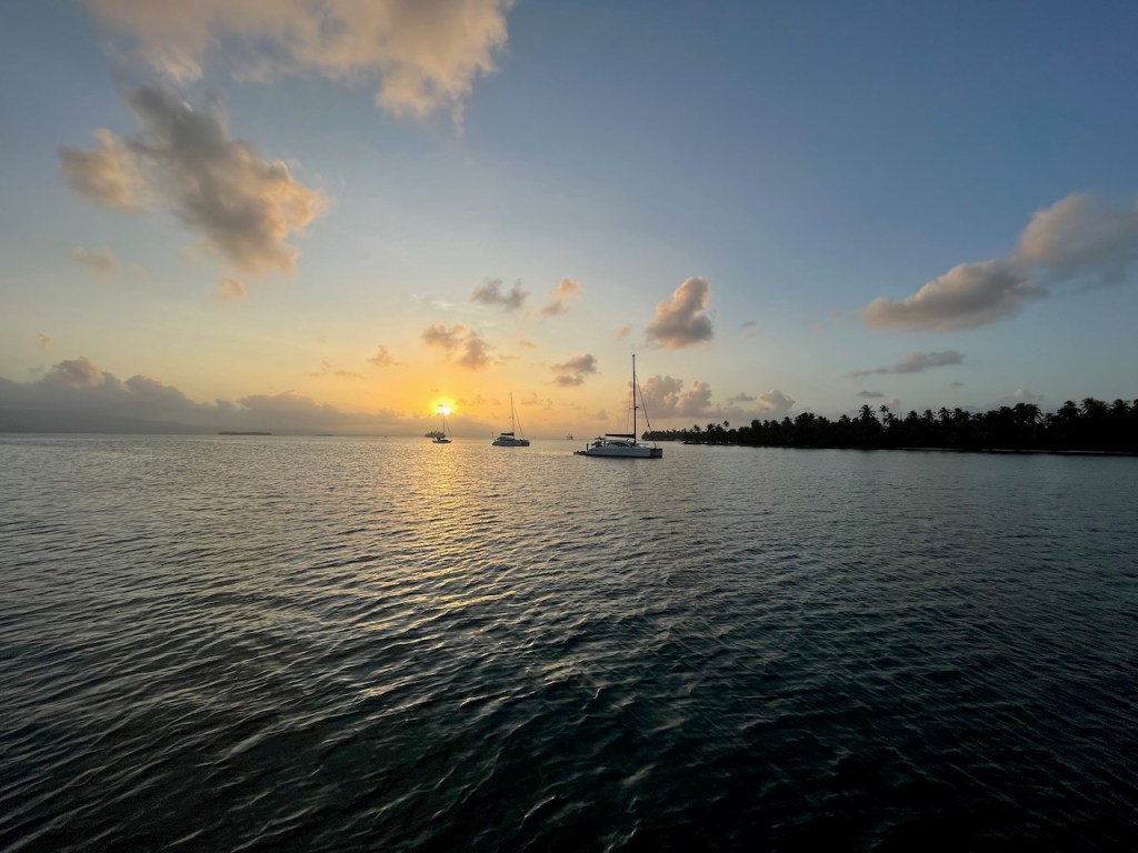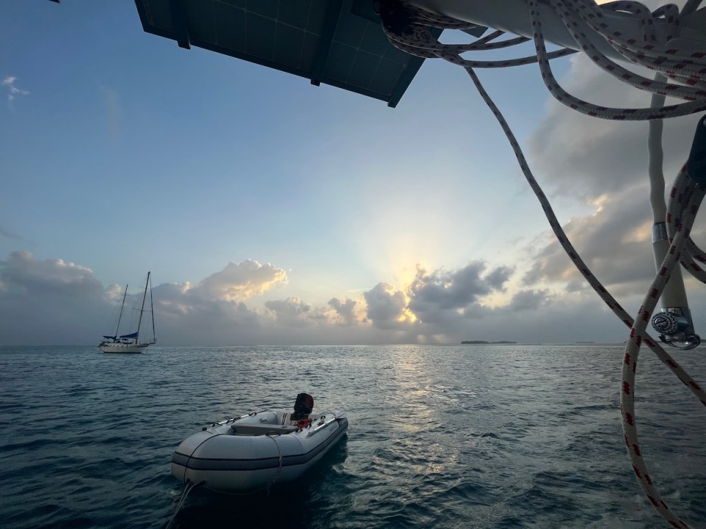 here we were anchored right in the middle of a big reef, we were hoping to have a good snorkeling spot; unfortunately that was wrong and apart from that the current was much too strongLuisito enjoying the sunset at the bowpassing some islands on our way to the so called “Hot Tub”focused sailingthe hot tub