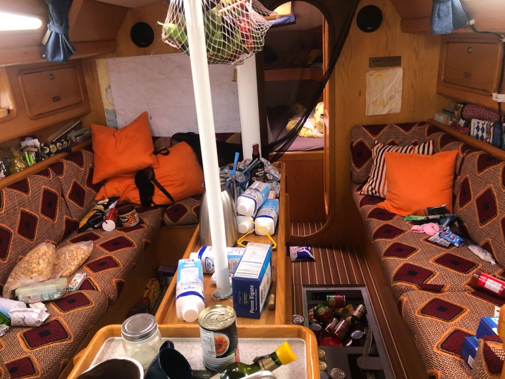 Besides, the trip to Mariadiadup was quite rough. Big waves were shaking us through the water, Altimate was heeling over a lot so that we had a very wet ride. By the time we arrived we found some salt water in the bilge and even a few drops in our “cellar”. Another project to look at. The whole bilge needed to be cleaned out to try to find where the leak was. That’s what sailors like! Yeah, crawling through the bilge. Ok, on Altimate it was not too bad as the bilge is very shallow, but still it was not our favourite job to do. The good thing was we could check on our tin and glas food supplies and clean the bilge at the same time. All in all there was only maybe 3/4 of a liter which we absorbed but we couldn’t immediately find the source. In the end we figured that it was a hose clamp on the engine which was corroded. Fortunately two clamps were used to secure the hose. Otherwise we would have had much more water and a much bigger problem. The water in our cellar probably came through the fixing points from the hydraulic ram. El Capitano sealed it with sicaflex to stop water from coming inside. So, all in all, the rough ride was actally good. Like this we found the weak points early enough to get them easily fixed.