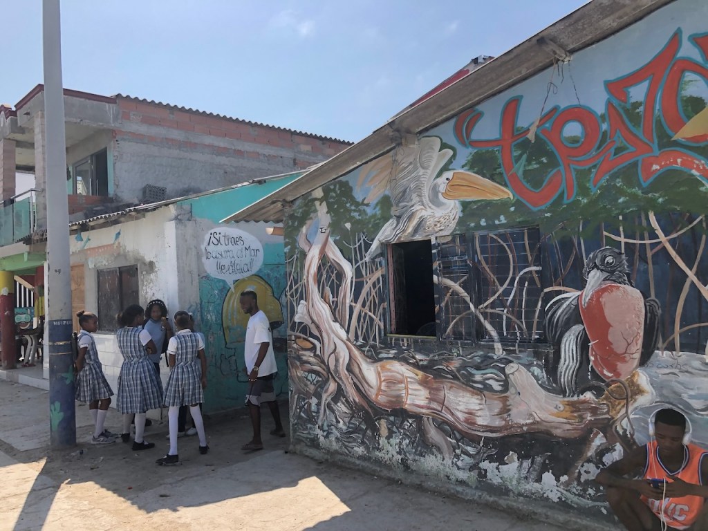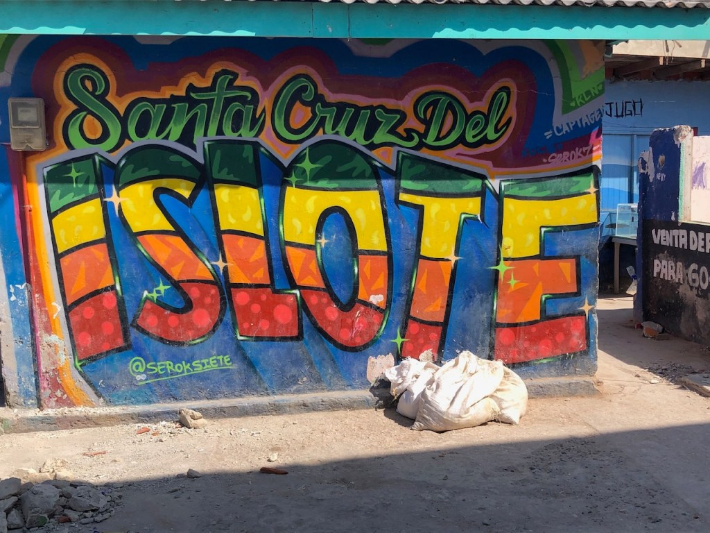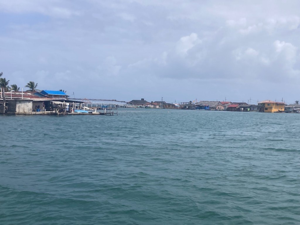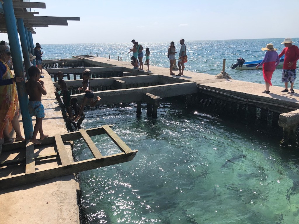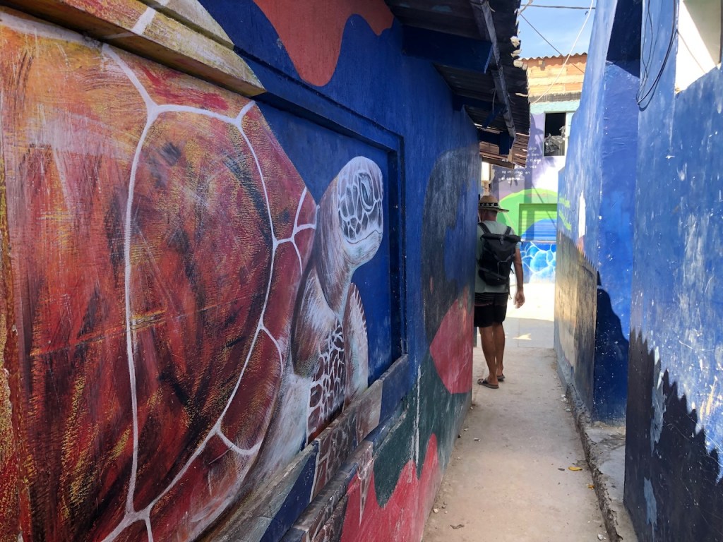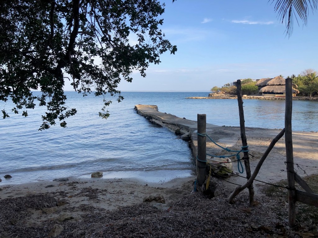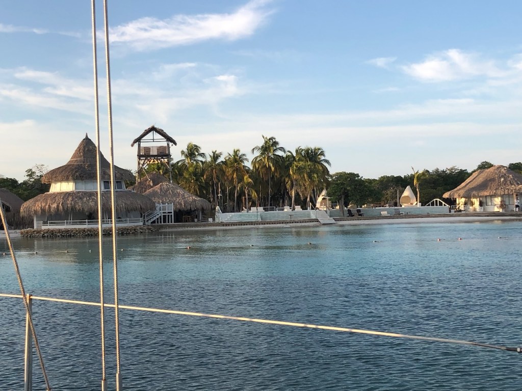 we passed this buoy, landing platform for boobies (I think)our anchorage in Tintipanthere were some pretty nice hotels at the beach line, but nothing else . behind the hotels mangroves that was itit was possible to walk along the beach side from hotel to hotel, but that took us only about 5 minutes, not much to do at Tintipan ashorea baby ray the hotel staff was bored so they showed us their rooms, we didn´t ask for that, but curious how I am I had a look😉, big bedsbig chairsthe pool areathe beach walkwe met Raphael and his wife Nerina at the beach, they had a small restaurant and cooked for us, because there were so many mosquitos in the evening they had decided to deliver the food to Altimate, very nice guyswe also visited Islote, a small man made ilsand I think these guys were kept for cockfightsthe even had an aquariumthe kids were using the aquarium as apoolmany fish in there, all the same kind, we also saw some turtlesa different kind of aquariumcolourful alleyschool kids having a chat