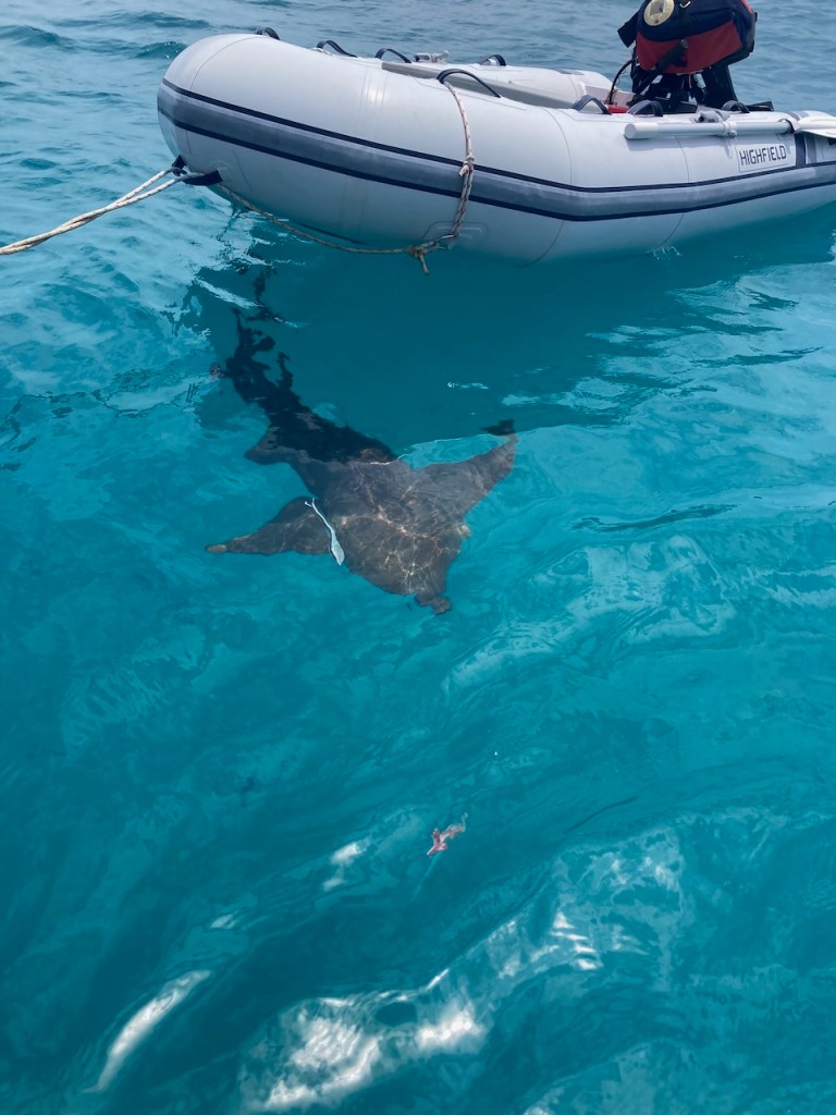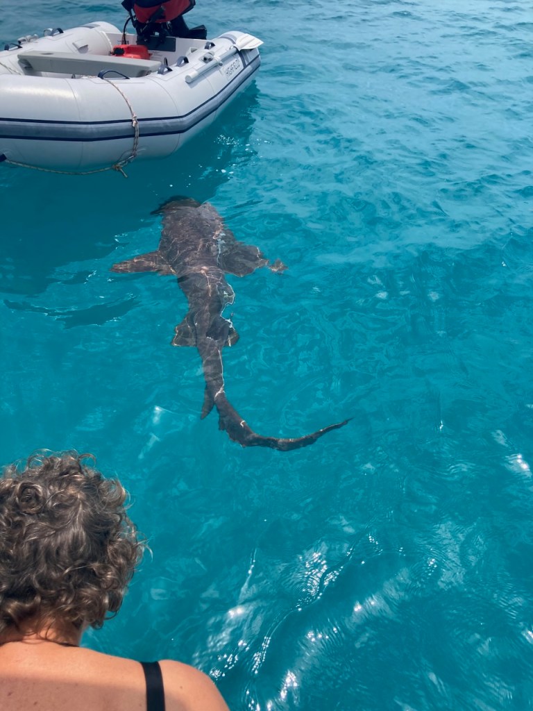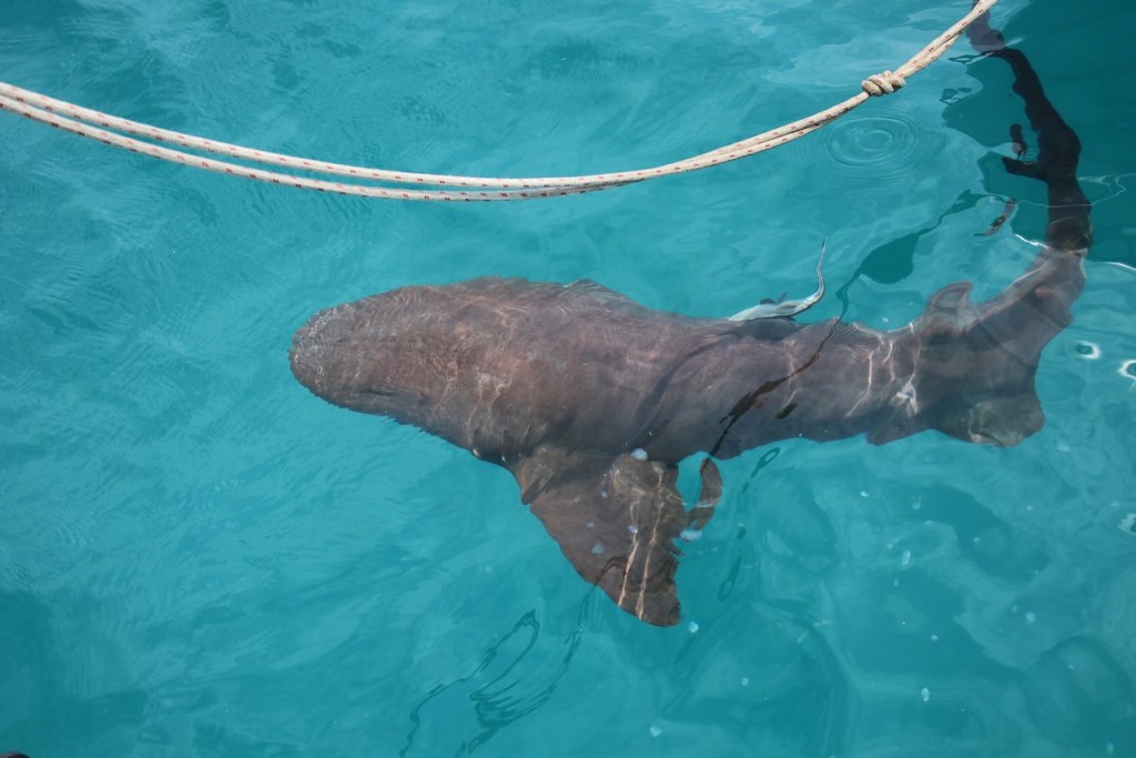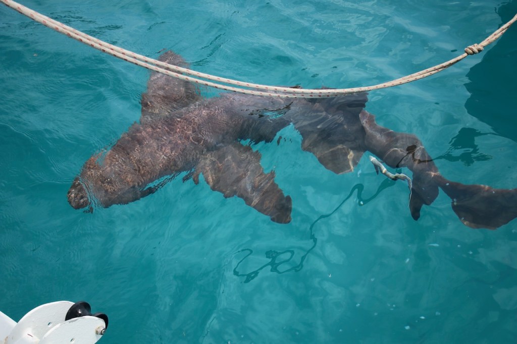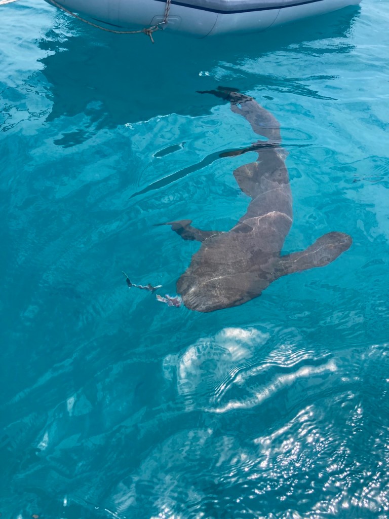 one of the nurse sharks investigating the areaI thought they were quite big 😳 – The dinghy has a length of nearly 3 ma sucker fish following the shark