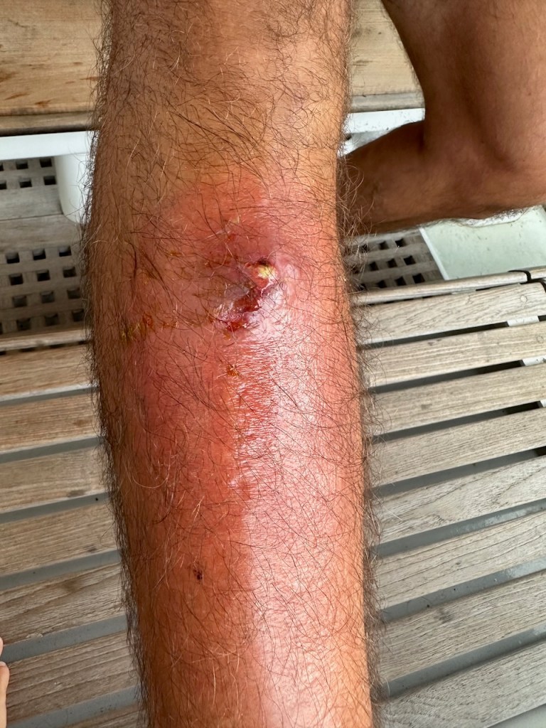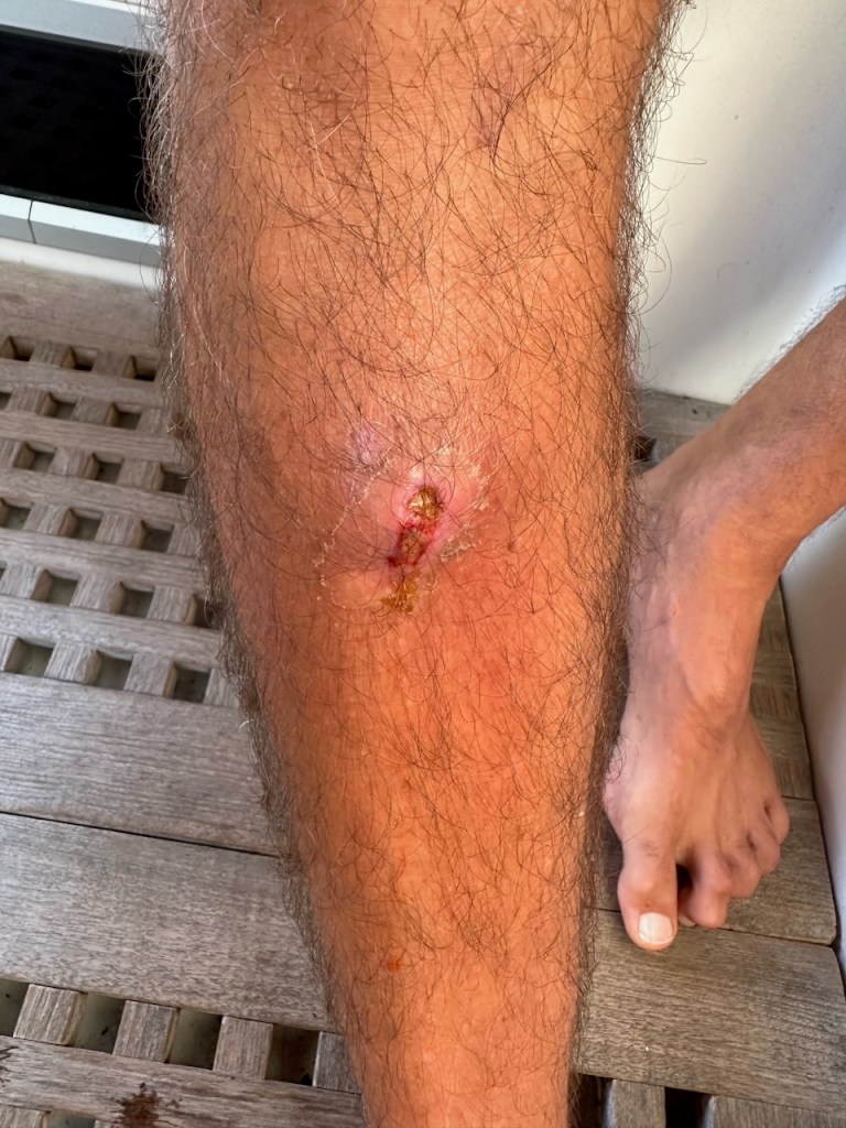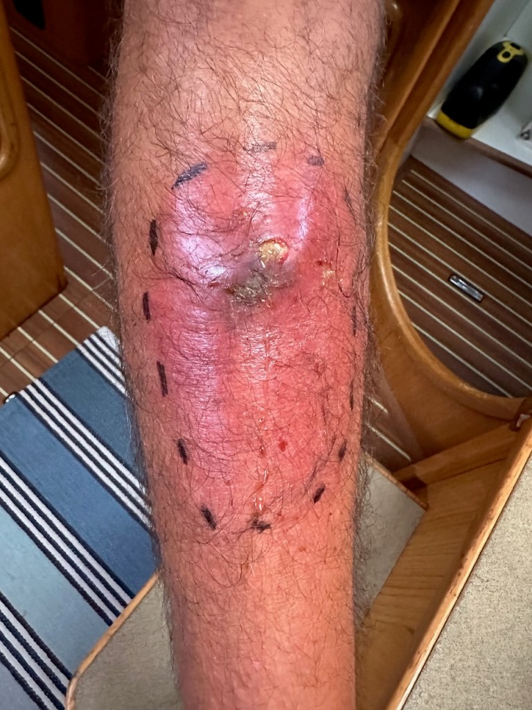 What else did happen? Well, poor El Capitano got a nasty infection on his shin. Already back in Puerto Escoses he realised that he had a small spot on his shin but he didn’t know where it came from. Long story short it got bigger, very red and looked infected. It was time to get in contact with our dear friend Peter who is a sailor and doctor in Germany. When he saw the pics we send him he was rather concerned which in turn made us concerned. He never used to be worried. Was the leg that bad? He prescribed antibiotics which we fortunately had aboard. He also instructed me to make sure the patient didn’t get in touch with sea water and that I made sure that the leg was often lifted higher than El Capitanos heart to release the pressure of the leg. It was heavily swollen at peak time of the infection. He had to take the antibiotics for 11 days and we had to send pics every day to Peter. He had even asked -only just in case- wether we would have been able to see a doctor or a hospital. That got us even more concerned. Don’t let your head cinema scare you off!! What caused this nasty infection? Nobody knew. We were just guessing that it was a sandfly bite which got infected. Anyway the antibiotics seemed to work and the infection sloooooowly disappeared.