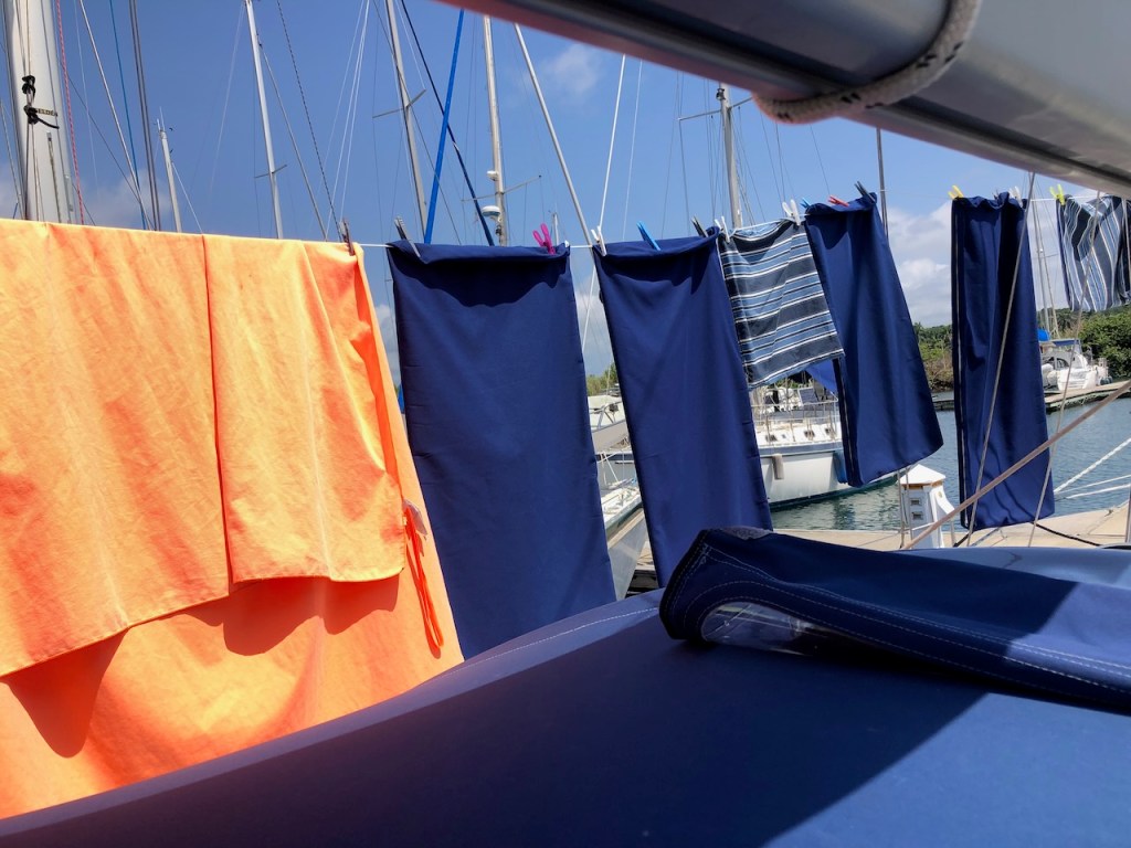 Meanwhile we have been here at Shelter Bay for more than a week. The first 5 days we were just cleaning, tidying up, cleaning and cleaning. Laundry, more cleaning, bleaching. The rainy season does make it easy for mold. If not careful some fabrics tend to catch mold stains and parts of our sunshades were also covered with mold. Kind of disgusting but what can you do? We did try before to get rid of it scrubbing the shades for hours with soap or baking soda but that didn´t really help. Fortunately somebody at the marina told us to use chlorine to kill the mold and so we did. And…OMG I’m in love with bleach!! The shades soaked for 30 min in chlorine and all the mold was gone. I was so happy!! The same with some clothes, soaked for only a few minutes and all the mold stains gone – so easy. Maybe not so healthy but mold isn’t either, right?