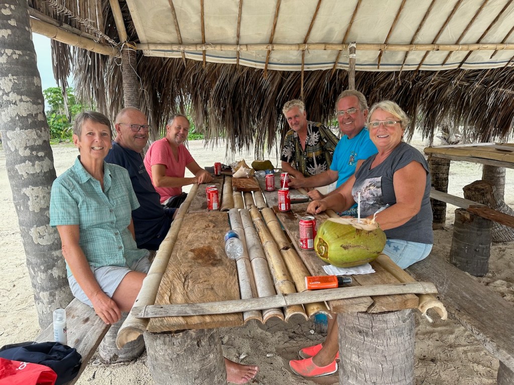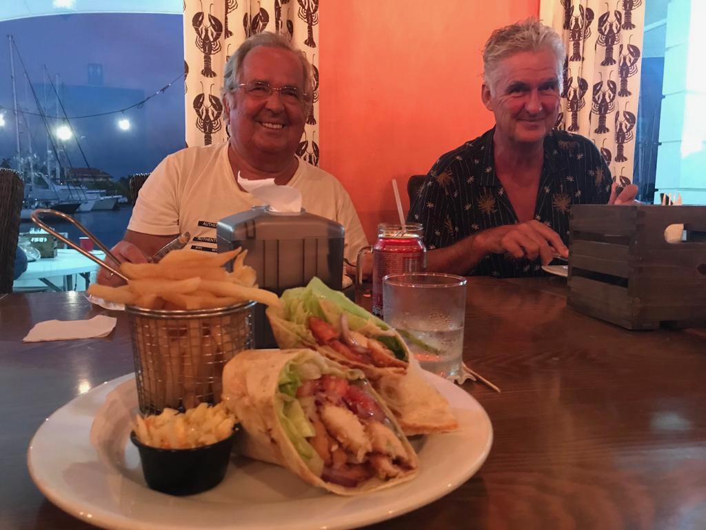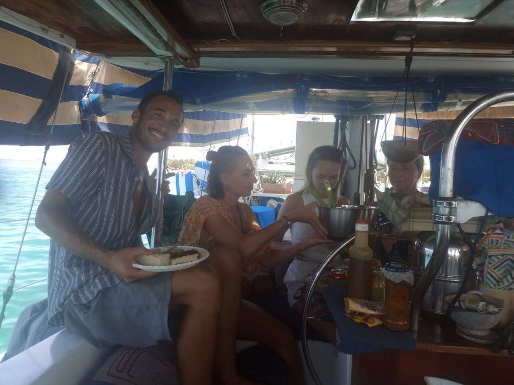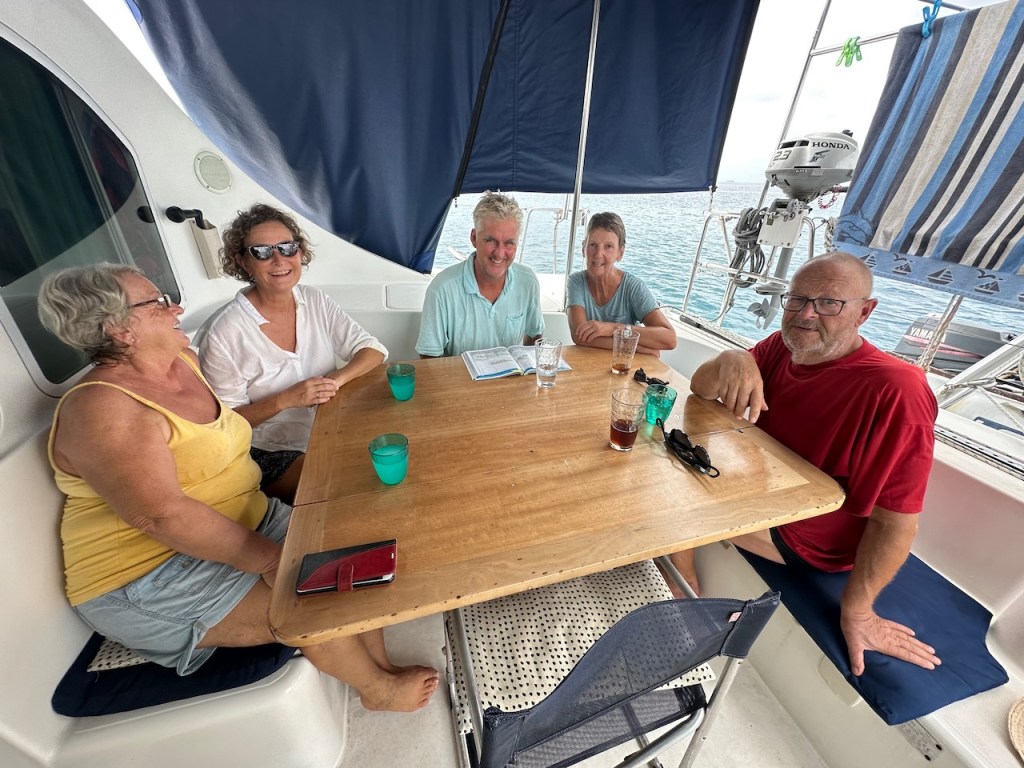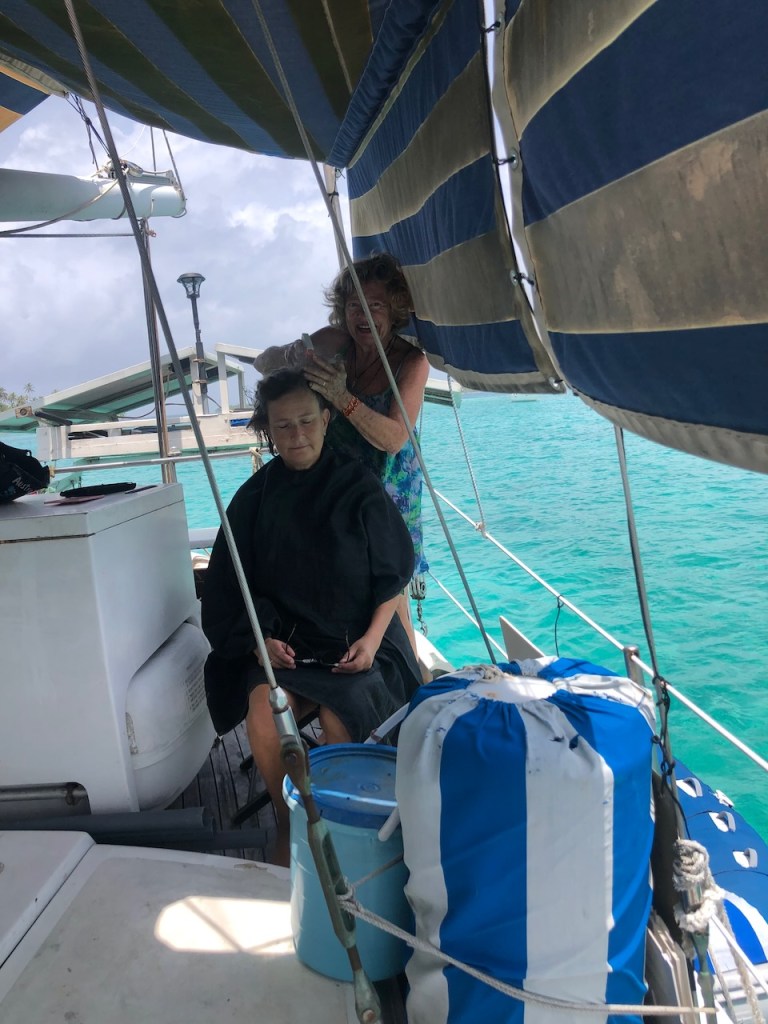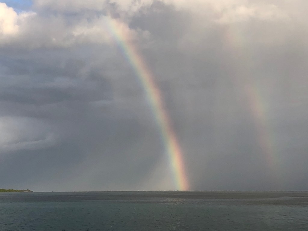 a nice catch the day we arrived at the pooltypical weather in rainy season, the main shore was not visible and often overcastedwe met Uschi and Albert from USI, Albert took the pic and Anne and Reinhardcould have been the day of our first encounter with a Culo de polloand all of us enjoying Ibins food; Anna, Reinhard, Jürgen von Valentin and Albert and UschiHeike and Jürgen from Valentine invited us for a pizza at Ibins to celebrate their recent wedding, the weather was not so pleasantMyrta was showing us how to fast open a coconut, she did it within a minute; I tried to do it the same way and it took me 15 min, I need to improve my opening skillsthat was on Runner , Debbies boat, we had a potluck she invited a few boats to celebrate the 4th of July Ibins “over the water terrace” getting a roofthe water bar the “old” restaurant area, where we had our xmas dinner with the kidsone of the “roofer” , the boys were always in a good mood and providing enough material they could build a roof within a couple of hoursIbins brother in law and Myrtas husband José , a nice guy also always in a fantastic moodDebbie invited us for a dinner at Ibins, thank you dear!!Ibins bread as a pre starterconch ceviche we were eating and the boys were workinga conch I found but this one was too small to eatEl Capitano in thoughts?the new steps to reach the “water bar”my favourite drink pipa, coconut waterwe had invited Debbie for a German breakfast, fortunately we were just done when the squall reached us, not a “Culo de pollo” but a nasty wet squallDebbies mini aquarium on her boat, it keeps her busy finding small fish and then food for them, I had joined her when she found that little lionfishdeb used to be a hairdresser in NY, she offered me to cut her hair who can resist getting a professional haircut?some of Myrtas molasEmily from Restless which we had met first time on the 4th of July potluck, her parents and little sister came to visit themour last day in the pool we said goodbye to Ibin and Debbie and also to Myrta and her sister, am I that tall??? the sudden changing weather sometimes presented nice rainbowsthe pool, on the right “Runner”the day we left Ibin got the roof readyyyyyyybye bye Banedup
