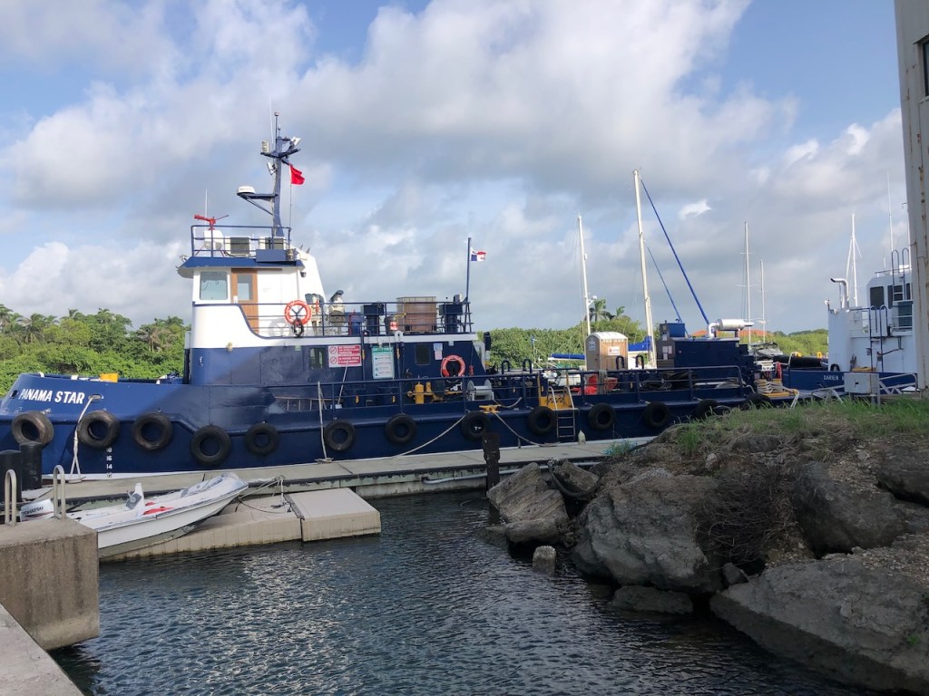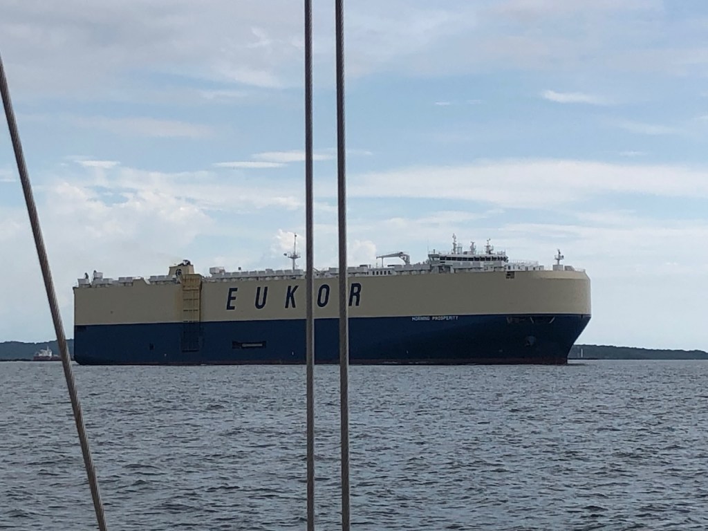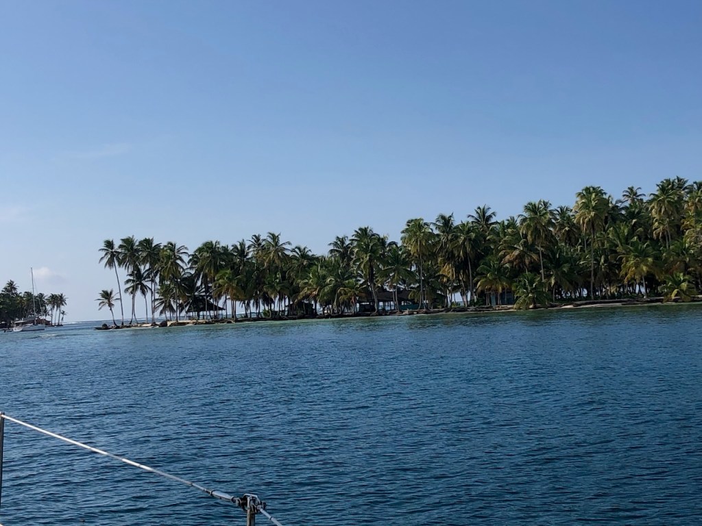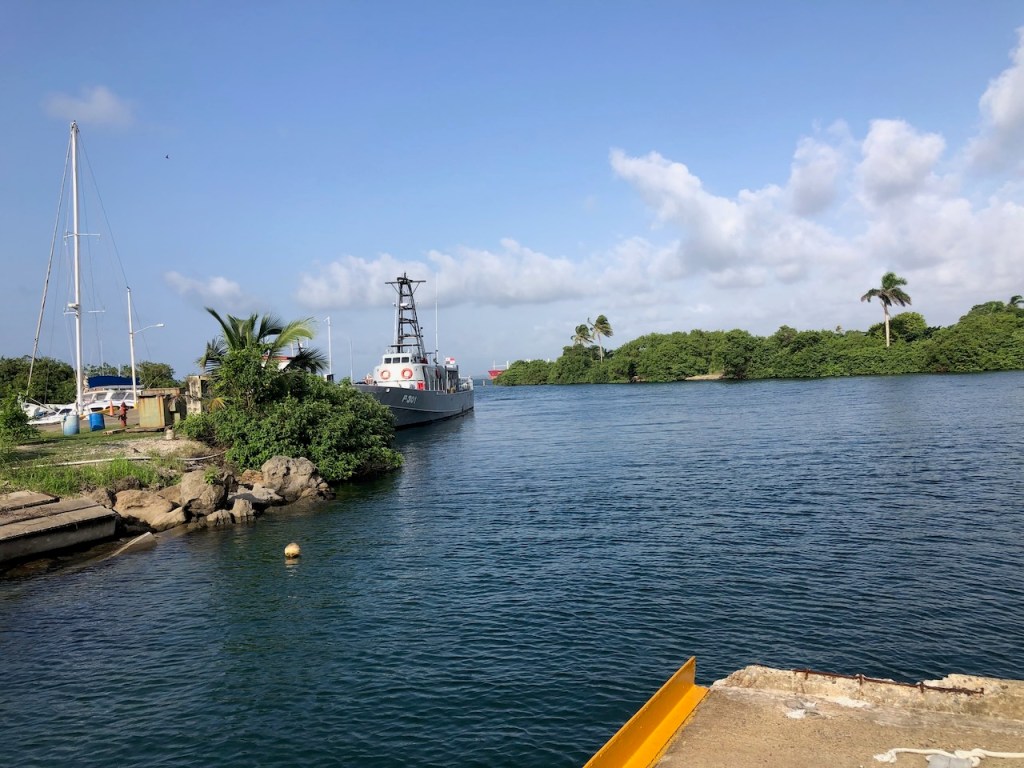 passing the Lemon caysour anchorage at the Southside of Chichime and another sunsetback in Linton Baythat was a strange built catamaran with two masts without stays in the front of each hull, can´t imagine how the sailing is likeapproaching the entrance of Colon this coast guard boat passed us pretty close, the young mariners were friendly waving while passingbig ships everywhere, a huge difference to the San Blas areathis one came rushing out of another entrance, we decided to stay out of his way it looked a little to big for “who is cooler” gameshe was also fast, took only a few minutes until we were back en routethe entrance of the Panamá canal and this big monster just came through heading towards us… we made it😉don’t know what I was trying to capturethe entrance of Shelter Bay Marina