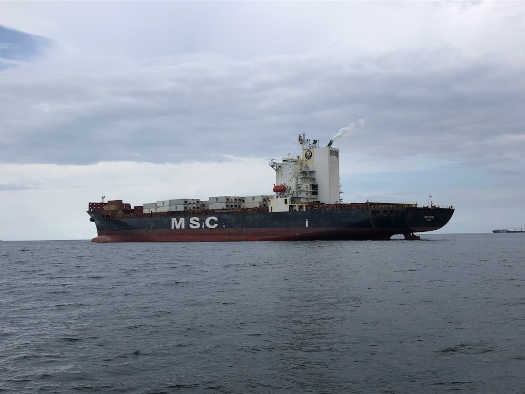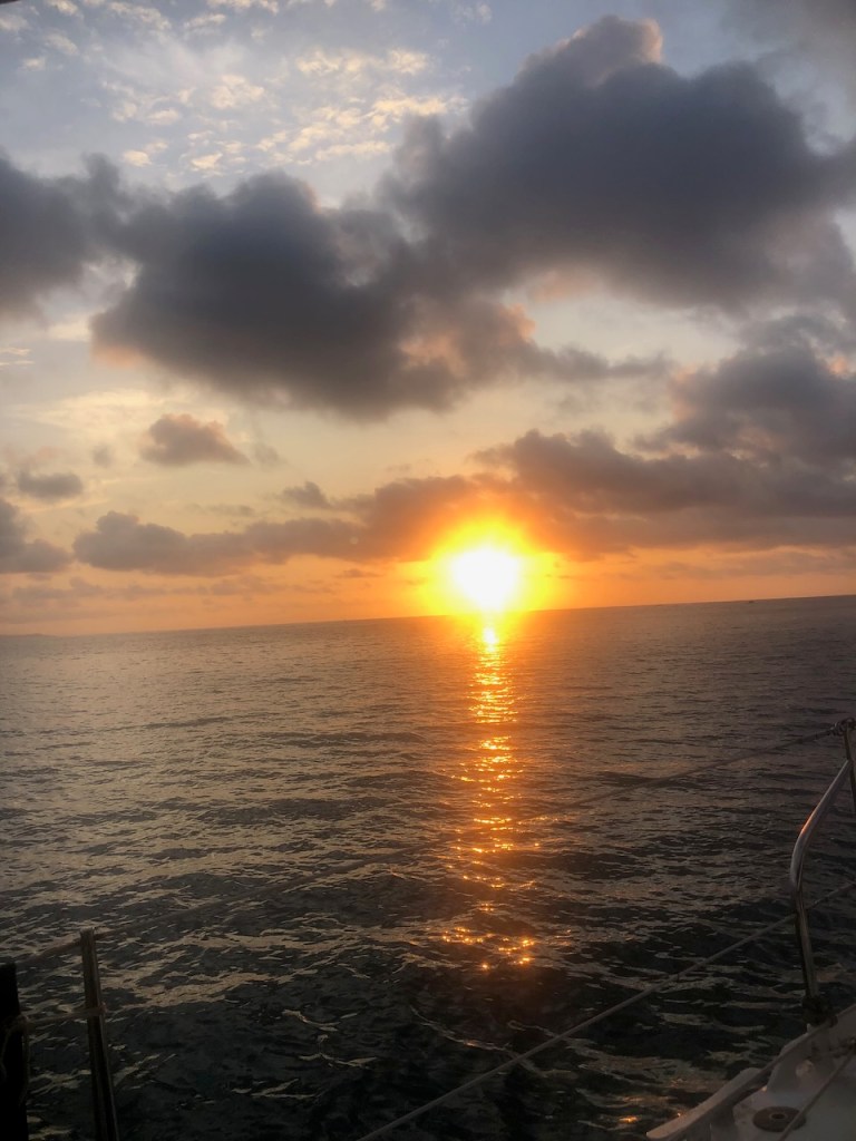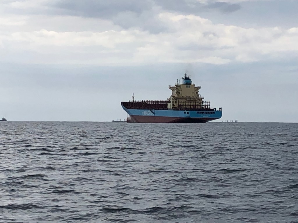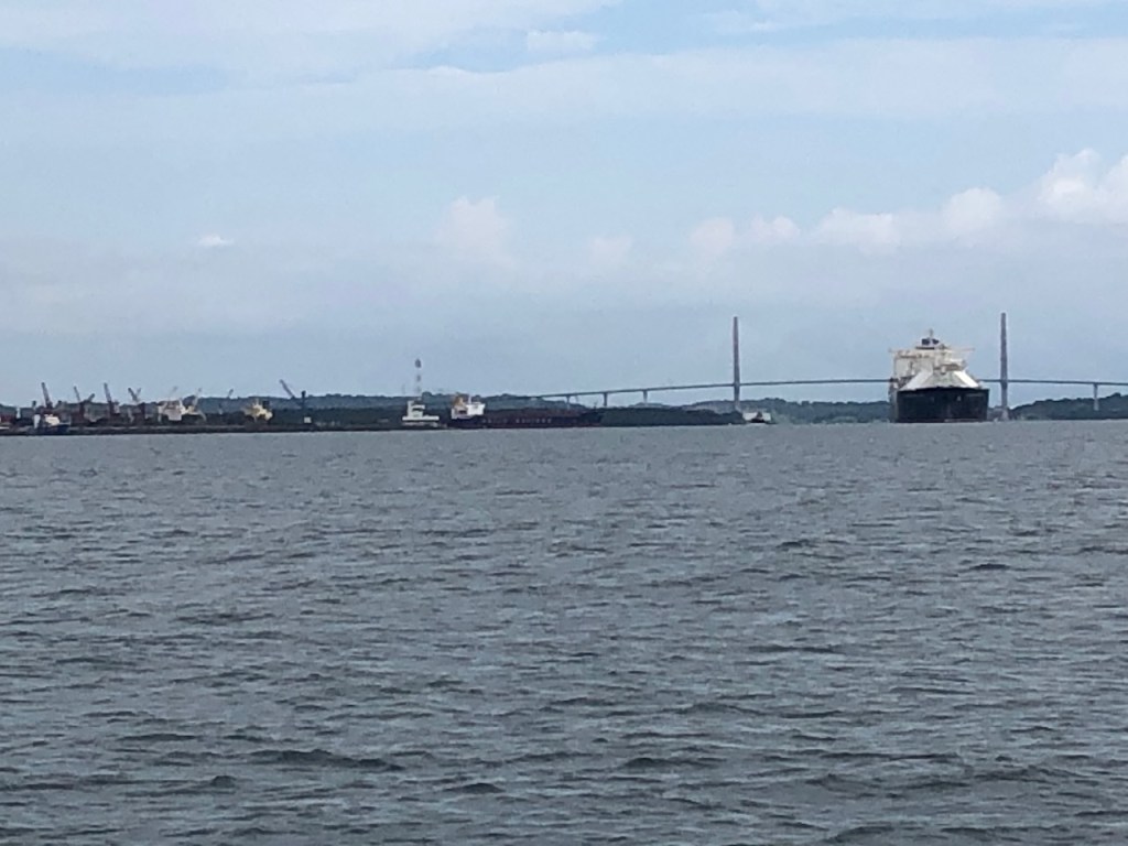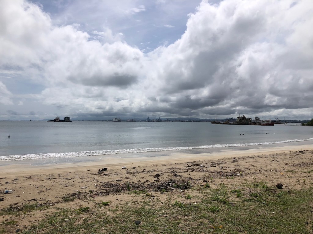 passing the Lemon caysour anchorage at the Southside of Chichime and another sunsetback in Linton Baythat was a strange built catamaran with two masts without stays in the front of each hull, can´t imagine how the sailing is likeapproaching the entrance of Colon this coast guard boat passed us pretty close, the young mariners were friendly waving while passingbig ships everywhere, a huge difference to the San Blas areathis one came rushing out of another entrance, we decided to stay out of his way it looked a little to big for “who is cooler” gameshe was also fast, took only a few minutes until we were back en routethe entrance of the Panamá canal and this big monster just came through heading towards us… we made it😉don’t know what I was trying to capturethe entrance of Shelter Bay Marina