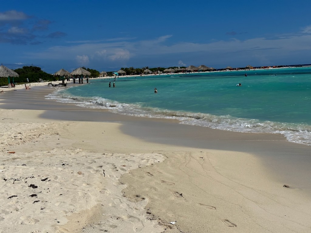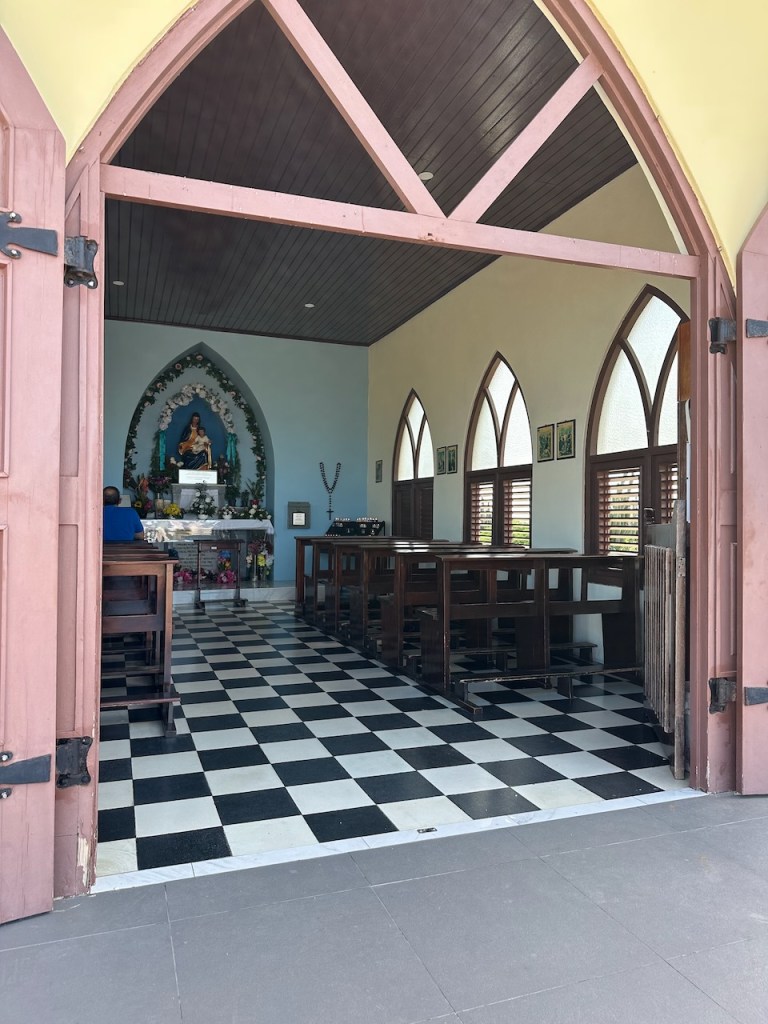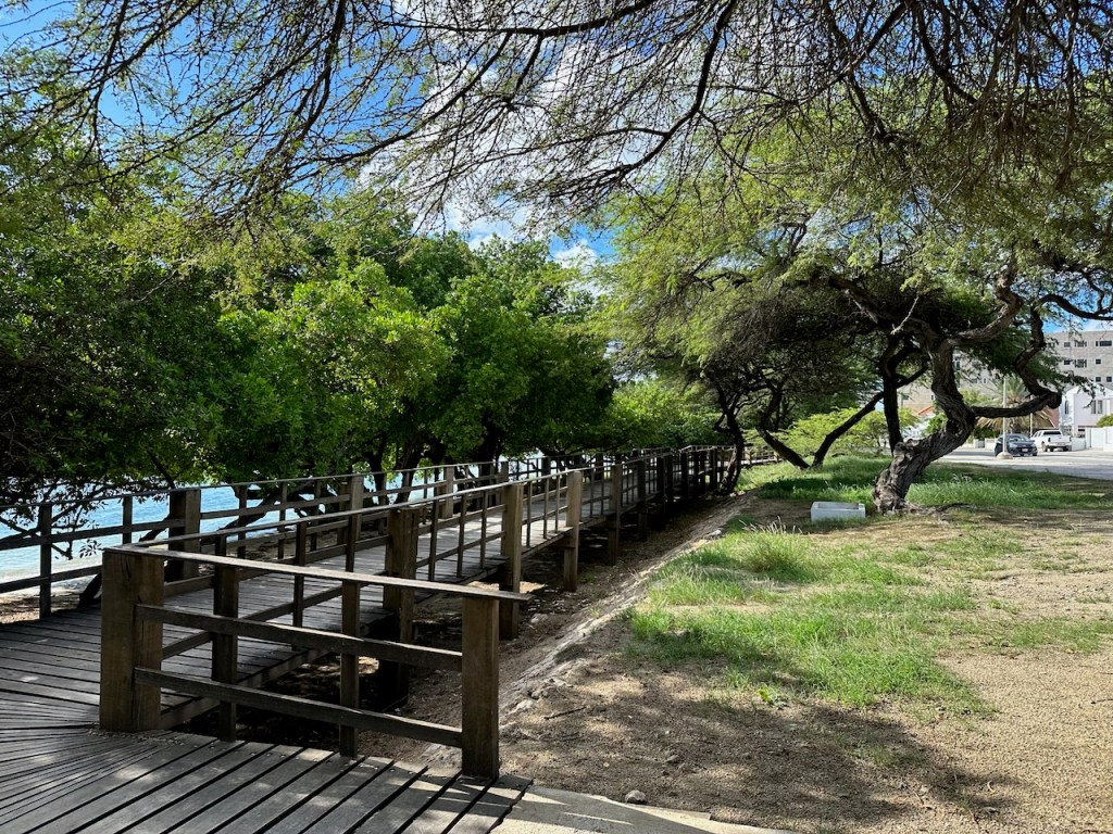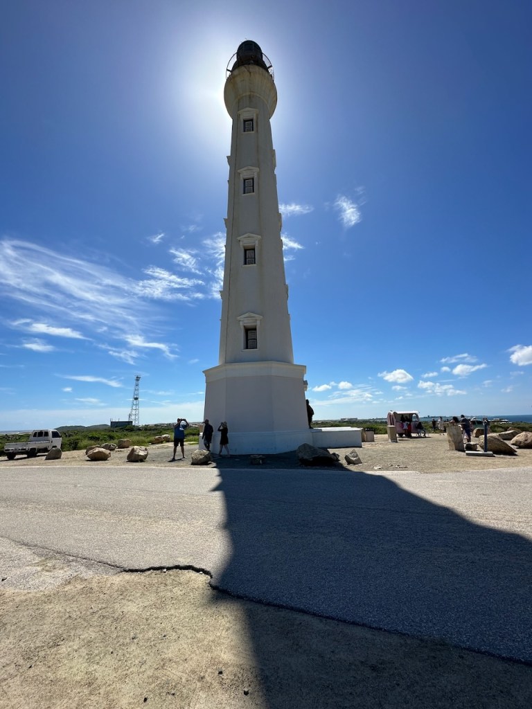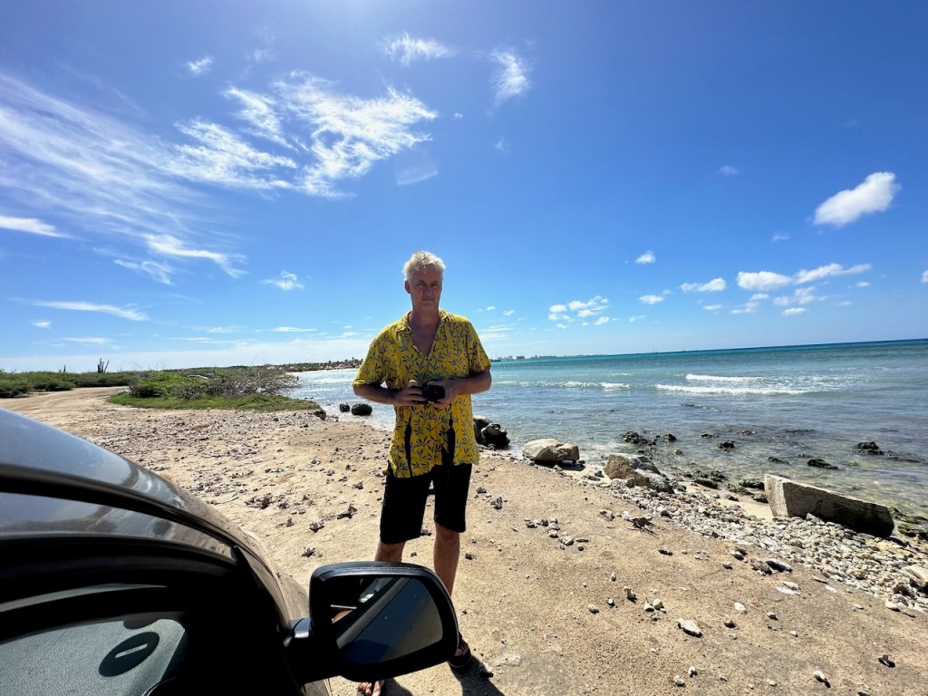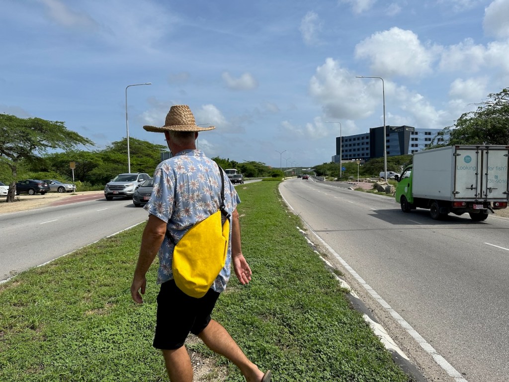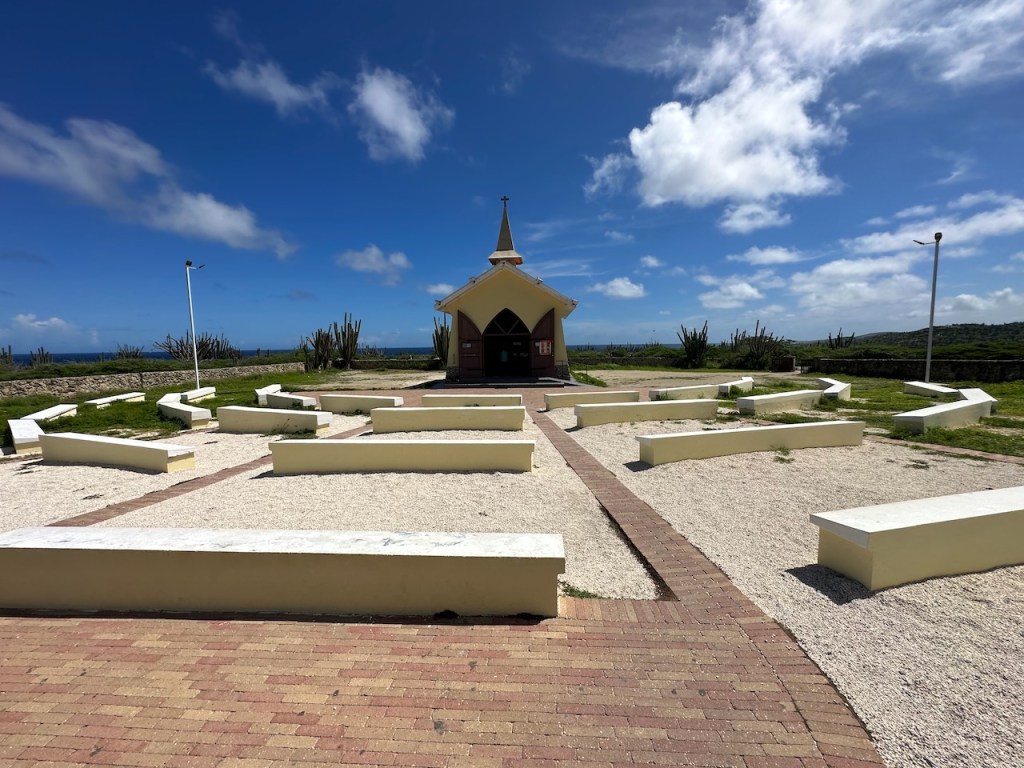 our anchorage was pretty close to the airstrip but it was still quite a walk to the entrancesuch a beautiful walk next to the airstrip, passing planes which were just about to startwe had to take out everything to get to our old genua sail, ain’t it cosy?the grey bag is the one we were looking for, looks so small at the picthat was the bagthe old Genoa needed to come down that was the old one we had to go shore to fold it nicely that would fit back in the bagour first trip with the car was up north to the lighthouse, looking south to the beach where most of the hotels were placed “California Lighthouse”, named after the steamship California, which was wrecked nearby in 1891a quick stop a bit further south stouth still at the west side of Aruba , El Capitano trying to catch me😁a nice capture of Mr. Pelicanjust a house I liked on our way to a chapel, east of “Noord” townvegetation got dry and prickly“Alto Vista Chapel” was built in 1952 on the site of the original, and first, Catholic church built in Aruba in 1750 by a Spanish missionary, Domingo Antonio Silvestre.the chapel was close to the east and rough side of Arubawe stopped at a supermarket, boy was it nice after month being in a huge, well equipped grocery storethe best part was that they had a DJ entertaining the customers while queuing at the cashiers; that was awesome! People didn’t mind waiting and were even enjoying it – well at least we dida quick stop at the very south end of the islandalso in the very south “Baby Beach”, one of the beaches to go in Arubaat our anchorage there was a nice beach bar with a recommended pizza from Italian friends!!! we had to try it of course, it was very good!! the youngsters at the beach bar taking pics from the arriving planesa more fancy beach restaurant only a few steps further somewhere at Oranjestadcatching the sunset at the corner of the small marina in OranjestadSeaport Village Marina