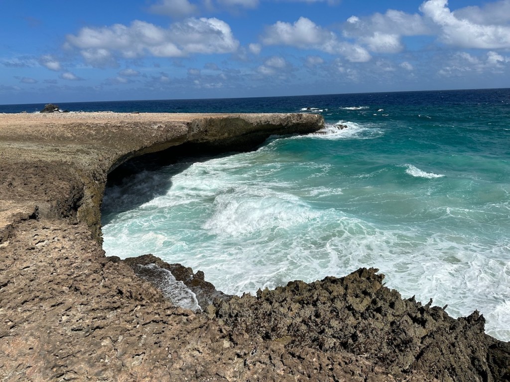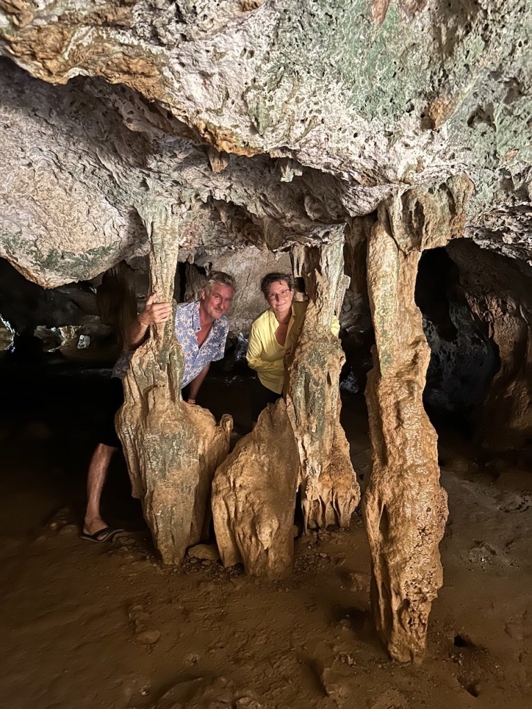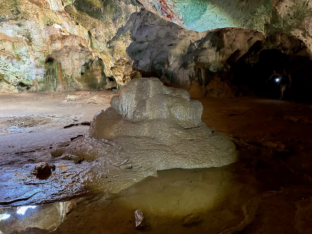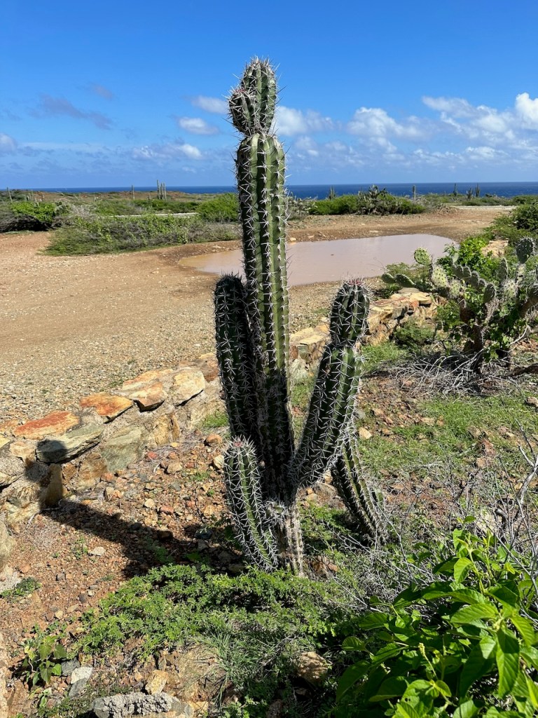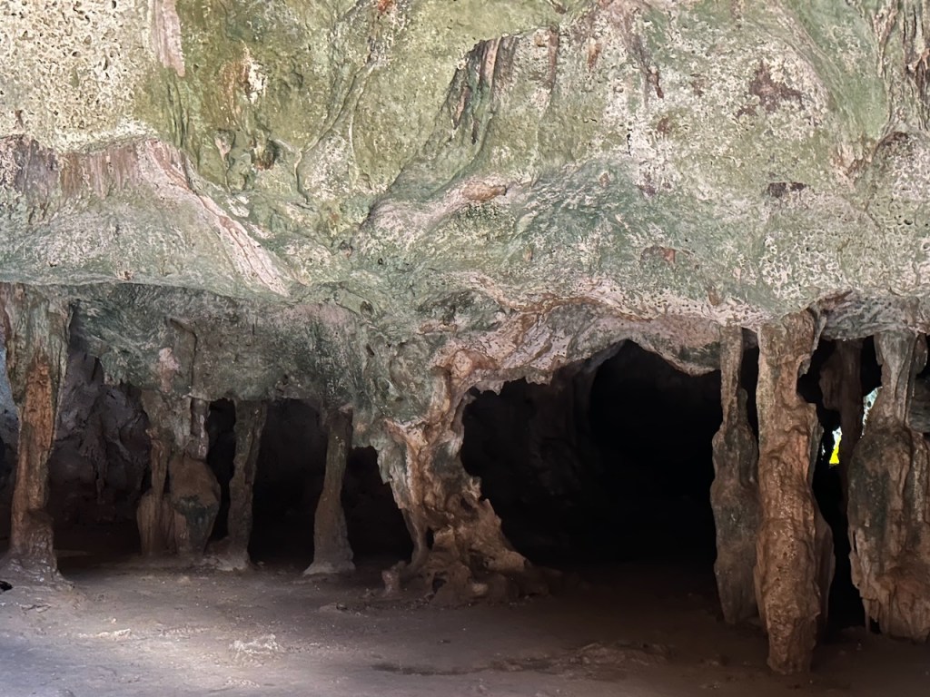 this cute fellow wasn’t afraid of us at all, I could almost touch him before he very bored jumped into the water, oh that was next to where we left our dinghy to head to the Parccacti at the Arikok Parc, a very dry areaEl Capitano and the prickly flora, it did look green when we were there thanks to more rain than usual a steep road to reach the shore an beaches, it would have been better to have a 4×4 wheel drive, 🤷♀️the rocky shoreour air-conditioned transportationvery cool El CapitanoFontein Caveit was very dark, hard to take any picsthe ruins of “Plantation Fontein” the Arikok guide said:”Fontein is an area of high natural and cultural value for Aruba. Plantation Fontein is named after the natural water source in the area, where the water seeps from the higher limestone plateau. In the 18th century, the West India Company allowed its cattle to graze nearby. A cowman supervised cattle and lived here in a stone house. At the water source, a courtyard or bakoval was laid out with banana trees, coconut trees and other crops. Fontein was first transferred as private property to the widow of Commander I.F.W. Gravenhorst and his family in 1839, after which the property was passed on to several diferent owners. The permanent water source made it possible in the 20th century to farm commercial crops, and today the water spring can be seen flowing into the pond located in the back of this estate. The entire property is now protected and in August 2022 officially became part of the Parke Nacional Arikok.”the water springwe passed many, many goatsQuarikidiri CaveThe cave was a limestone formation with two caverns and natural skylights in the ceiling.the best part for me was the natural sculpture of a woman’s head – crazy!!!this looked to me like a girls head with side pig tailsa stone heart on top of us🙈, a guide said it was a must do picsame here, a must do pic, a natural framed picture…the end of the Parc, with our little car we weren’t able to reach more of the Parc sights