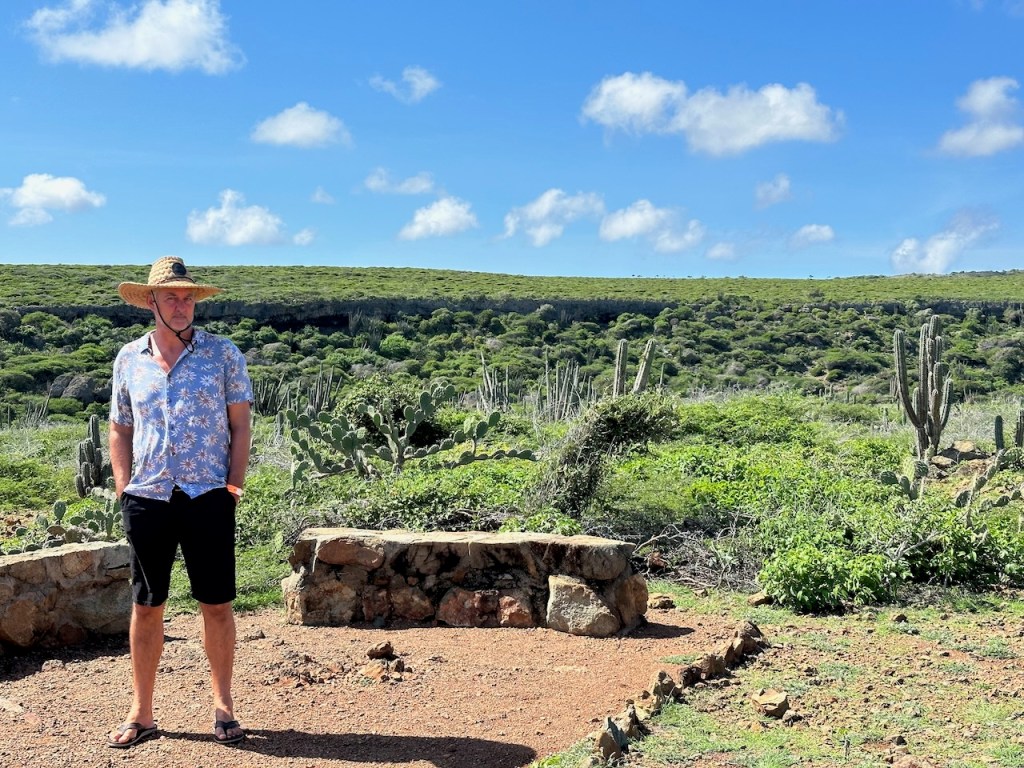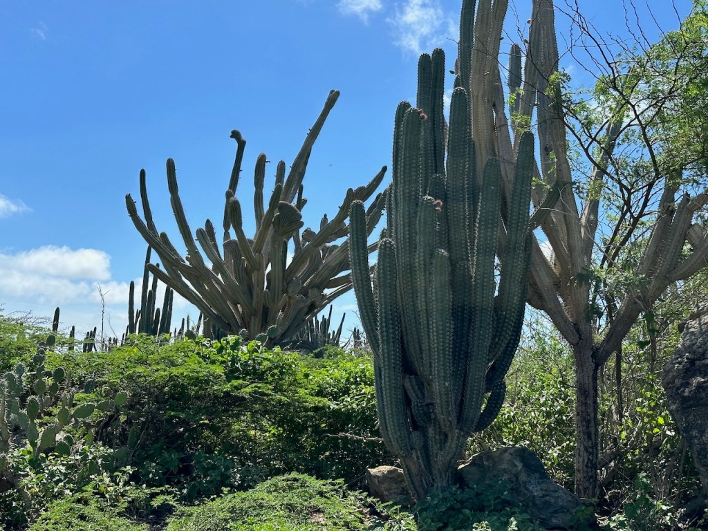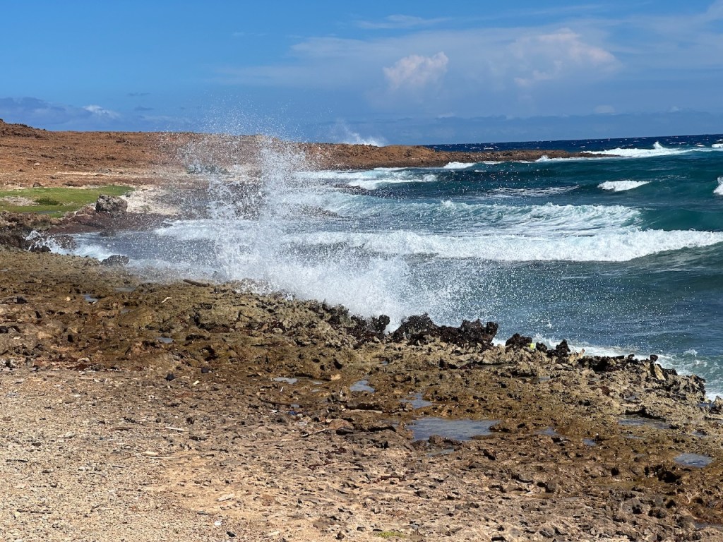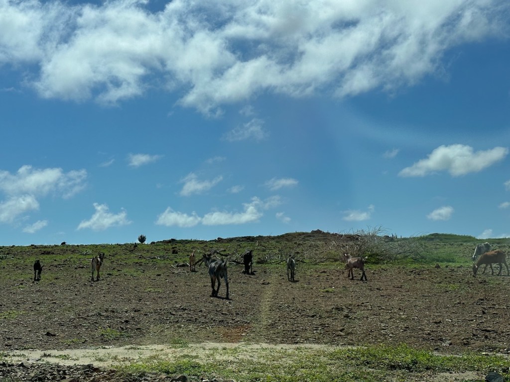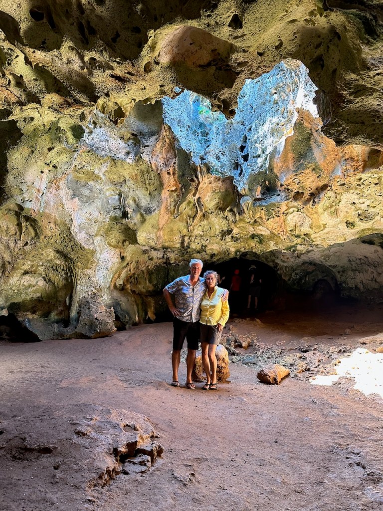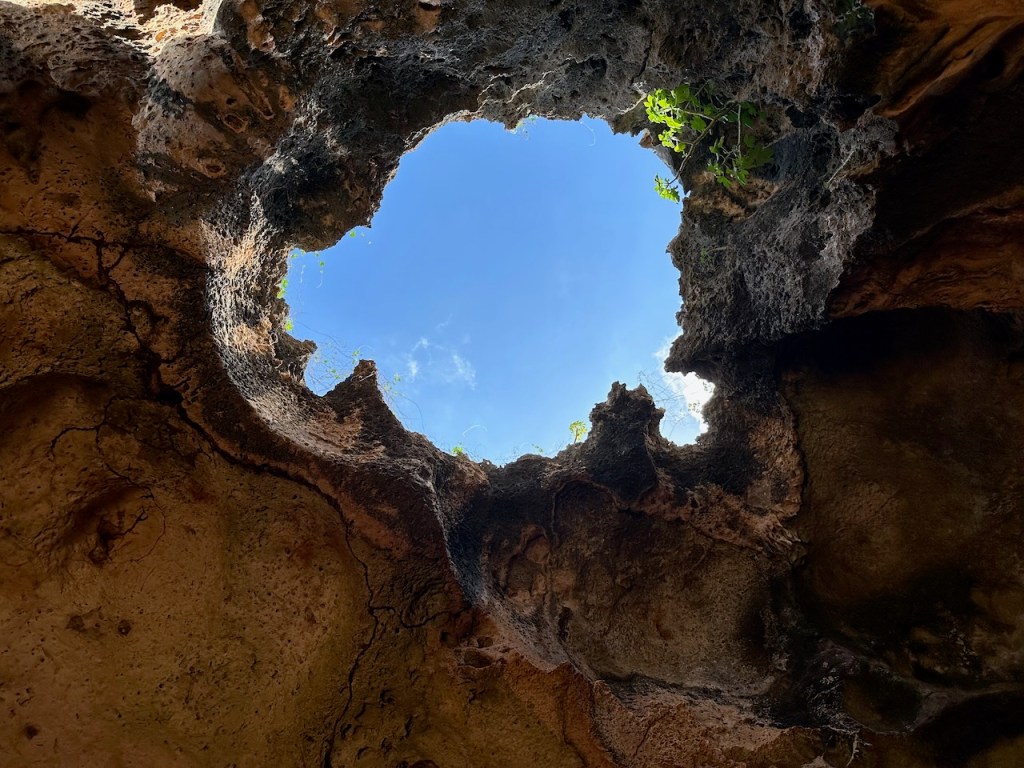 this cute fellow wasn’t afraid of us at all, I could almost touch him before he very bored jumped into the water, oh that was next to where we left our dinghy to head to the Parccacti at the Arikok Parc, a very dry areaEl Capitano and the prickly flora, it did look green when we were there thanks to more rain than usual a steep road to reach the shore an beaches, it would have been better to have a 4×4 wheel drive, 🤷♀️the rocky shoreour air-conditioned transportationvery cool El CapitanoFontein Caveit was very dark, hard to take any picsthe ruins of “Plantation Fontein” the Arikok guide said:”Fontein is an area of high natural and cultural value for Aruba. Plantation Fontein is named after the natural water source in the area, where the water seeps from the higher limestone plateau. In the 18th century, the West India Company allowed its cattle to graze nearby. A cowman supervised cattle and lived here in a stone house. At the water source, a courtyard or bakoval was laid out with banana trees, coconut trees and other crops. Fontein was first transferred as private property to the widow of Commander I.F.W. Gravenhorst and his family in 1839, after which the property was passed on to several diferent owners. The permanent water source made it possible in the 20th century to farm commercial crops, and today the water spring can be seen flowing into the pond located in the back of this estate. The entire property is now protected and in August 2022 officially became part of the Parke Nacional Arikok.”the water springwe passed many, many goatsQuarikidiri CaveThe cave was a limestone formation with two caverns and natural skylights in the ceiling.the best part for me was the natural sculpture of a woman’s head – crazy!!!this looked to me like a girls head with side pig tailsa stone heart on top of us🙈, a guide said it was a must do picsame here, a must do pic, a natural framed picture…the end of the Parc, with our little car we weren’t able to reach more of the Parc sights