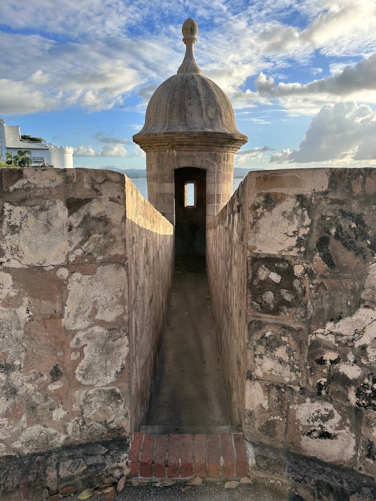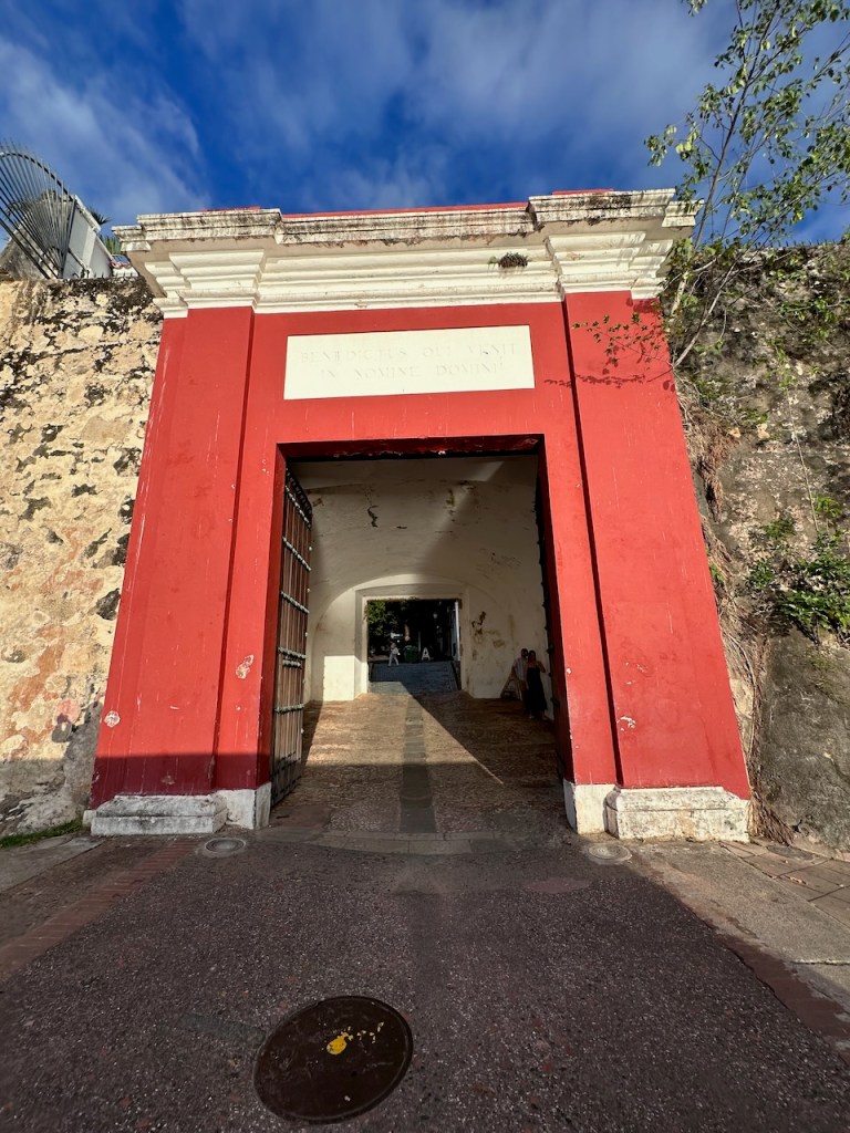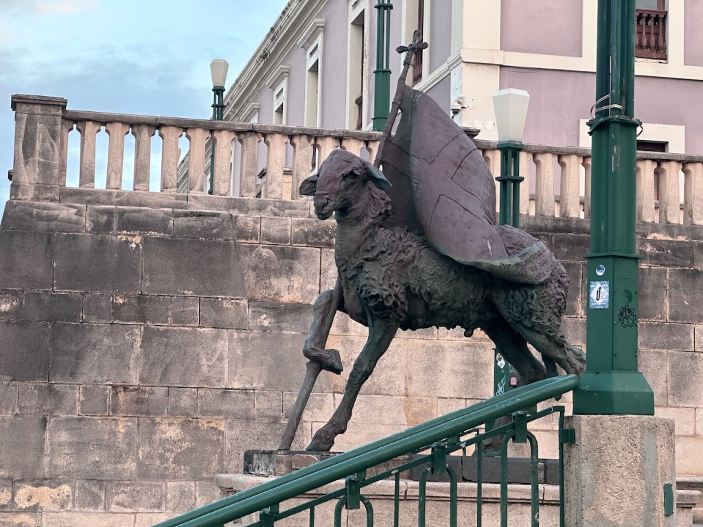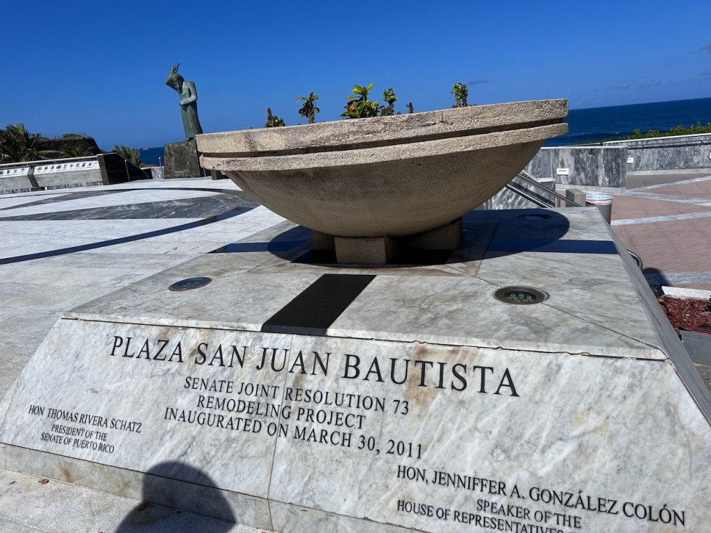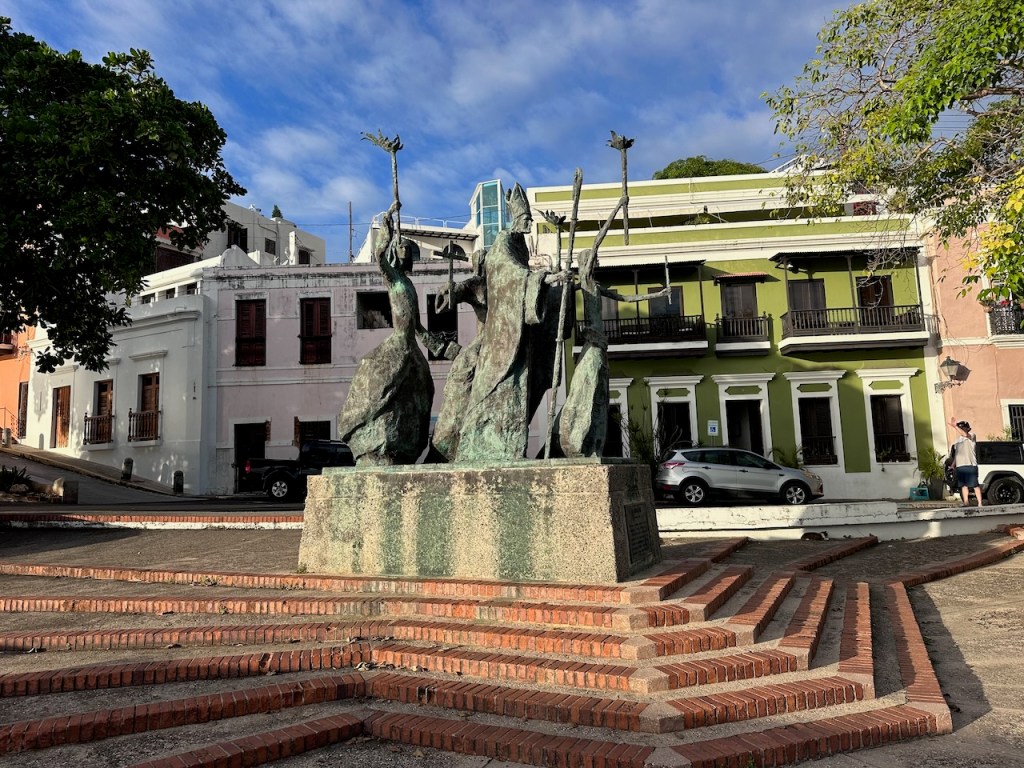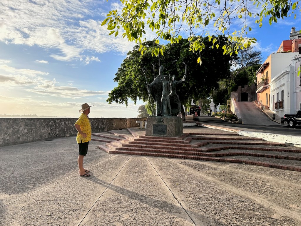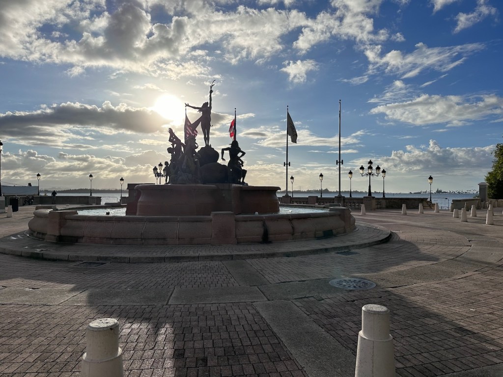 this fountain reminded me of Rome – the old town had such a nice European touch, I wonder if Columbus hadn’t invaded all the Caribbean island how it would look like todayIsabel de Trastamara, reina católica de Españaa part of the very thick and tall wall, rising 40m from the Atlantic shoreline with 5,5 to 7,5 m thick walls, pretty amazing San Juan Gate, it was the last remaining gate of former 5 gatesPlazuela de la Rogativathe bay of San Juan and the gate on the lefta crenel in the wall, here one can see how thick the wall waswe were already up the wall walking to the fortresswhat an unusual street signel Morroup high on the fort we had great views in all directionssunset sailing catand big ships leaving those ships are huge, the wall on this side was 40 m!!!that is the relatively small entrance of the huge bay ; it can get tricky for small vessels to enter or leave in rough weatherthe chapel of The Santa María Magdalena de Pazzis Cemetery seemed to enjoy the last rays of the sunset the lady was sitting in the openings of the wall watching the cemetery and the seaPlaza del CuartelPlaza de San Jose Plaza del Quinto CentenarioPlaza del Quinto Ce is a modern square in Old San Juan inaugurated in 1992 to commemorate the 500th anniversary of the European discovery and Spanish conquest of PR and the Americas and the first European settlement of San Juan; the square is bound by sculptures representing the Agnus Dei and the Lamb of God one of the symbols of San Juan ; I’m not sure one this wasThe main feature of the square is the ‘Teluric Totem’, the name popularly and locally used for the Plaza del Quinto Centenario; this sculpture represents the historic but violent first meeting between the original native inhabitants of Puerto Rico and the European colonizers.