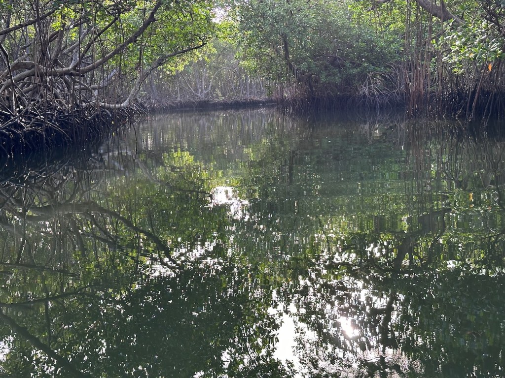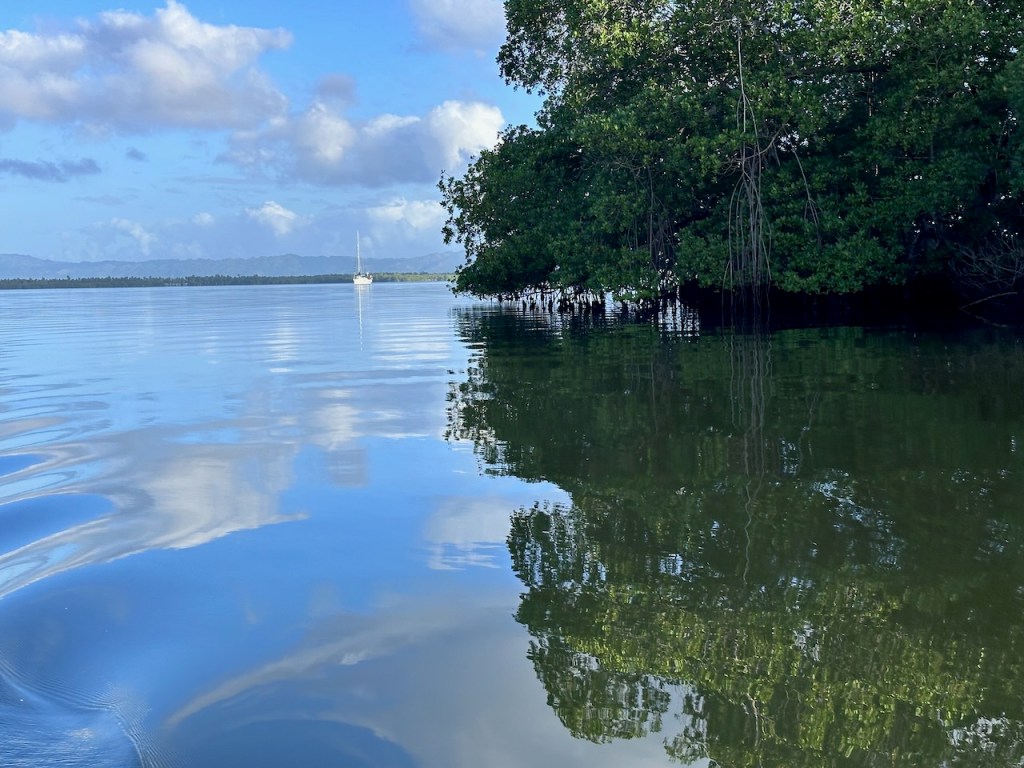 We anchored close to a small river mouth, “Río Caño Hondo”. This river meanders through the mangroves and leads to a little dock somewhere in the park. In the early morning of the next day we jumped into our dinghy and started the trip through the mangroves. What can I say? I know, I keep repeating myself but hey it was just so so incredibly beautiful. Calm, quiet and peaceful. Pictures don’t really show it but slowly rowing through a mangrove river is somehow magical. One seems to be in another world…No,no,no I am not exaggerating!