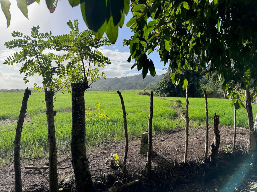 We had read that there was a cozy eco lodge in the park, which was only a few miles walk away from the dock. As it was still early in the morning – we didn’t have any breakfast yet, we were hoping to get a nice, big breakfast at the lodge. Again the walk there was more than pulchritudinous (hahaha just looked it up, it means beautiful- just in case somebody doesn’t know; I can’t even pronounce it, just wanted to use another word). I was surprised to see paddy fields. Had no clue that the DR would produce rice but anyhow I loved them. The fields (see first pic) looked so lush and green and in the back the mountains – what a picture!