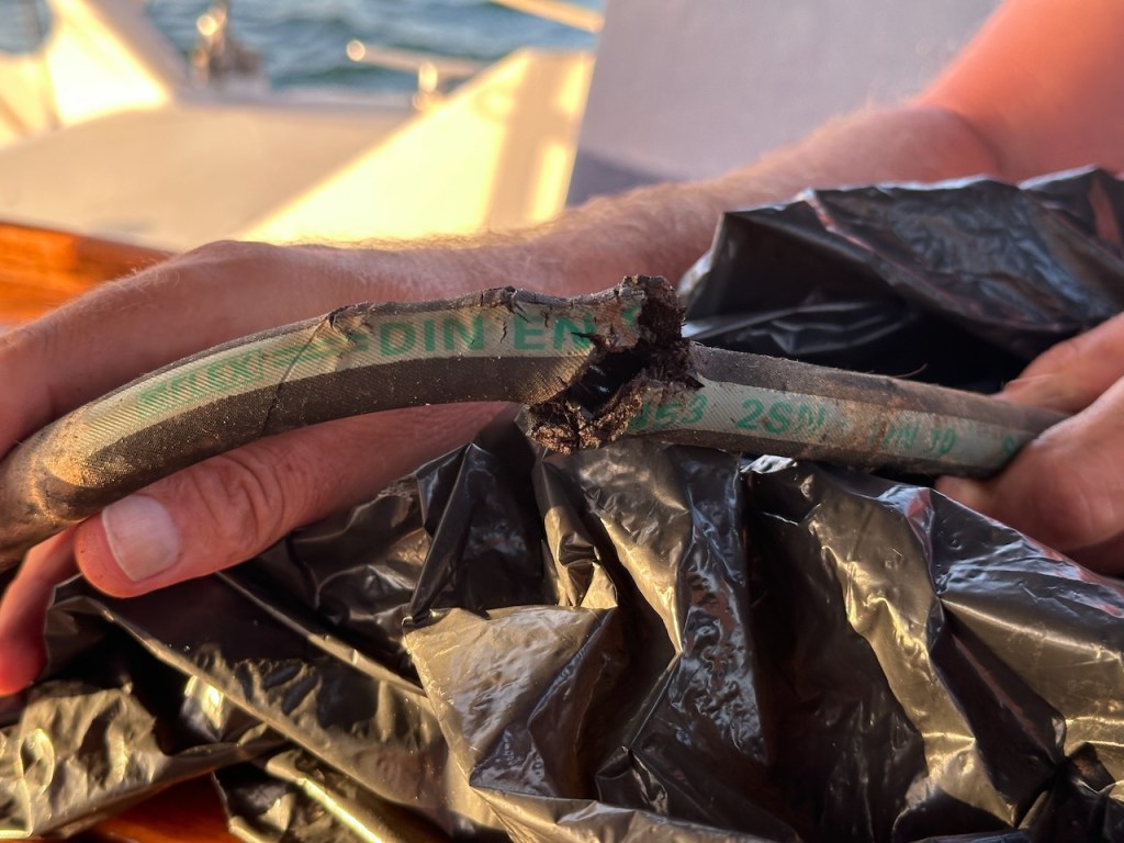 Those were the nice parts of our trip to Samaná. The annoying part happened on the little leg from the other anchorage. Our dear and very trusty autopilot was suddenly struggling, then suffering and shortly after couldn’t steer anymore. Damn! What a bummer! To give the non sailors an idea, a boat without an autopilot could be maybe compared to driving a big truck without a steering booster. Imagine a 2 days passage steering the whole time – that would be extremely exhausting. Long story short we needed to fix the problem before thinking of going further to the Bahamas. Luckily we have a great handyman aboard. El capitano managed to find the source of the trouble pretty fast. One of the high-pressure hoses of our hydraulic autopilot system was leaking. No pressure, no steering as easy as that. After taking out the hoses, it was visible that as well the second hose was very aged and at the limit of its life. The harder part now was to find out where to get those high pressure hoses and even worse where to get the right fittings. American and British fittings are only slightly different and not even visible with the eye. With a problem like that we decided to go to Bahía Marina Samaná.