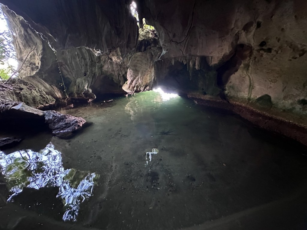 The name of the cave was “Cueva de la linea”. Found deeper in the forest, this vast cave was filled with Taino (historic indigenous people of the Caribbean) drawings, giving us a better sense of Taino religion and culture before their society’s ultimate demise with the arrival of Europeans over 500 years ago. Well to be honest we did see some drawings but we couldn’t really get what those meant. We should have listened more to the nice guide. As well, we both somehow are not so amazed by caves. It was dark, slippery and we always needed to watch our heads. Of course it was special but didn’t get us super excited. Yet, on our list was another cave named “Cueva de la Arena” that one was located on a pretty secluded beach. The cave’s several waterfront caverns held as well Taino carvings in the rock and sleepy bats in their natural habitat. For whatever reason, here we were the first visitors that day. That was nice as we were actually able to see the bats. I had the impression when more people were in the cave the bats didn’t move anymore. We liked this cave way better. The waterfront caverns looked very special with their spooky sunlight rays and water splashing in.
