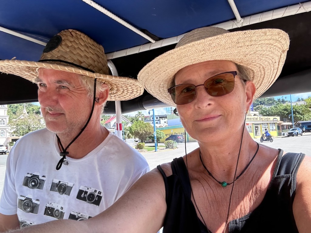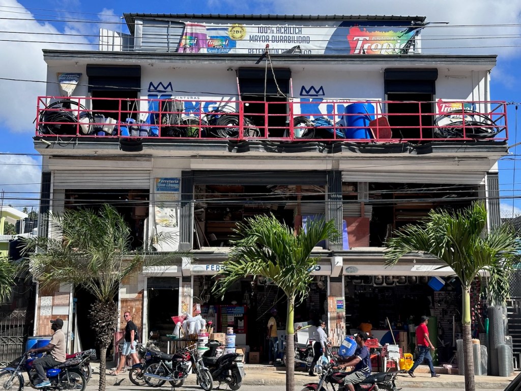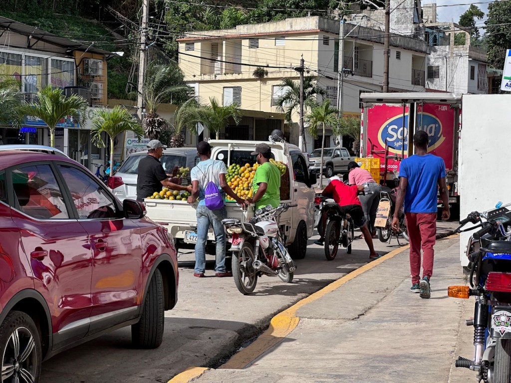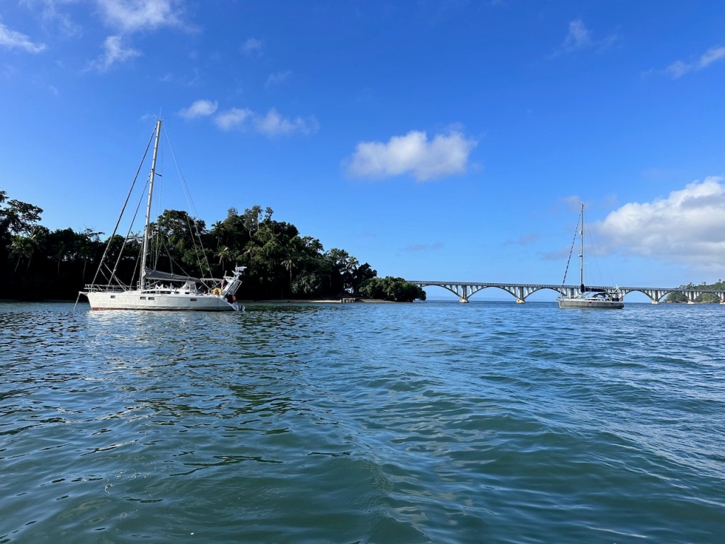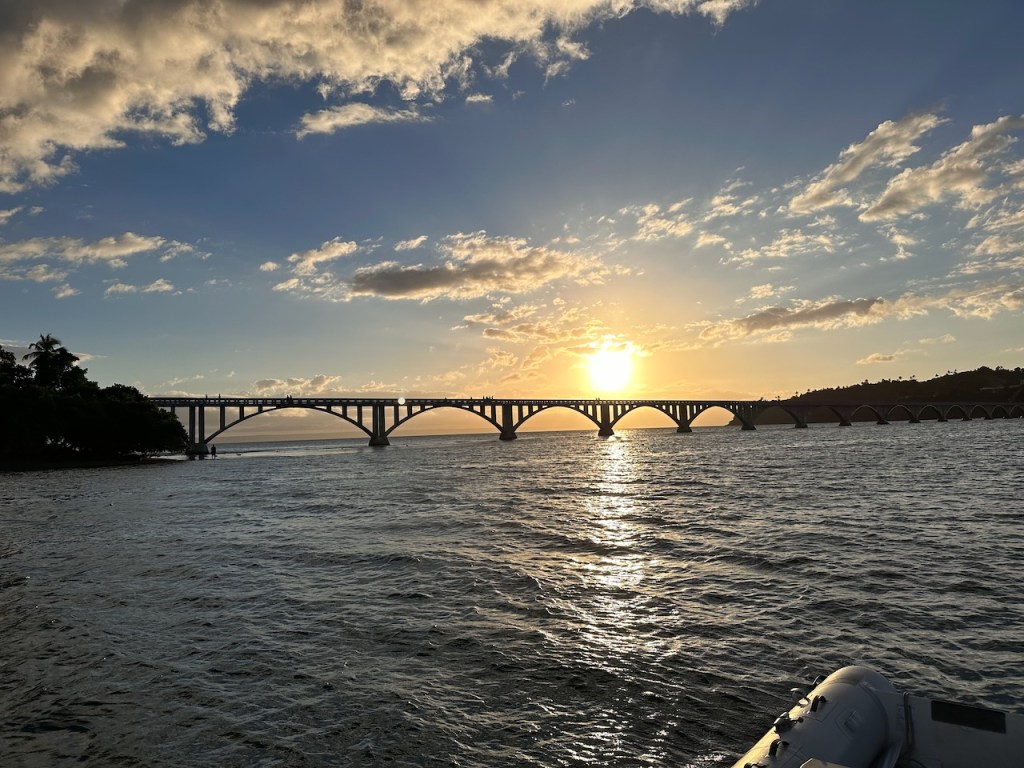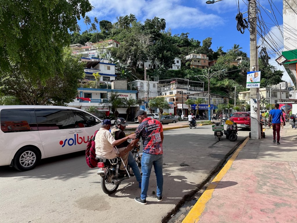 sitting in the Moto taxi to ride to another ATM, still a bit tired from our tripstreet vendors everywhere as well as small moto bikesamazing, this old guy could hardly walk but managed to sit on the back of this bike; the other man helped him and handed over his sticka stream in the middle of the town with horses grazing – so nicea fairly modern churchtwo Ovni’s in the same anchorage – that doesn´t happen often; of course we had a little chat with the ownersworking close to a church maybe helps to survive scary jobs?saddle on a fence in the middle of the village – I liked thatthe farmers market was great, the products all came from just around the corner, the DR produces a lot of veggies and fruitthis guy was cutting cabbage in an unbelievable pacea typical store and everywhere moto bikesLos Puentes de Samaná or the Bridges of Samaná, are three pedestrian bridges that are linking the town of Samaná with the islands Cayo Linares and Cayo Vigia; one can see only the longest bridge here