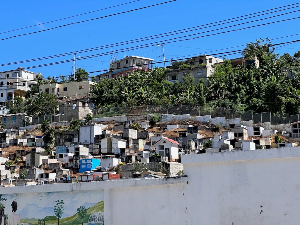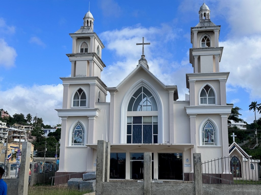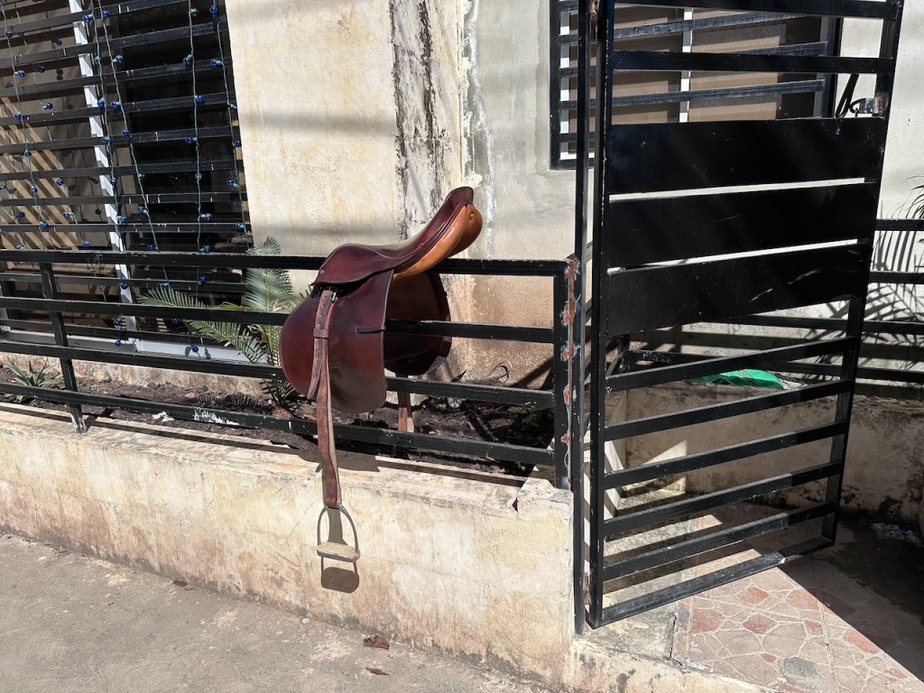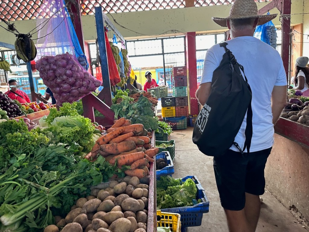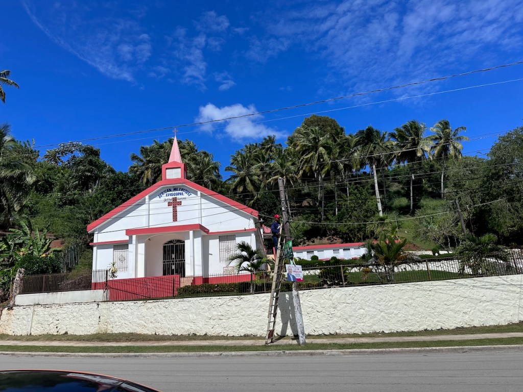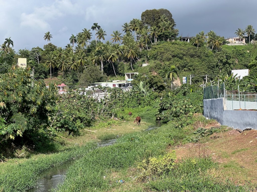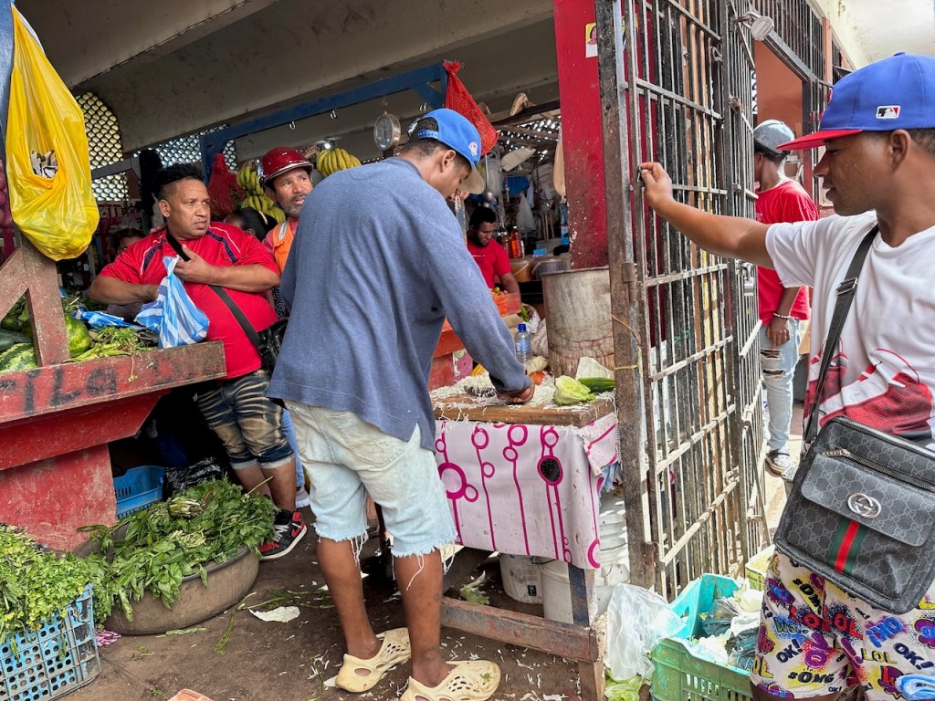 sitting in the Moto taxi to ride to another ATM, still a bit tired from our tripstreet vendors everywhere as well as small moto bikesamazing, this old guy could hardly walk but managed to sit on the back of this bike; the other man helped him and handed over his sticka stream in the middle of the town with horses grazing – so nicea fairly modern churchtwo Ovni’s in the same anchorage – that doesn´t happen often; of course we had a little chat with the ownersworking close to a church maybe helps to survive scary jobs?saddle on a fence in the middle of the village – I liked thatthe farmers market was great, the products all came from just around the corner, the DR produces a lot of veggies and fruitthis guy was cutting cabbage in an unbelievable pacea typical store and everywhere moto bikesLos Puentes de Samaná or the Bridges of Samaná, are three pedestrian bridges that are linking the town of Samaná with the islands Cayo Linares and Cayo Vigia; one can see only the longest bridge here