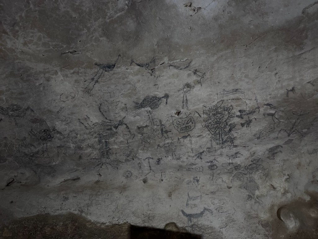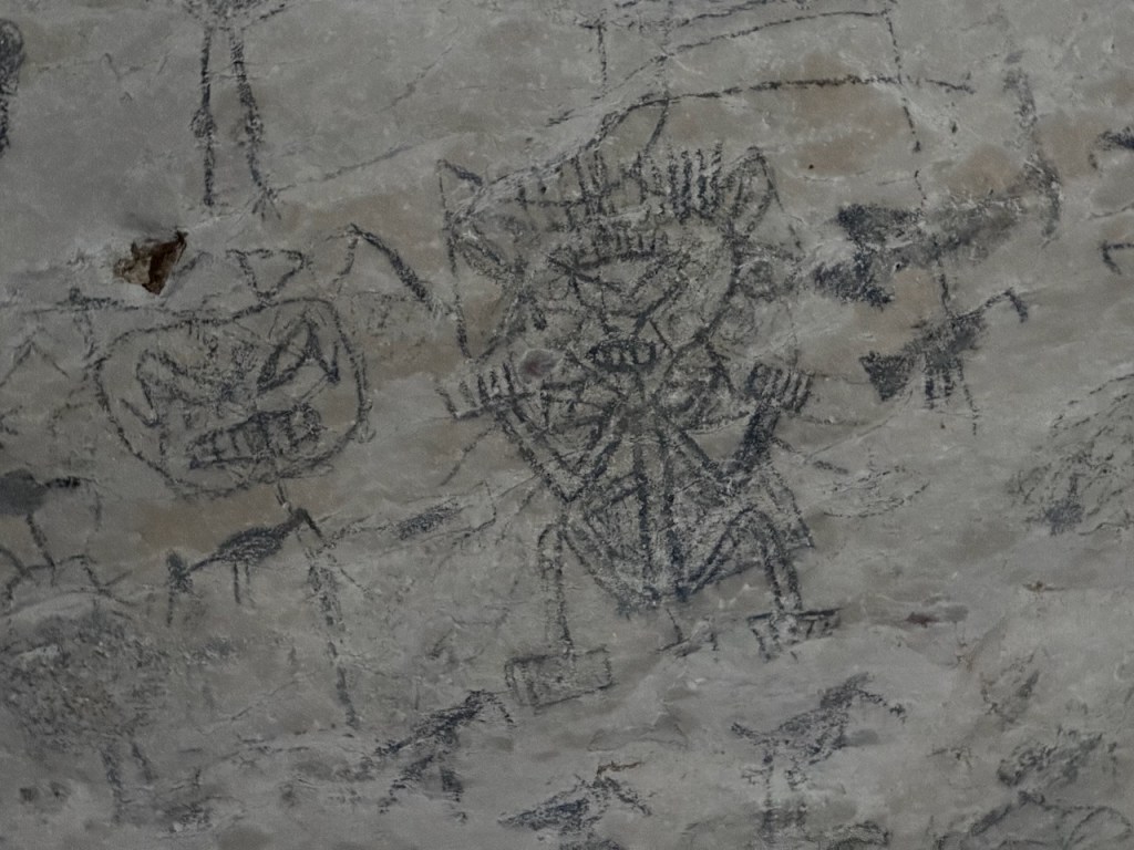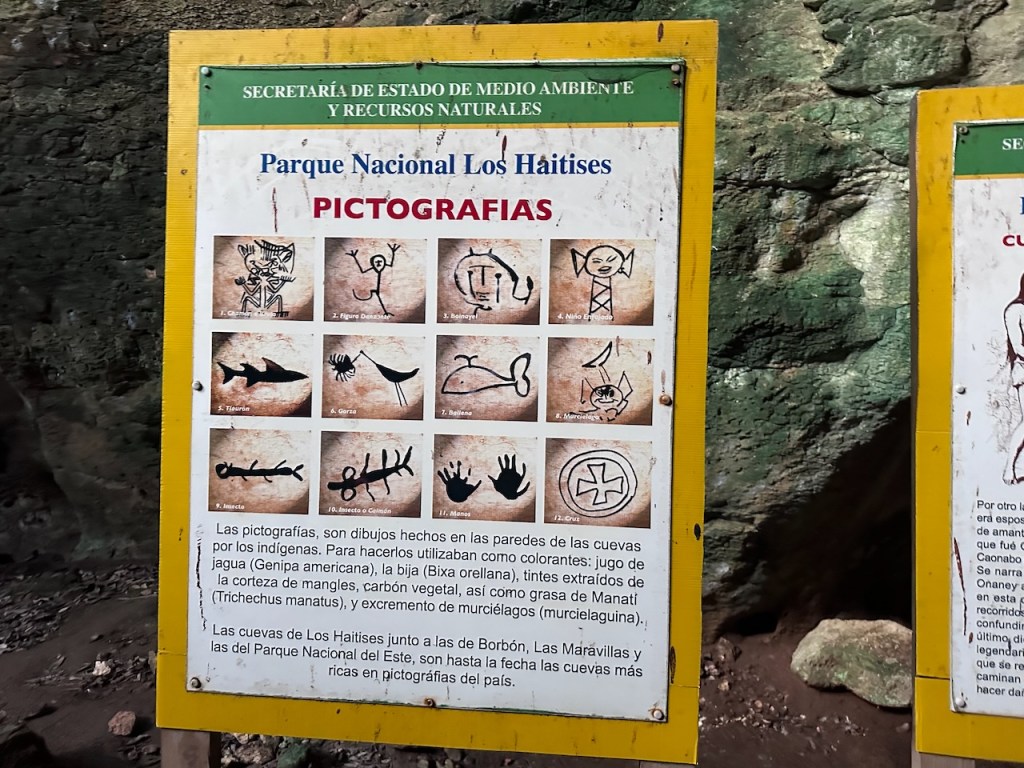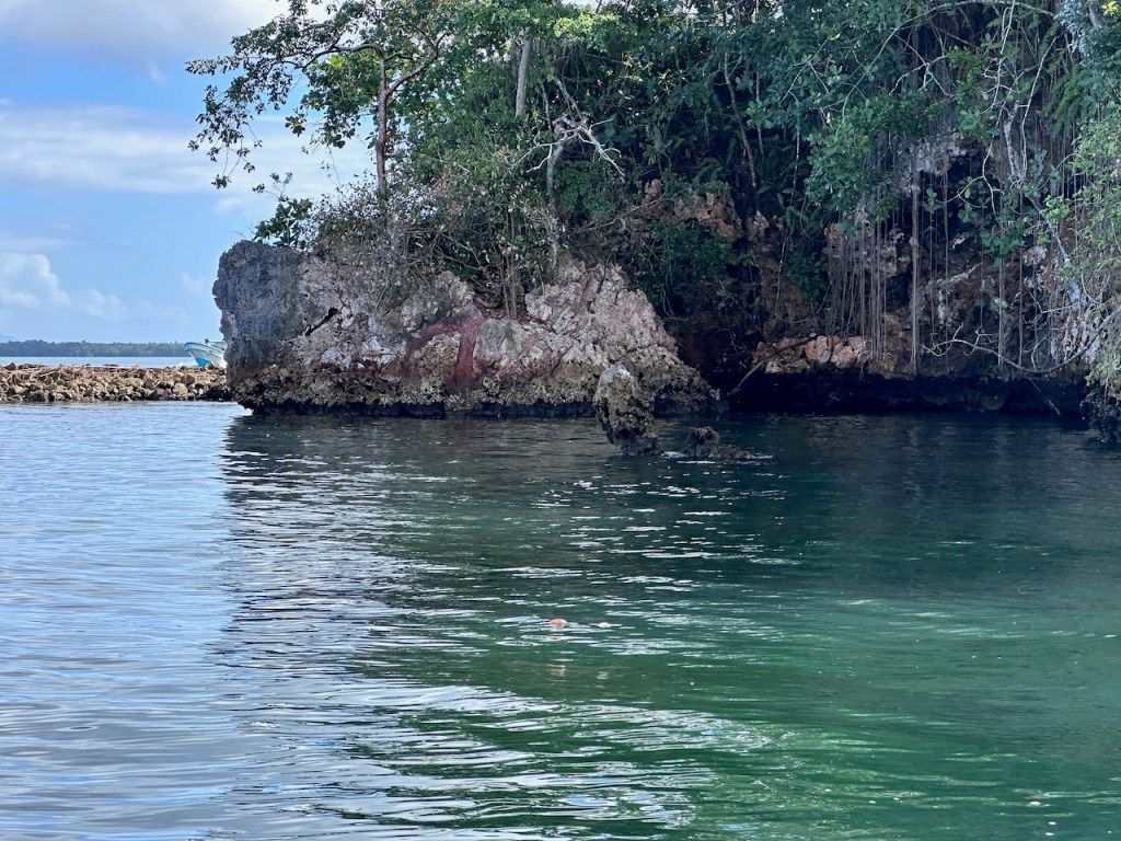 the other anchorage just closer to the caves and closer to small rocky isletswhile trying to find the entrance of the river to the cave we passed those clipsfinally we found the entrancethis tourist boat overtook us last minute before the dock area for the caveinside the cave, an opening which created a nice atmospheresome pictographs of the Tainoa close upjust in case someone is interested in the pictographs then we were heading to the next cave