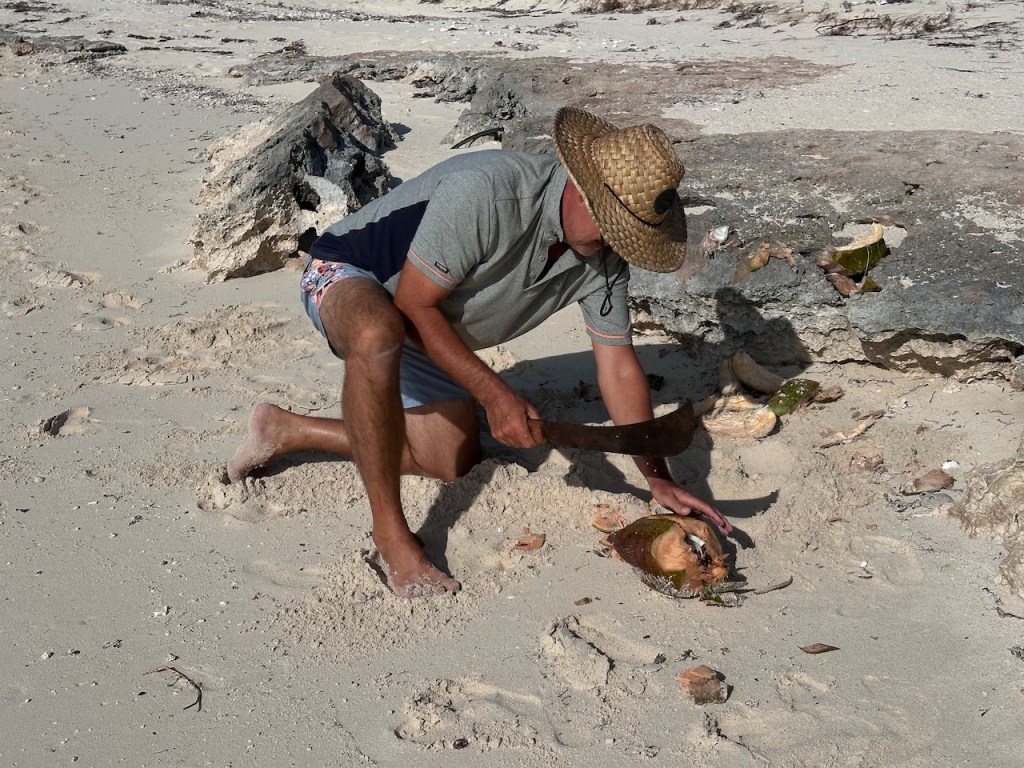 At Jamaica Cay somebody had apparently tried to start to built a resort years ago. The remaining buildings were still visible including two big 40 feet tank trailer which were unfortunately not yet overtaken by nature. A brownie point was the result of the resort-building-persons’ effort to plant coconut palm trees. There were plenty and they were full of green (hanging) coconuts and even more older ones on the floor. We do love coconut water! It’s delicious and healthy. Especially since we had already run out of most of our veggies and all of our fruits. Now we had another task to master and could play more Robinson. Well, don’t get too excited, even though that would have been awesome… but we did not manage to climb up the trees like skilled little monkeys, sorry. We did though leverage El Capitano’s height and picked the ones he could reach by hand or with a stick. Luckily there were enough nuts reachable that he could collect everyday as much to fill up a 1,5 l bottle with coconut water. Opening the green ones was not a problem for El Capitano anymore as he had done it many times before in the San Blas. Opening the older already brown ones was much harder. The outer shell gets soft and fibrous and is really difficult to get off the nut you actually want. Even the machete didn’t help much as it just bounced back. So far our best way was smashing the nuts against a hard surface with their head or butt until they start to open a little. Then we had to do a hard workout. Challenging our pecs by pulling off the hairy fibrous and very protecting cover. My workout teacher Ann would have been so proud of me!!! After a while, it really depended on the endurance of our muscles we got rewarded with the actual coconut🥥.