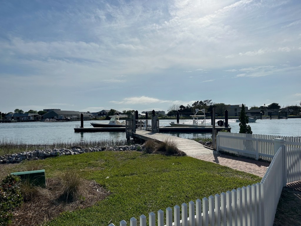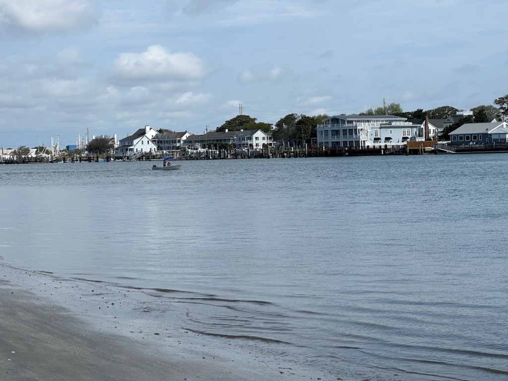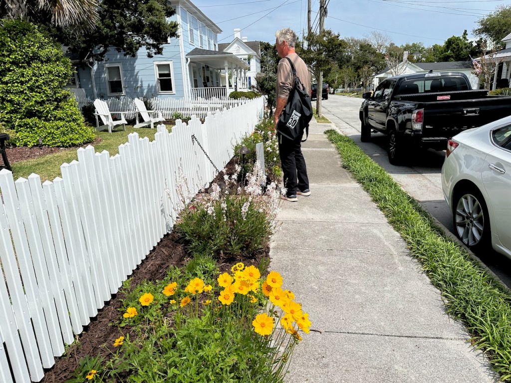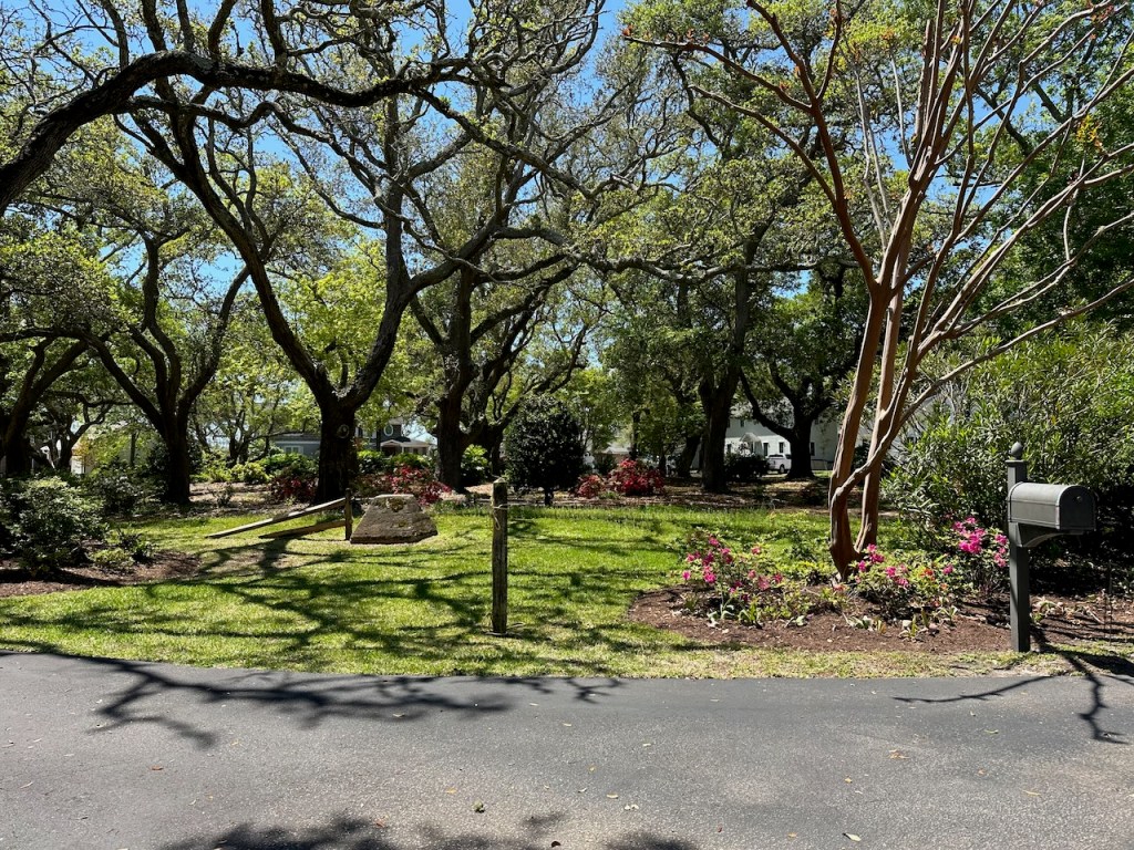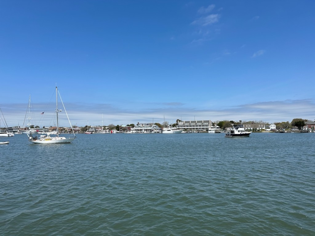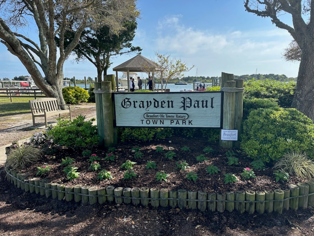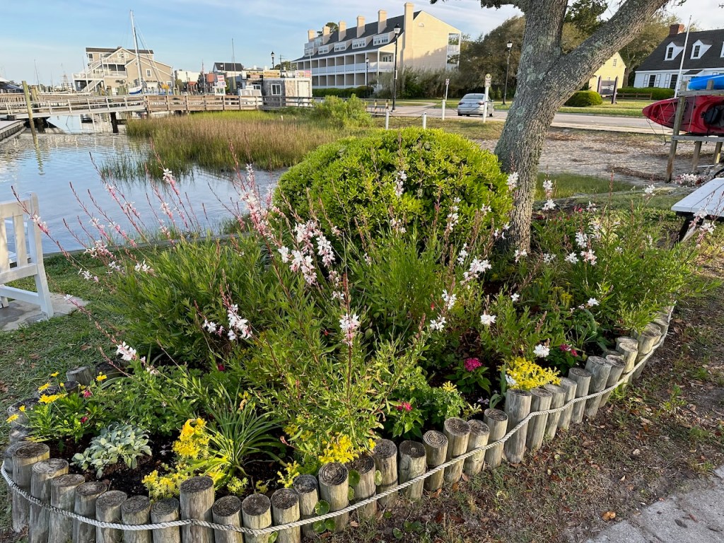 just before turning into Taylor creek where we anchored the wild horses of Carrot island were greeting usTaylor Creek and Front Street Beaufortour anchorage in Beaufortnext to the round roof was the free public dinghy dock, so very convenient ; Altimate is “on top ” of the three people in the back of the pic; so the commute to town was about a minutesomewhere along Front street it was so nice being strolling along the pretty waterfronteverywhere flowershuge housesmany private docks the northwest end of Front streetjust a pretty small garden in between houseshere we had our first beer and some tacos from the truck