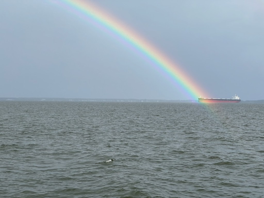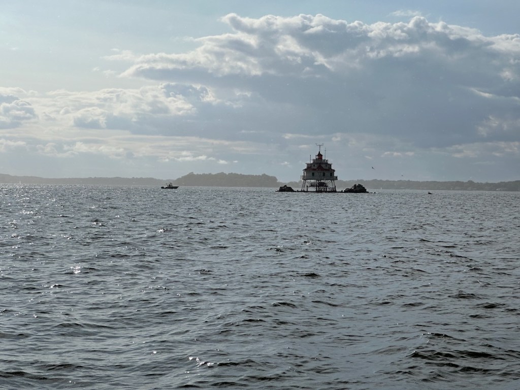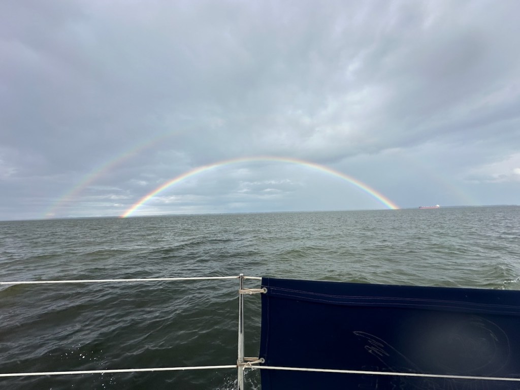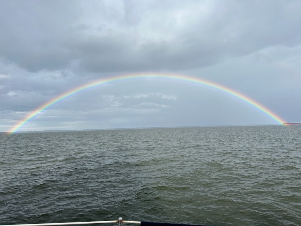 just outside of HamptonPoquoson, Chesapeake BayCape Charles, several ships were anchored in the roadstead and we were sailing in betweenWhite Stone, Little Bay our anchorage on the go again, Reedvillea lighthouse in the middle of Chesapeake Bay, Tangier, Saint Jerome Creek, Drayden, our anchorage for that daya beautiful calm place only the entrance was a challenge, very narrow and very shallowthe next day we had left the nice anchorage and soon the weather turned rather uglyit was cold!!!we passed Thomas Point Shoal Lighthouse we did not know that it is a National Historic Landmark in the Chesapeake Bay, built in 1875 and that it is the most recognized lighthouse in Maryland.the weather was terrible that day but the rainbow was incredible even a second rainbow appeared close to Annapolis we were greeted by sportive sailing fellowsAnnapolis Roads, Annapolis just before the bridge the mooring field before the bridge , we decided to take a mooring in the calmer area behind the bridgefinally our anchorage at Spa Creek