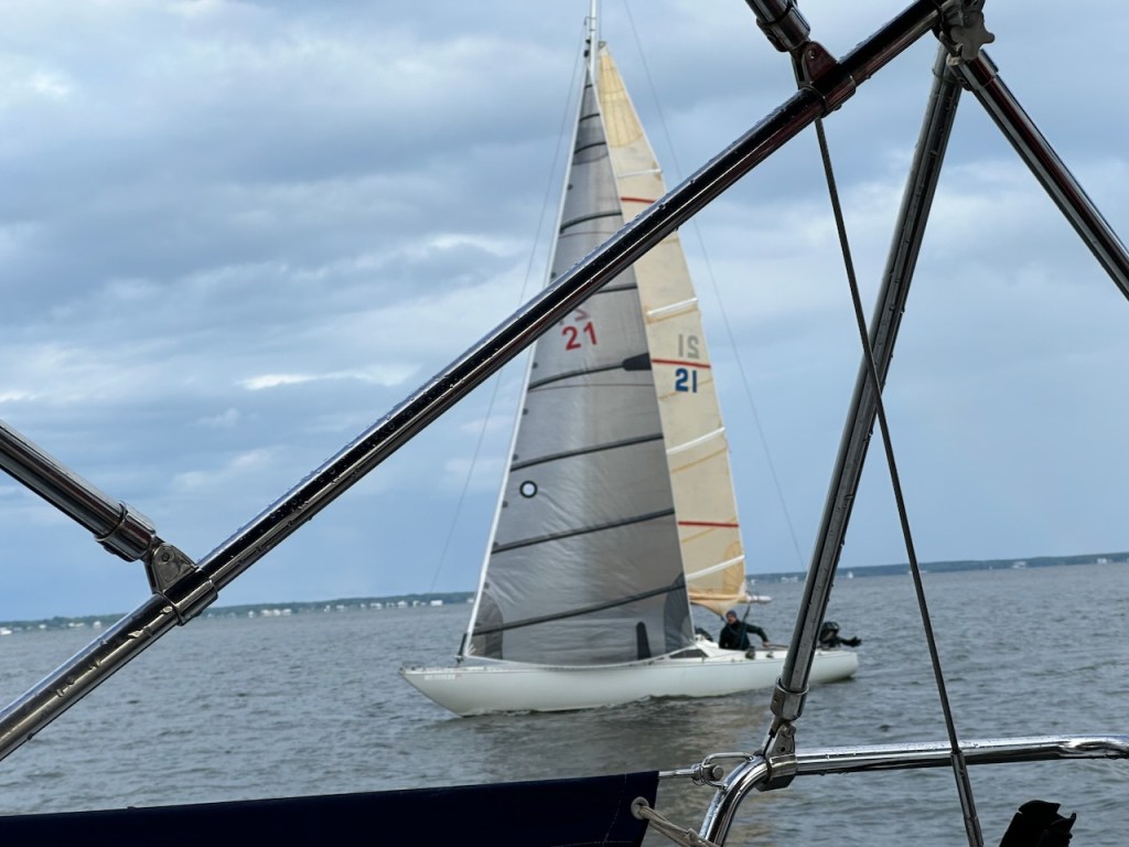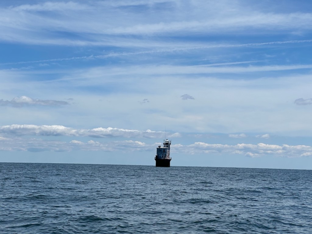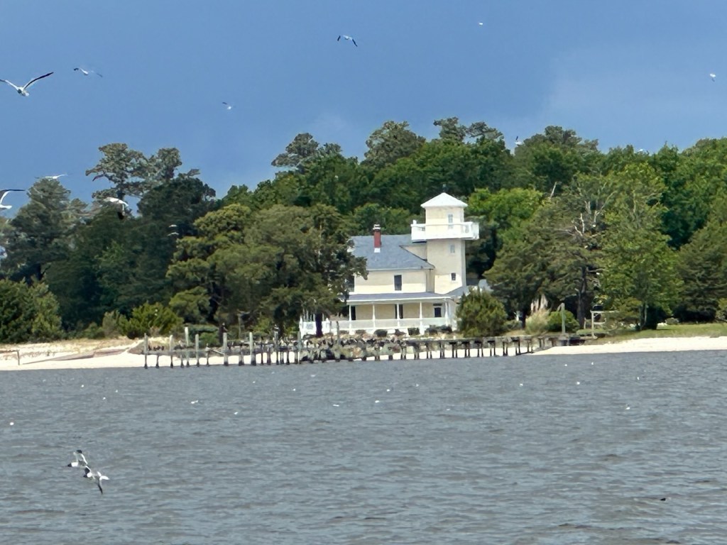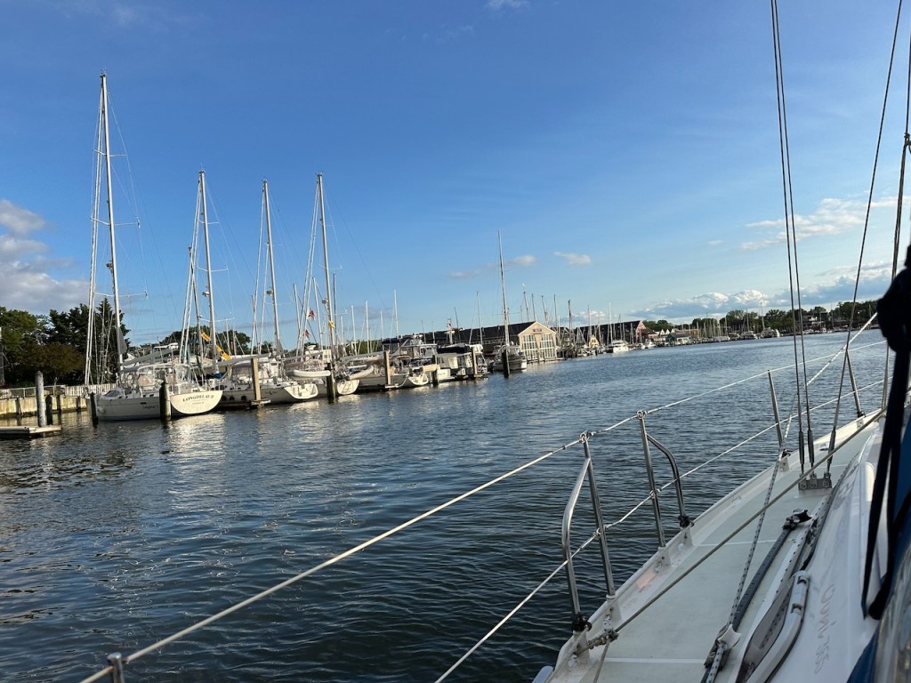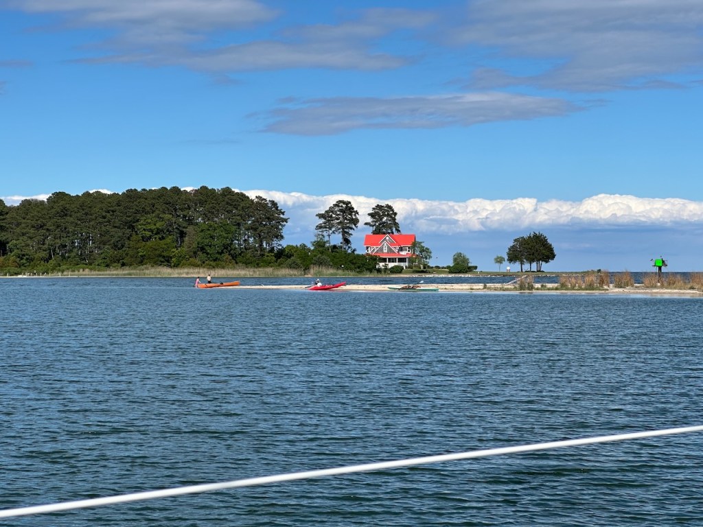 just outside of HamptonPoquoson, Chesapeake BayCape Charles, several ships were anchored in the roadstead and we were sailing in betweenWhite Stone, Little Bay our anchorage on the go again, Reedvillea lighthouse in the middle of Chesapeake Bay, Tangier, Saint Jerome Creek, Drayden, our anchorage for that daya beautiful calm place only the entrance was a challenge, very narrow and very shallowthe next day we had left the nice anchorage and soon the weather turned rather uglyit was cold!!!we passed Thomas Point Shoal Lighthouse we did not know that it is a National Historic Landmark in the Chesapeake Bay, built in 1875 and that it is the most recognized lighthouse in Maryland.the weather was terrible that day but the rainbow was incredible even a second rainbow appeared close to Annapolis we were greeted by sportive sailing fellowsAnnapolis Roads, Annapolis just before the bridge the mooring field before the bridge , we decided to take a mooring in the calmer area behind the bridgefinally our anchorage at Spa Creek