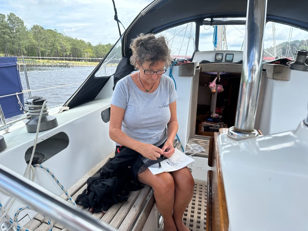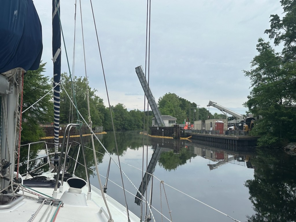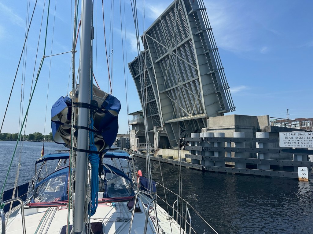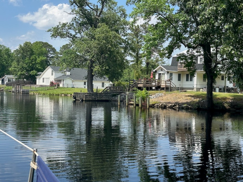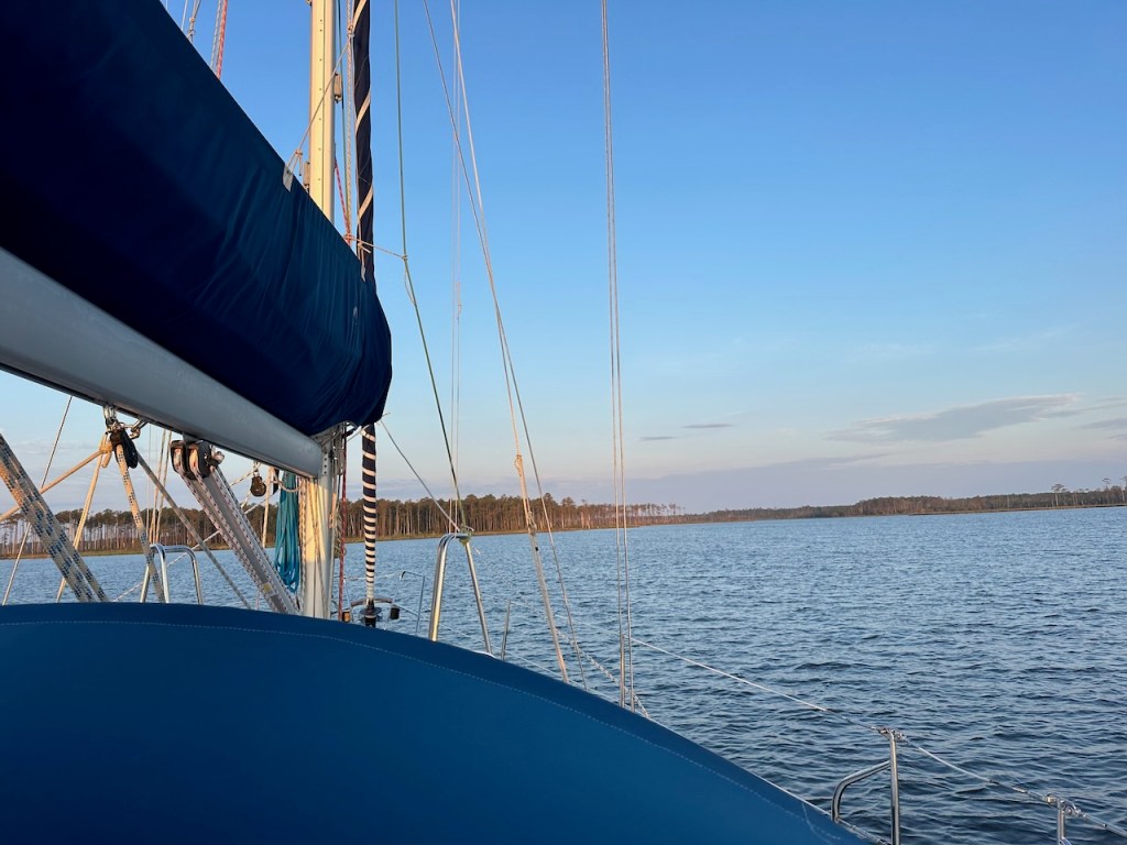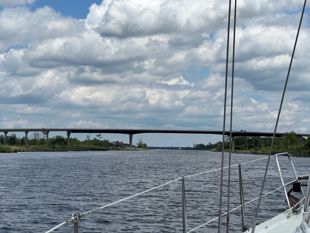 Goose Creek, early in the morning just after leaving the anchorage still in Goose CreekPungo Riverthe beginning of the Pungo River Alligator River canal, here for a change with two other sailing boatssome houses alongside the canal were quite impressivewe heard there might have been many noseeums/mosquitos going up the coast, so I used the time and sewed some mosquito netsthe scenery was very greenstill in the CanalAlligator Outer Banks, the swinging Lindsay C Warren(Alligator) Bridge, we anchored right after the bridge