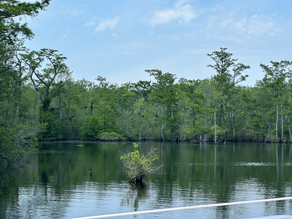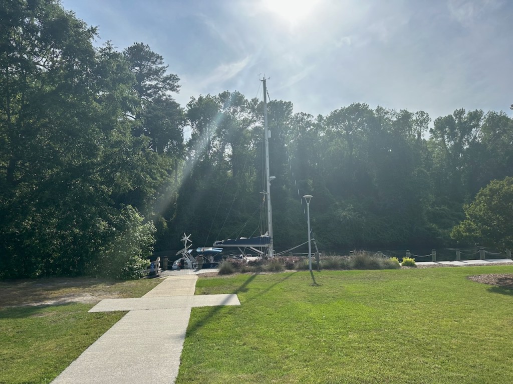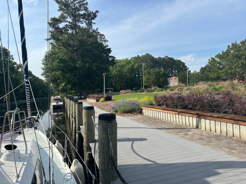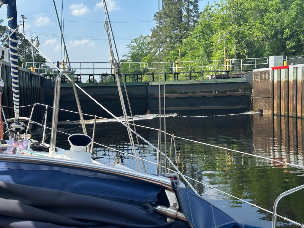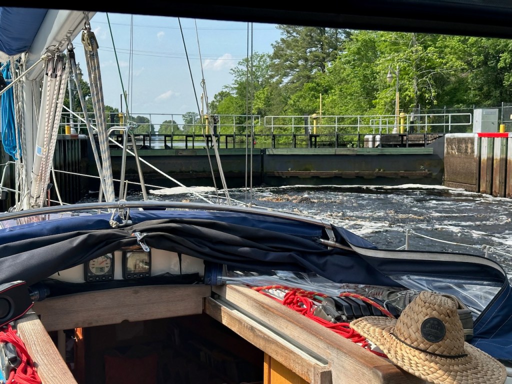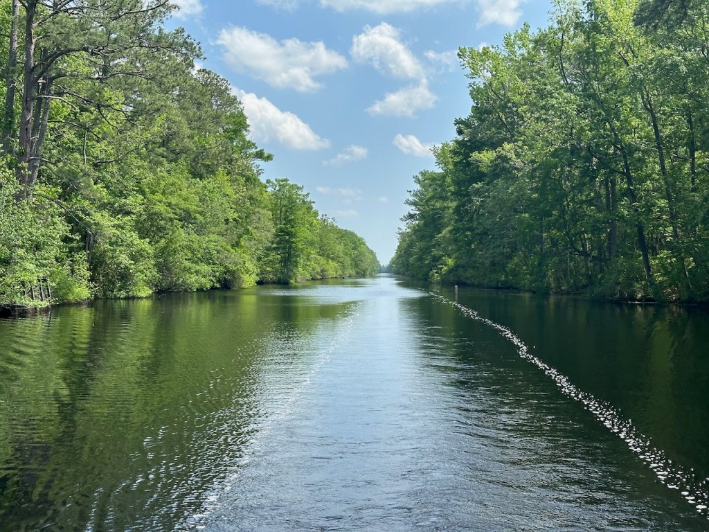 somewhere in the middle of the Albemarie Sound we passed a sunken sailboatPasquotank River, Elizabeth City, Outer Banks, here we passed a hangar for zeppelins , it was also the junction to the Dismal Swamp Canal instead of the other route through the Albermarle and Chesapeake CanalElizabeth CityPasquotank River, Shiloh, right in front of the opening bridge of Elizabeth Citywe just passed through the bridgewe followed the Pasquotank River until we reached the Dismal Swamp Canalthe river meandered through the swamplandhere we just entered the Dismal canal it was a straight long line to followsometimes we passed strange decorationand very seldom housesmost of the time it looked gorgeous like thatSouth Mills lock, we a little early and had to wait for the openingtwo small sailing boats joined us in the lockfirst time since more than 5 years that Altimate was lifted in a lockwater flowed strongly into the lockthe lock master had a chat with the captain behind usand back in the narrower getting canalthis heroin was following us for milesand finally we were docked at the welcome centre of the Dismal Swampthe rest stop
