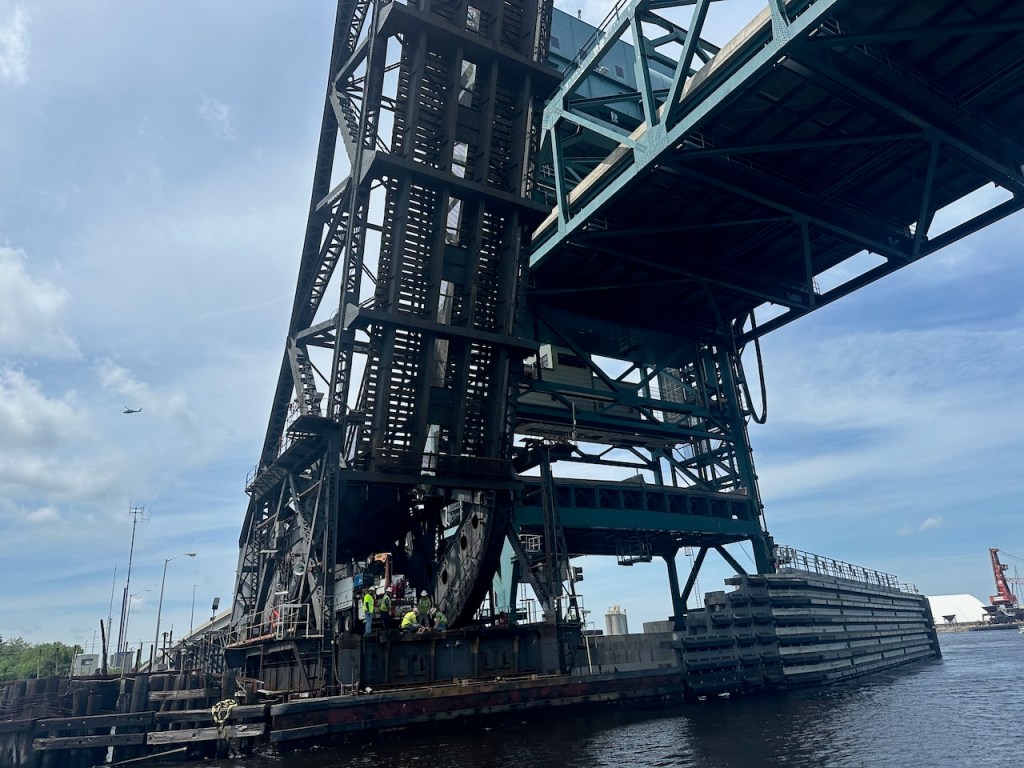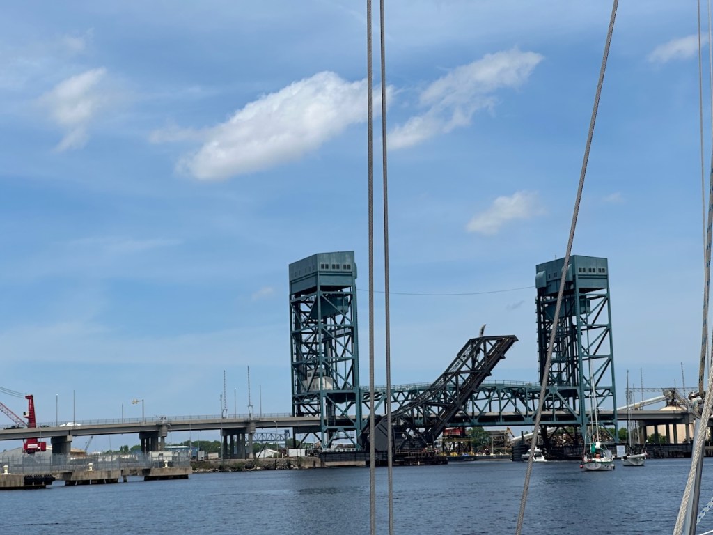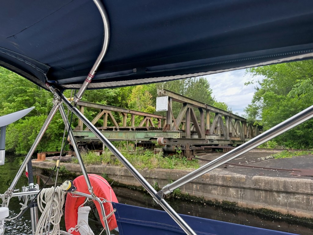 off we were to be in time for the next lock, on th right the small boat which shared the dock with us for the nightleaving North Carolina this railway did not look like it was still in usewe did not see any rampthe last bit of the canal soon reaching the lockthis was the norther opening bridge right before the northern lockDeep Creek lockSouthern Branch Elizabeth River, Chesapeake, we had left the beautiful swampland and were now in busy land; here we had just missed the opening of the bridge and had to wait for quite some time as it turned out that they had to do some maintenance fortunately it took only about an hour, then the bridge opened again, the bigger bridge was a lifting bridge, impressive!and more bridges to come the landscape swopped from green nature to colourful metalhere close to Norfolk war ships were built and then we made it to pretty Hamptonhere in Hampton we anchored in front of a little park