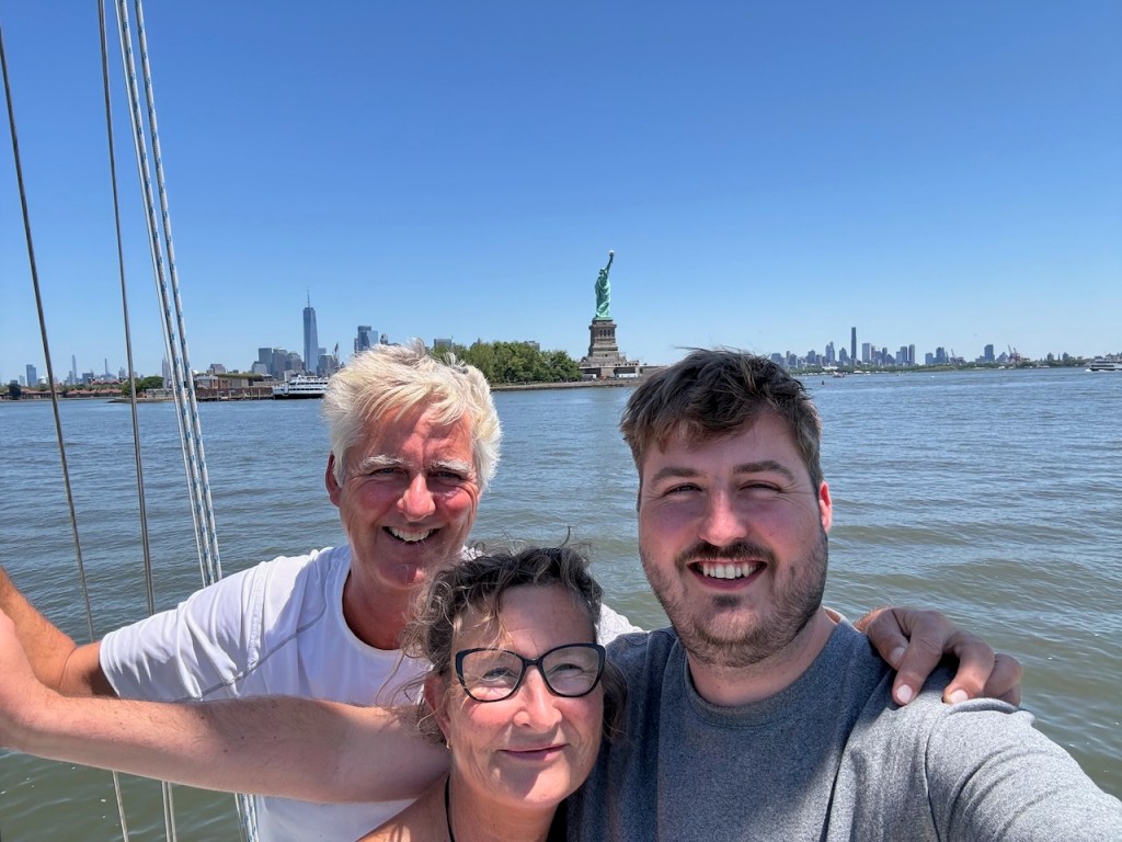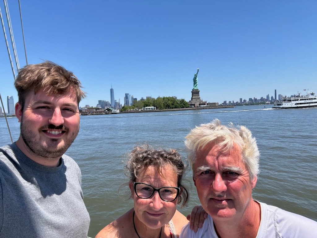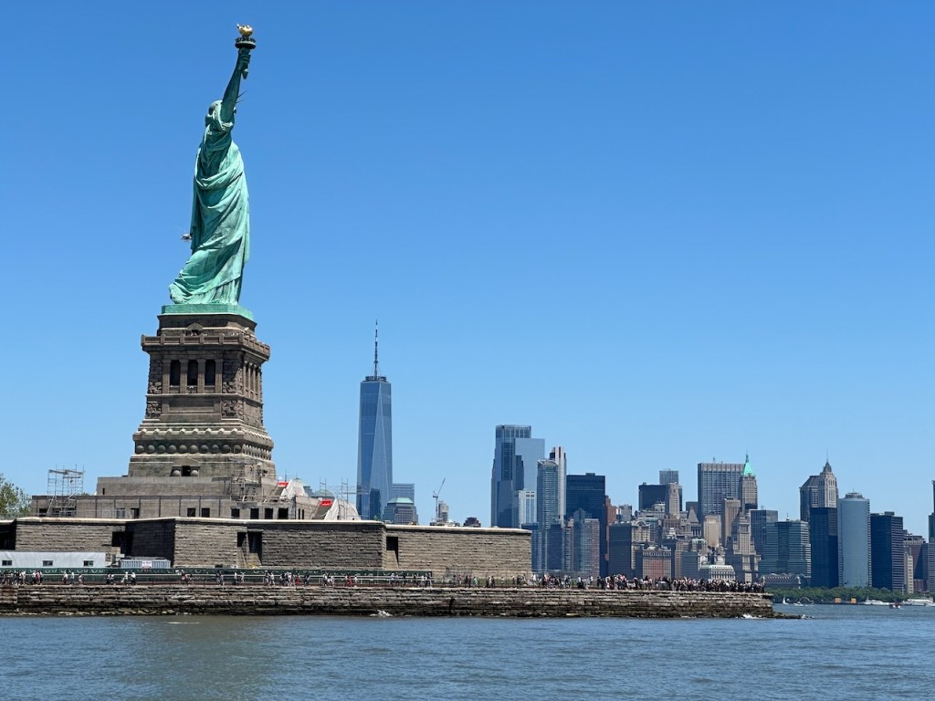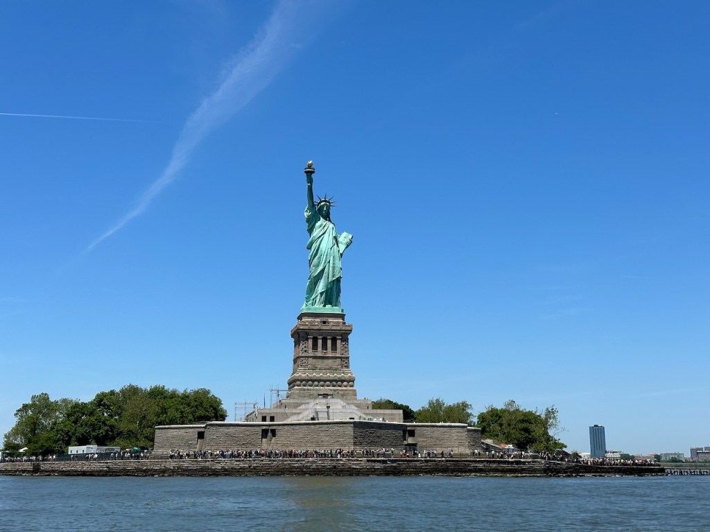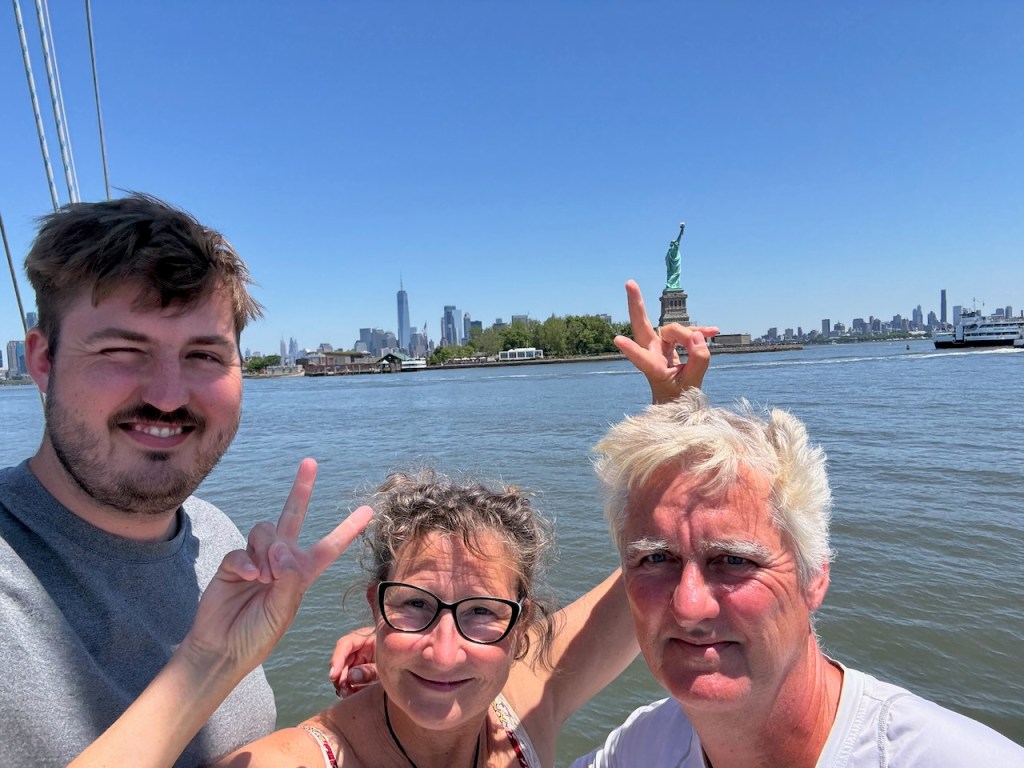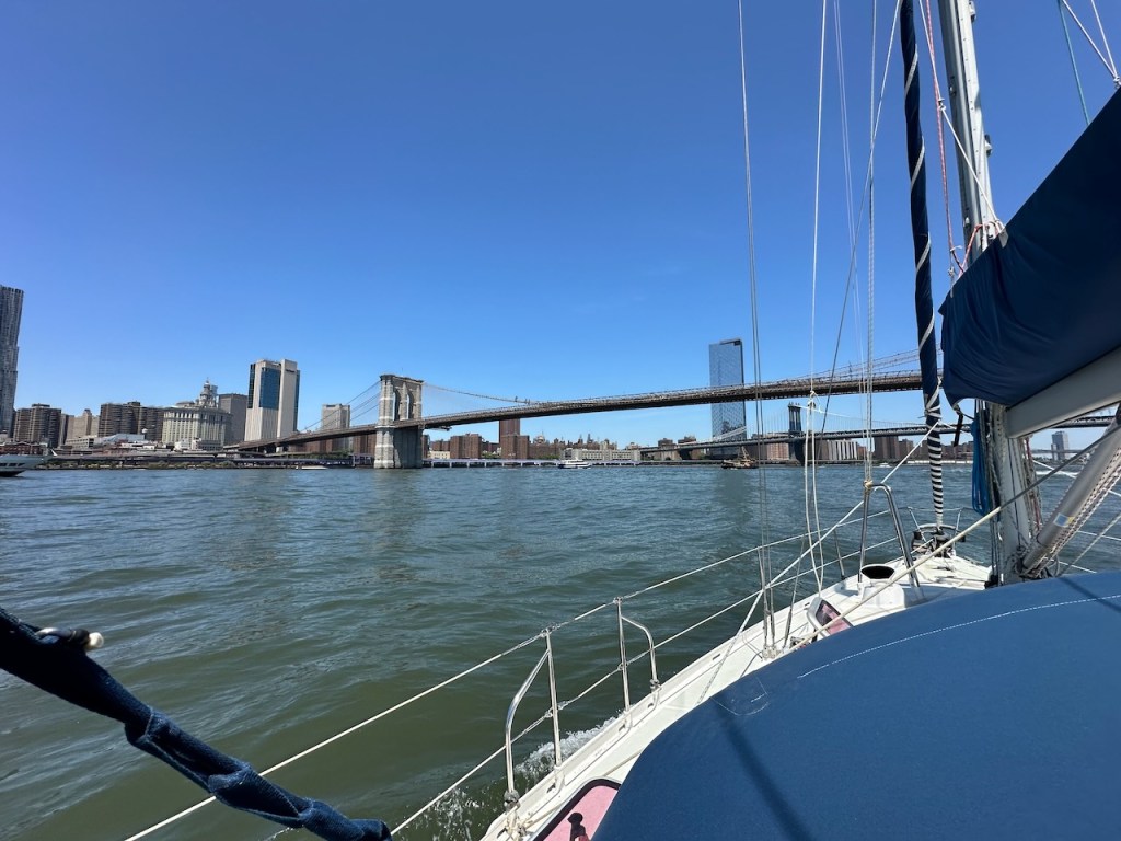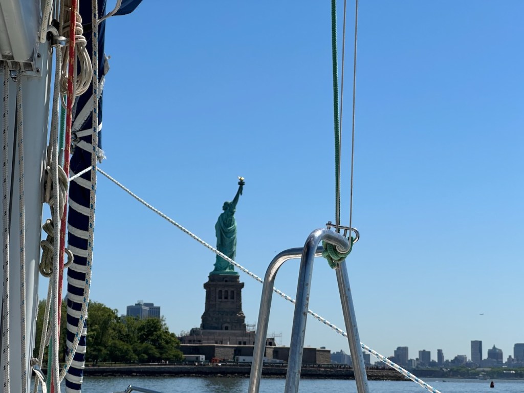 the first pic I took from the famous ladythe background is a bit crooked but we seemed to be straighten upwe were proud!!!the Liberty Lady in all its gloryleaving the Lady and jumping on the magic carpet of the East River passing Manhattan’s skylinereaching Brooklyn BridgeManhatten Bridgepassing Jane’s Carussel at Brooklyn’s East river sideWilliamsburg Bridge and the Domino Sugar building The Empire State Building peeking through the building in front – I don’t know the name of that onevery friendly town