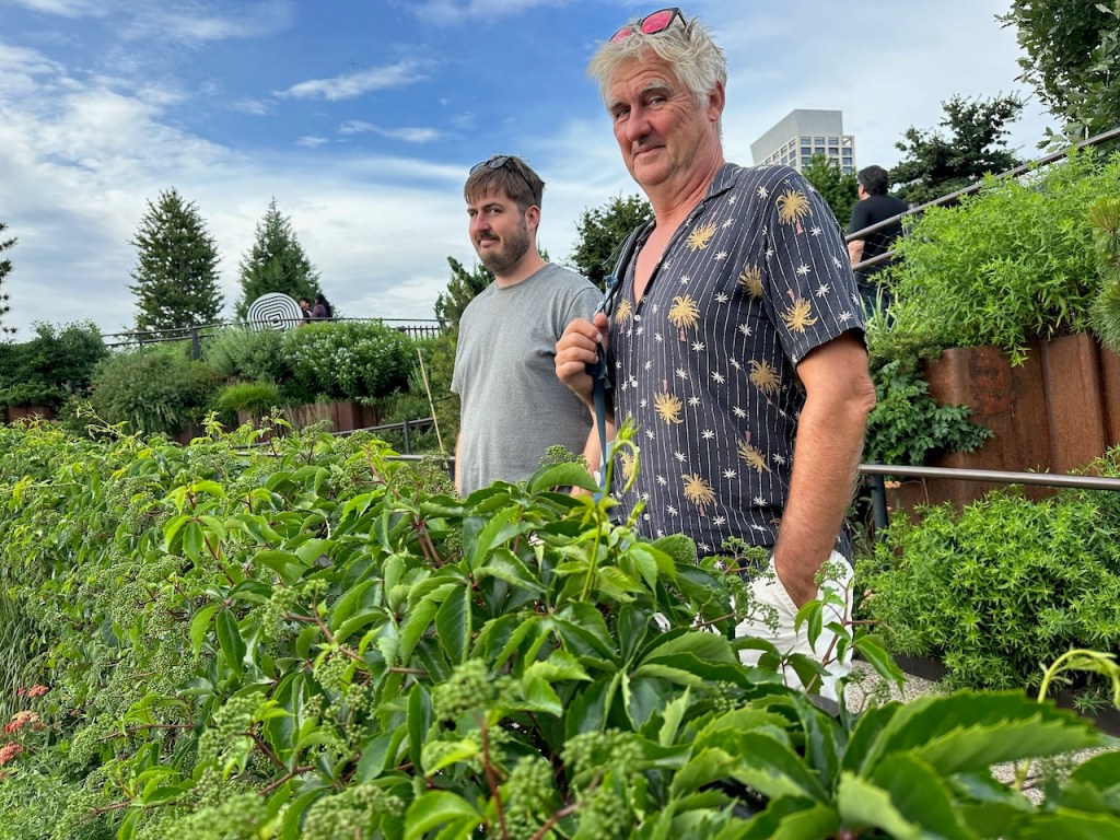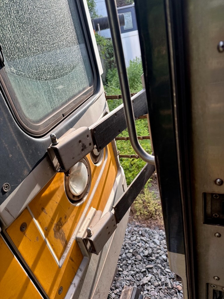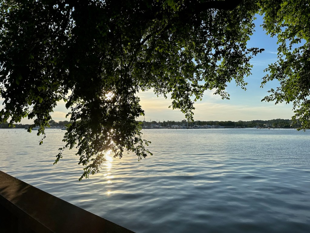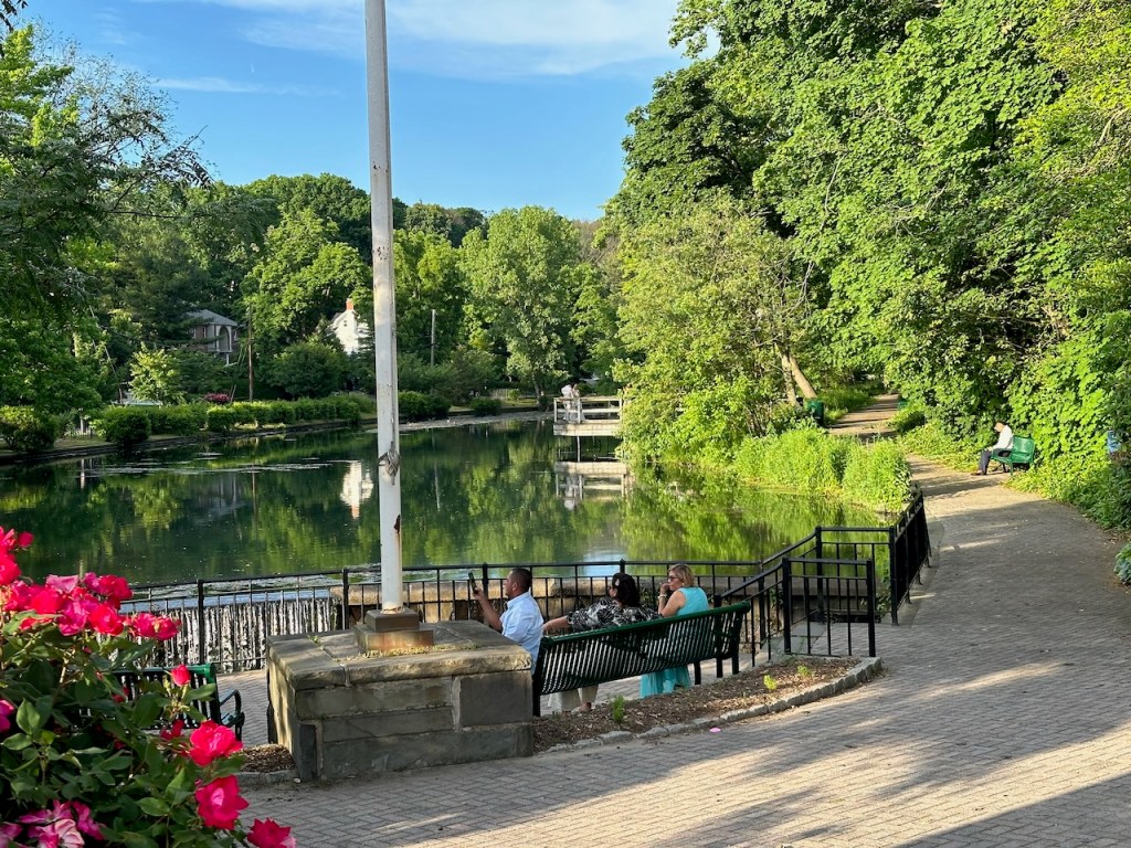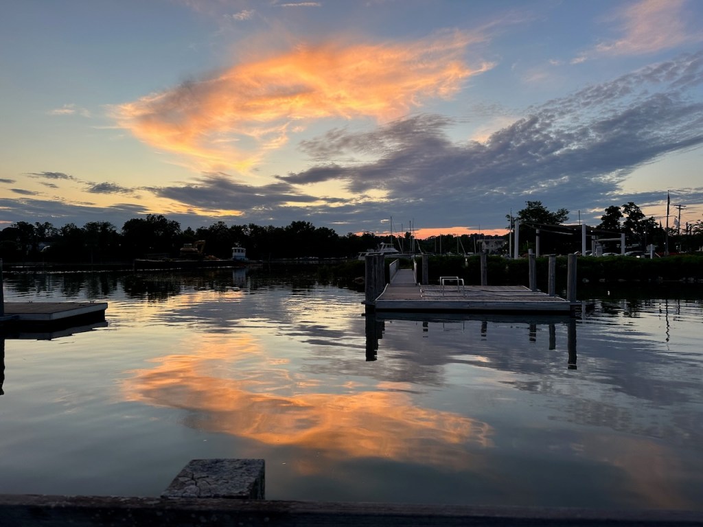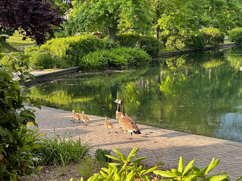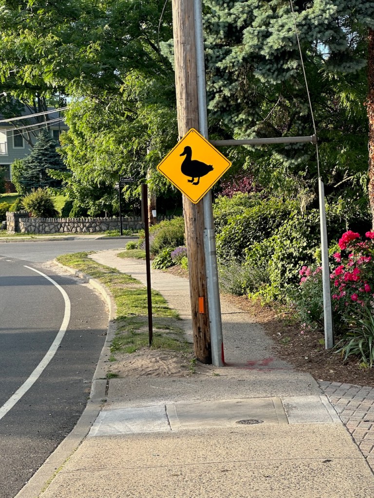 planting at the former freight rail hard to believe that these were railsmore High Line artin the trainon our way back to PW we switched wagons while driving , it was a bit scary as the wagons were not completely attached – we felt like being in a movie🤣back in PW, the town had funny road signsBaxter Pond Park in PWa goose family with its goslings – so cutepretty gardensa dreamlike sunset and its mirroring at the “Stop and Shop” (grocery) dock in PW