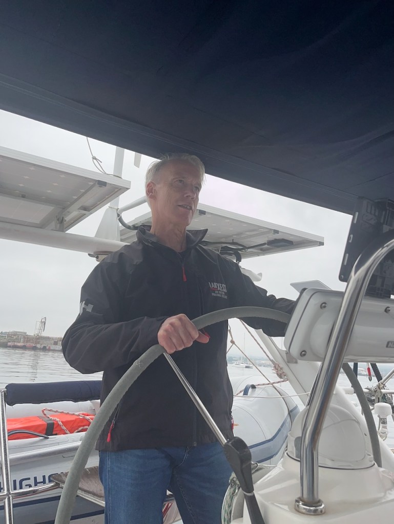 approaching Altimate- my viewapproaching Altimate from the dinghy viewStephan enjoying being at the helm and me enjoying just watching Anja dressed warmly but she felt good!!!somehow El capitano looked a bit weird Stephan serious controlling Altimate